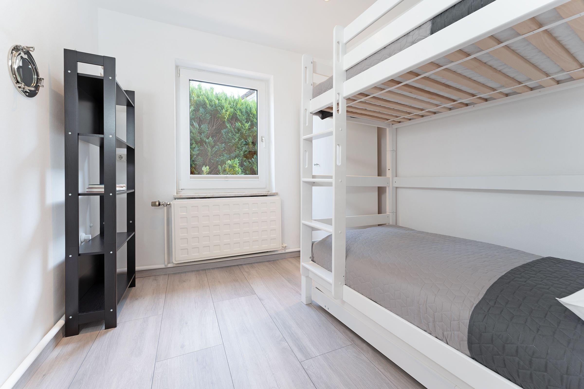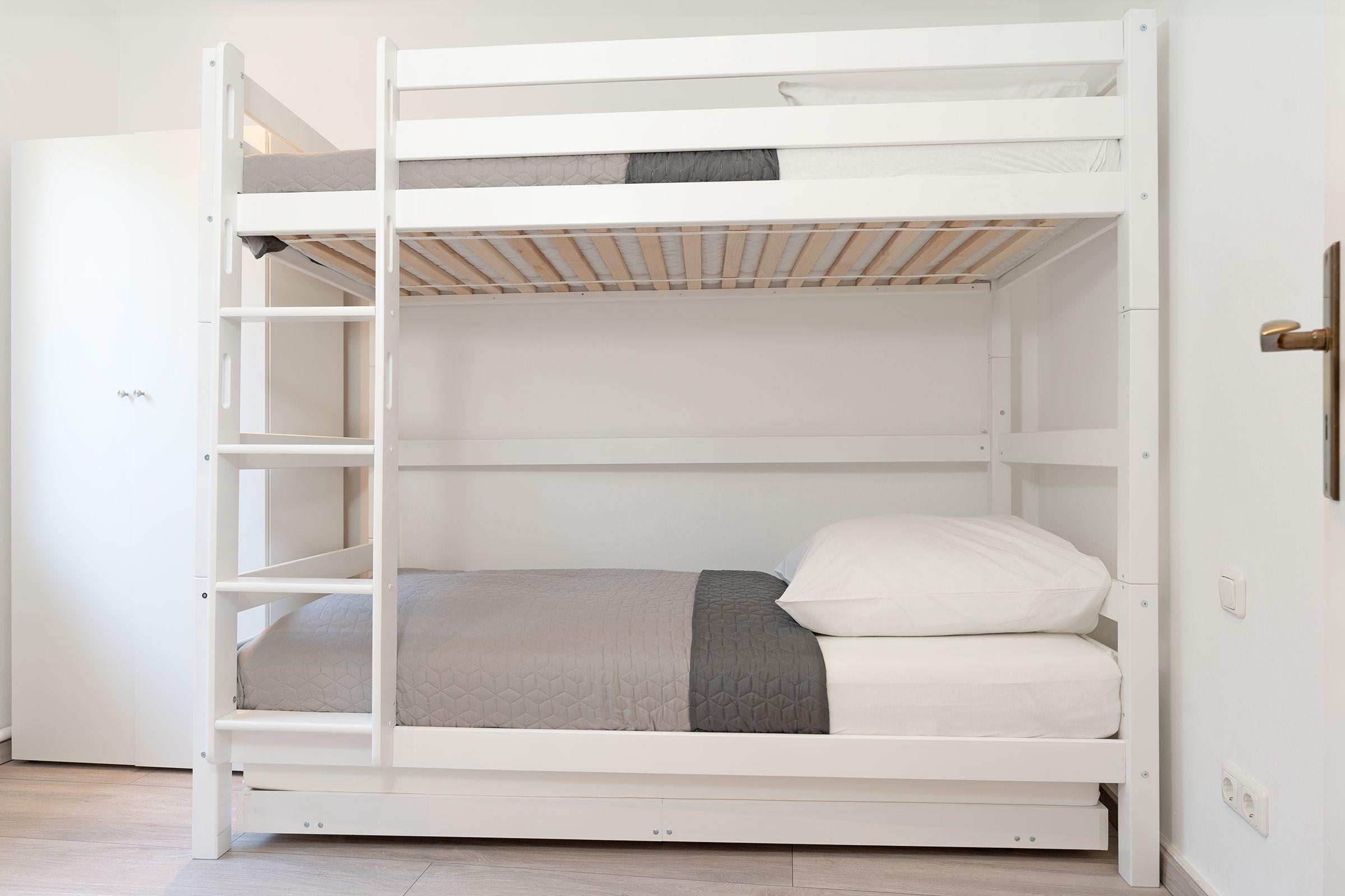Schlafzimmer 2: 1 Etagenbett mit Ausziehbett (3 x 90x200 cm), Kleiderschrank, Verdunkelung: Plissee, Platz für Babybett vorhanden