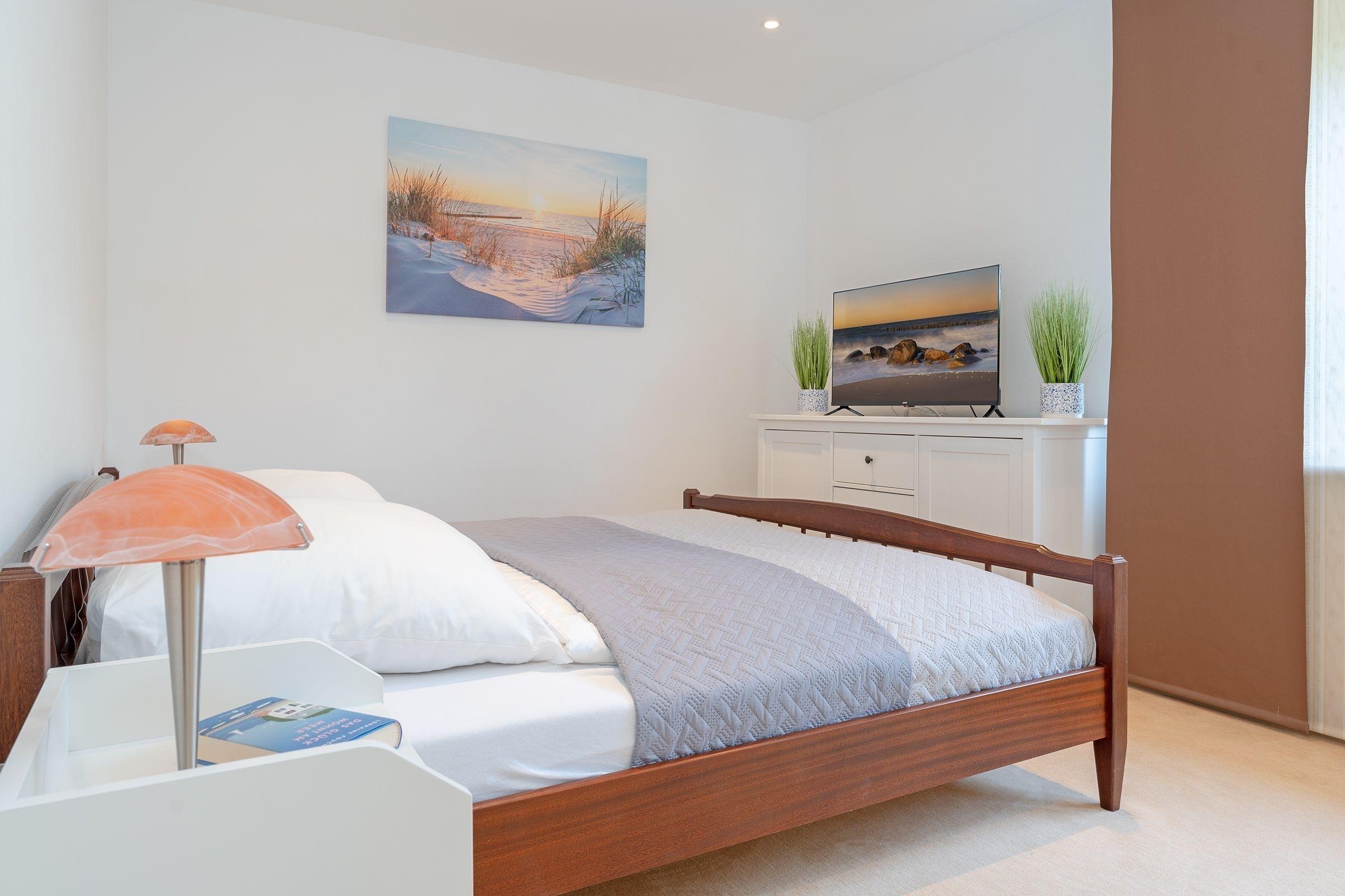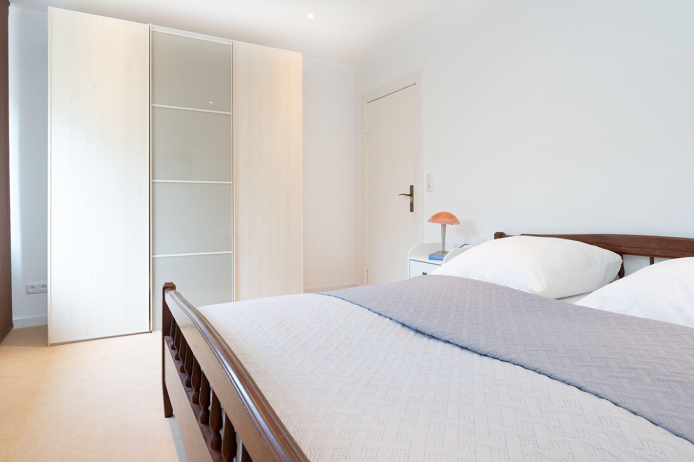 Schlafzimmer 1: 1 Doppelbett (180x200 cm), Kleiderschrank, TV, Verdunkelung: Plissee, Platz für Babybett vorhanden