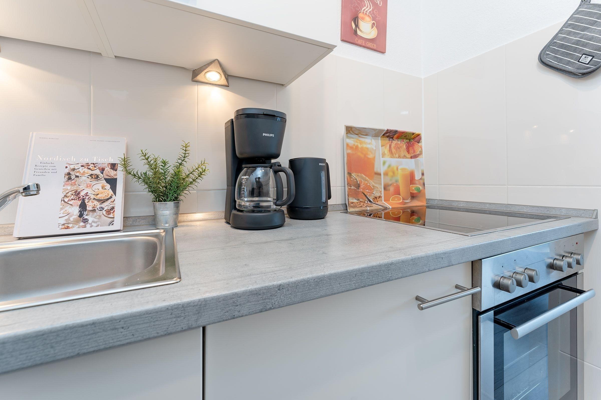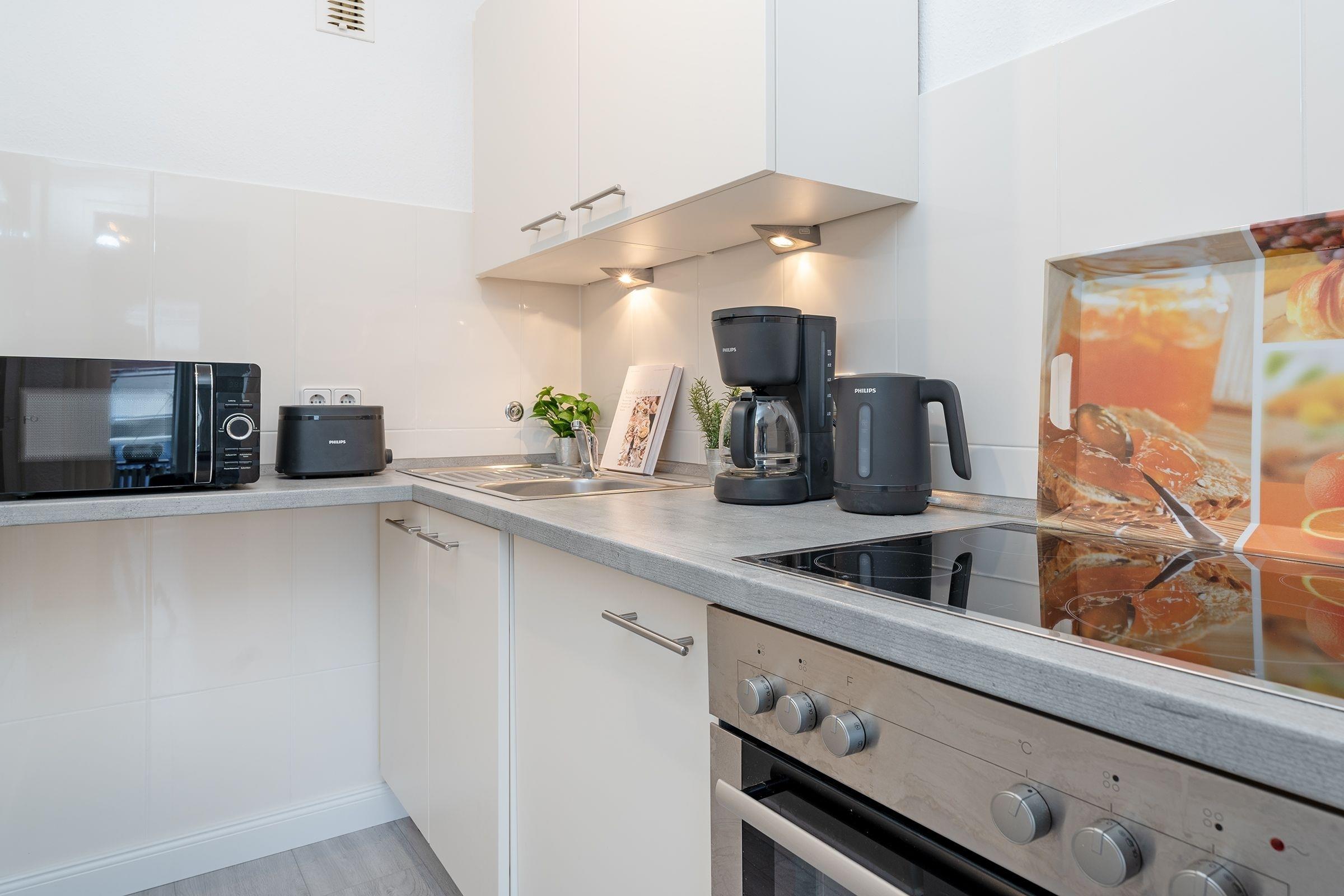 Diese geschmackvoll eingerichtete Ferienwohnung bietet Ihnen einen entspannten Urlaub an der wunderschönen Ostseeküste. Es empfängt Sie ein gemütlicher Wohnbereich mit einer Schlafcouch (160x200 cm). Die großen Fenster sorgen für viel Licht und der angrenzende Balkon lädt zum Verweilen im Freien ein. In der Küche mit einer umfangreichen Ausstattung können Sie kulinarische Highlights zaubern. Der Essbereich bietet Platz für die ganze Familie. Das separate Schlafzimmer verfügt über ein komfortables Boxspring-Doppelbett (180x200 cm). Das moderne Tageslichtbad mit Badewanne sorgt für einen gelungenen Start in den Tag.