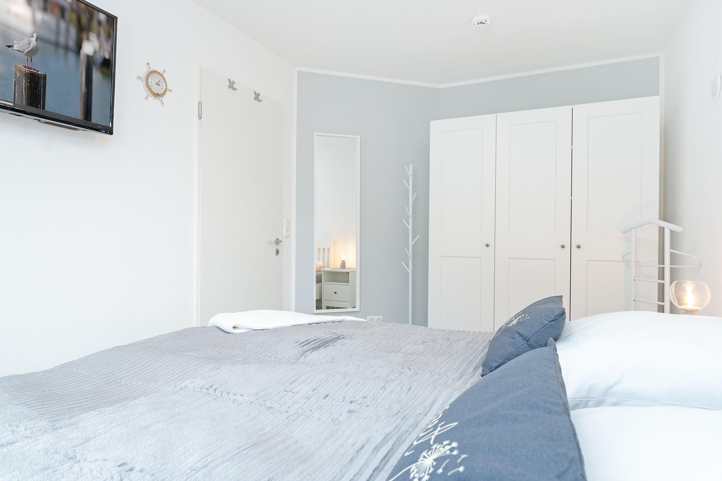 Schlafzimmer: 1 Doppelbett (2x 90x200 cm), Kleiderschrank, TV, Verdunkelung: Verdunkelungsrollo und -gardinen, Platz für ein Babybett vorhanden