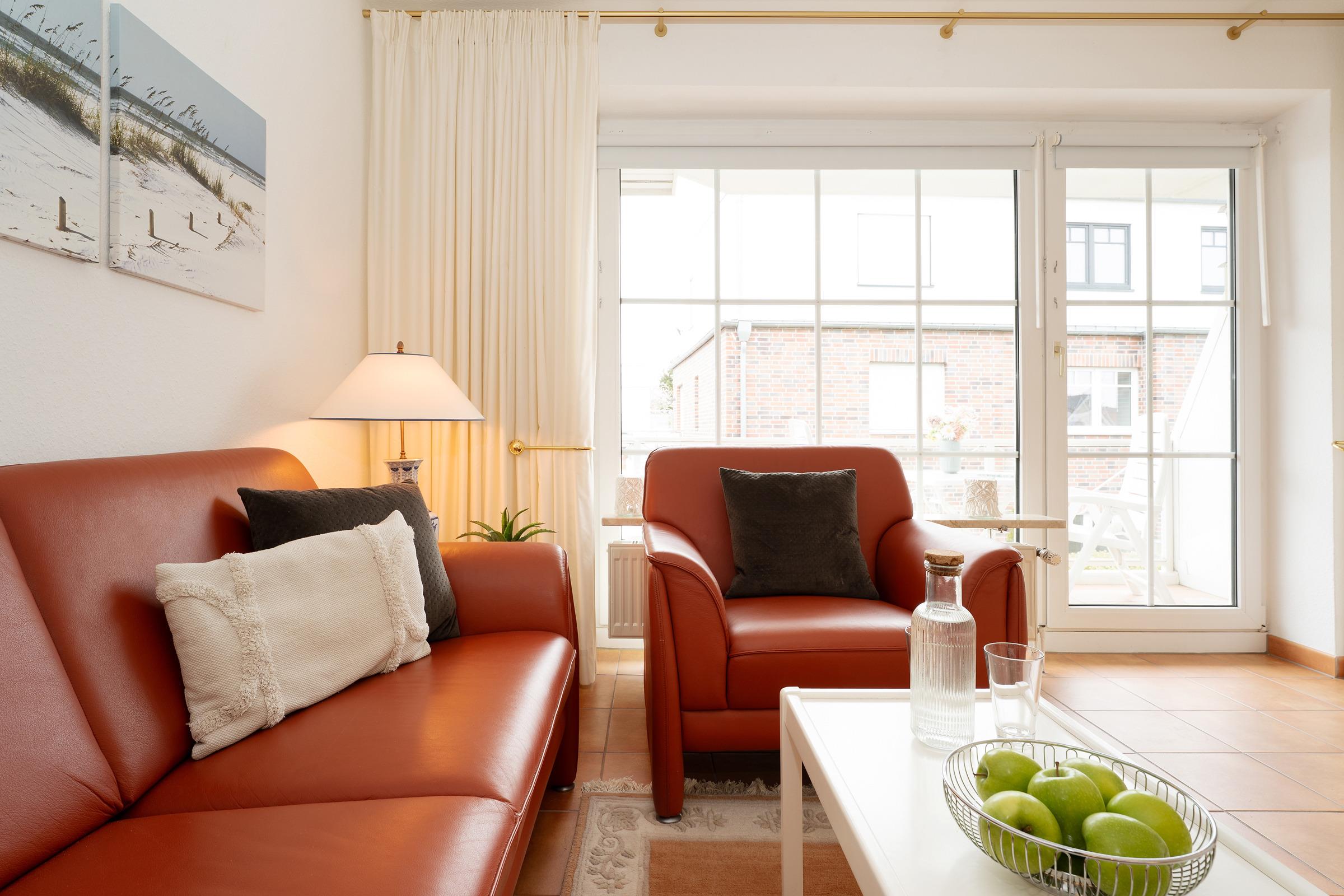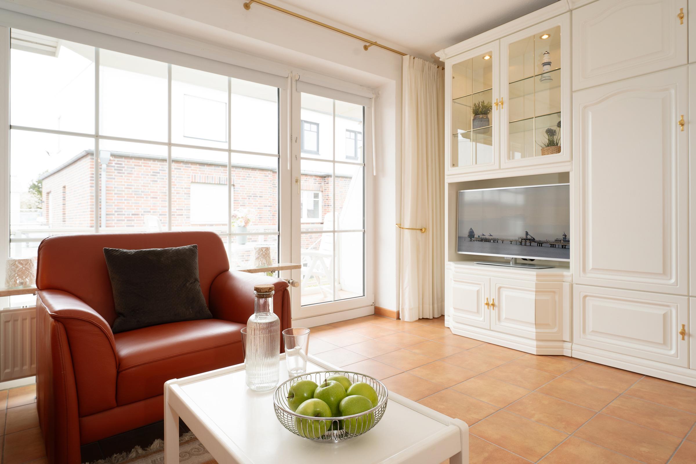 Der lichtdurchflutete Wohn- und Schlafbereich ist durchdacht gestaltet: Tagsüber genießen Sie entspannte Stunden auf den bequemen Sofas, abends verwandelt sich das komfortable Schrankbett (2x 90x200 cm) in eine erholsame Schlafstätte. Ein TV sorgt für Unterhaltung, während der offene Küchenbereich mit Essplatz zum gemeinsamen Genießen einlädt.