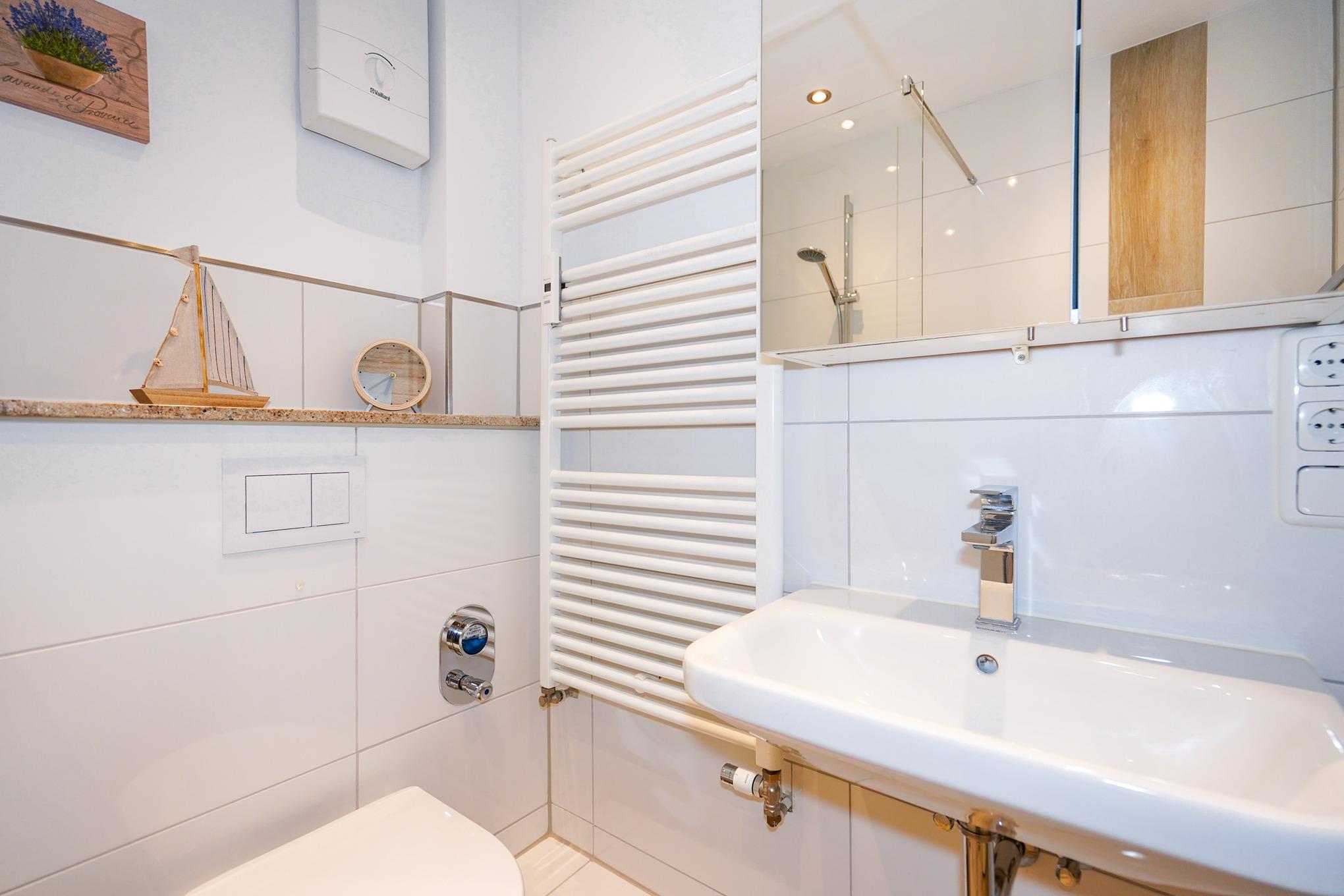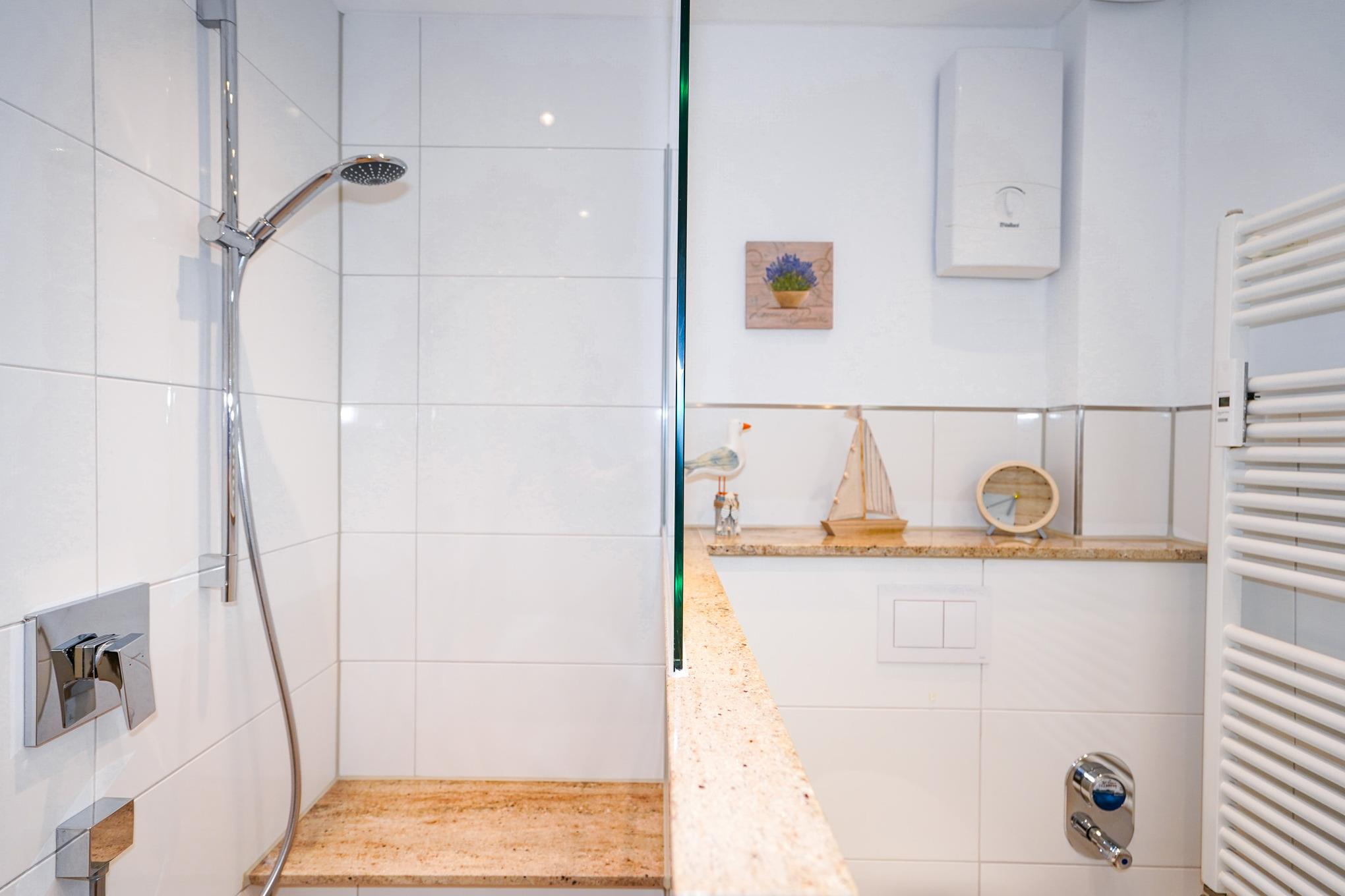 Das vollständig erneuerte Badezimmer wartet mit einer bodengleichen Dusche mit gefliester Sitzbank, einem Handtuchheizkörper sowie Waschbecken und WC auf Sie. Hier wird die Morgentoilette zum Vergnügen.