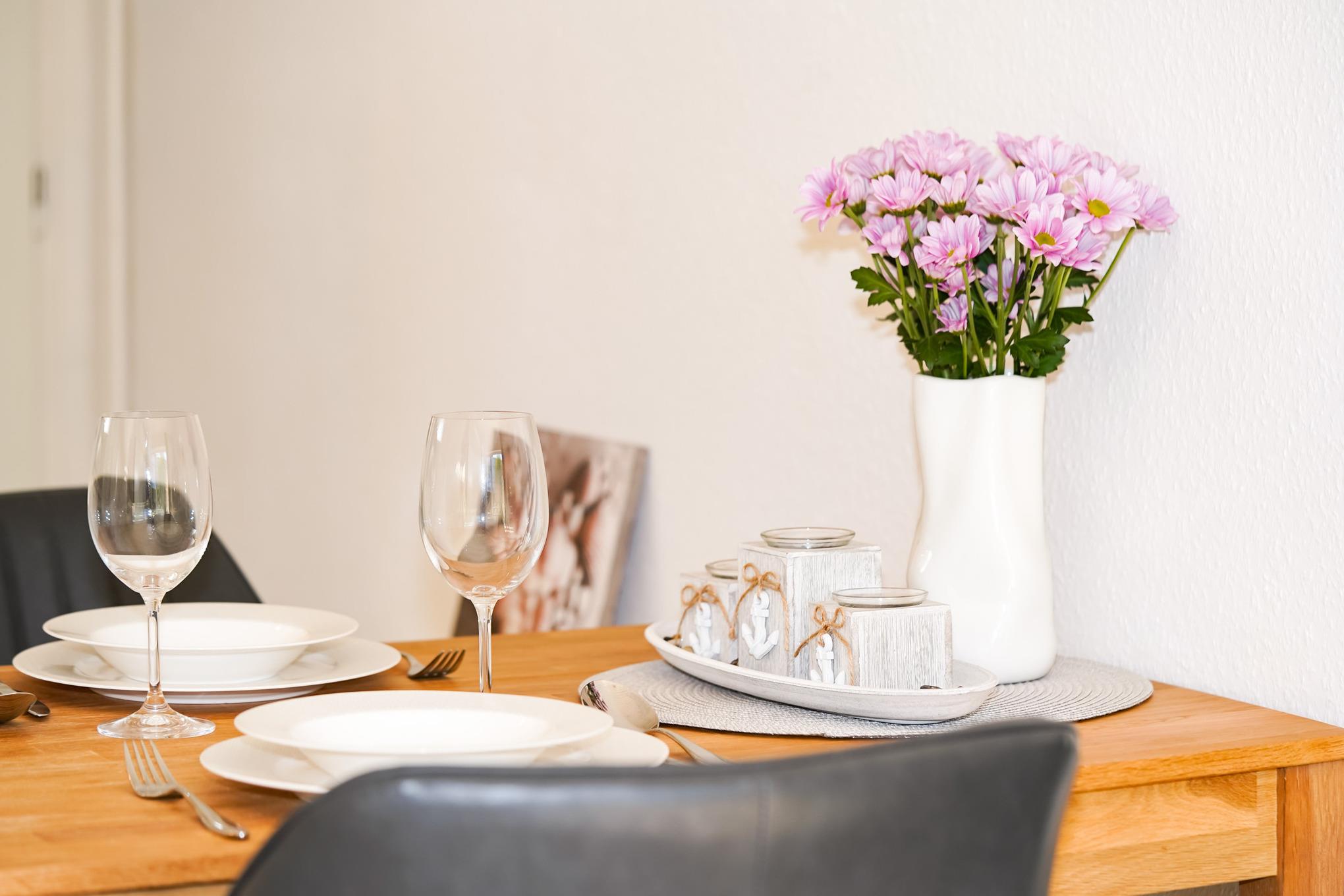 Zum Speisen, setzen Sie sich an den angrenzenden Esstisch, der für 2 Personen ausreichend Platz bietet. Oder Sie nehmen Ihren Kaffee direkt mit auf die angrenzende Terrasse, auf der Sie vom Mittag bis in den Abend hinein die Sonne genießen können. Als Schutz vor zu viel Sonne können Sie eine Markise ausfahren.