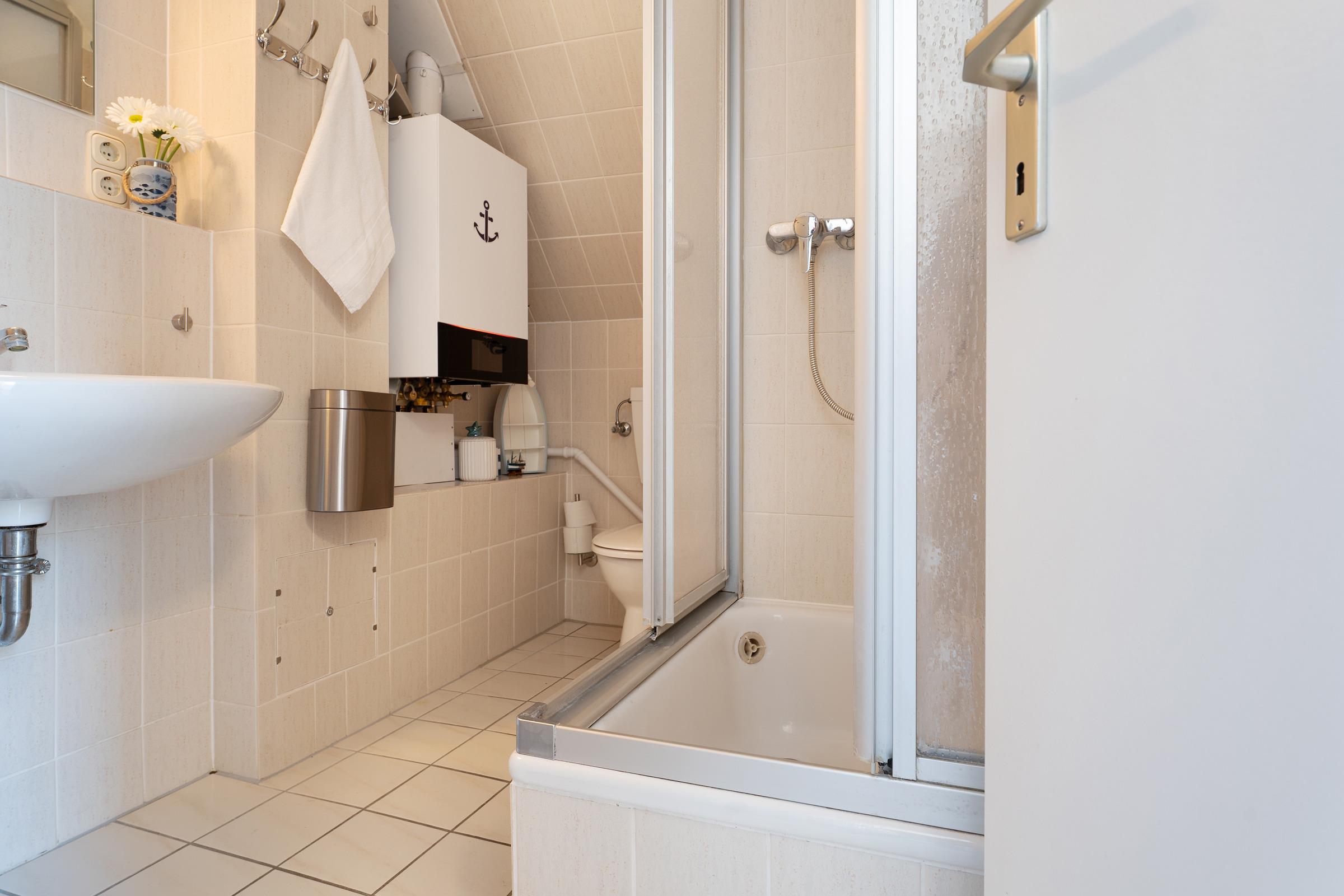 Im hell gefliesten Badezimmer starten Sie erfrischt in Ihren Urlaubstag.