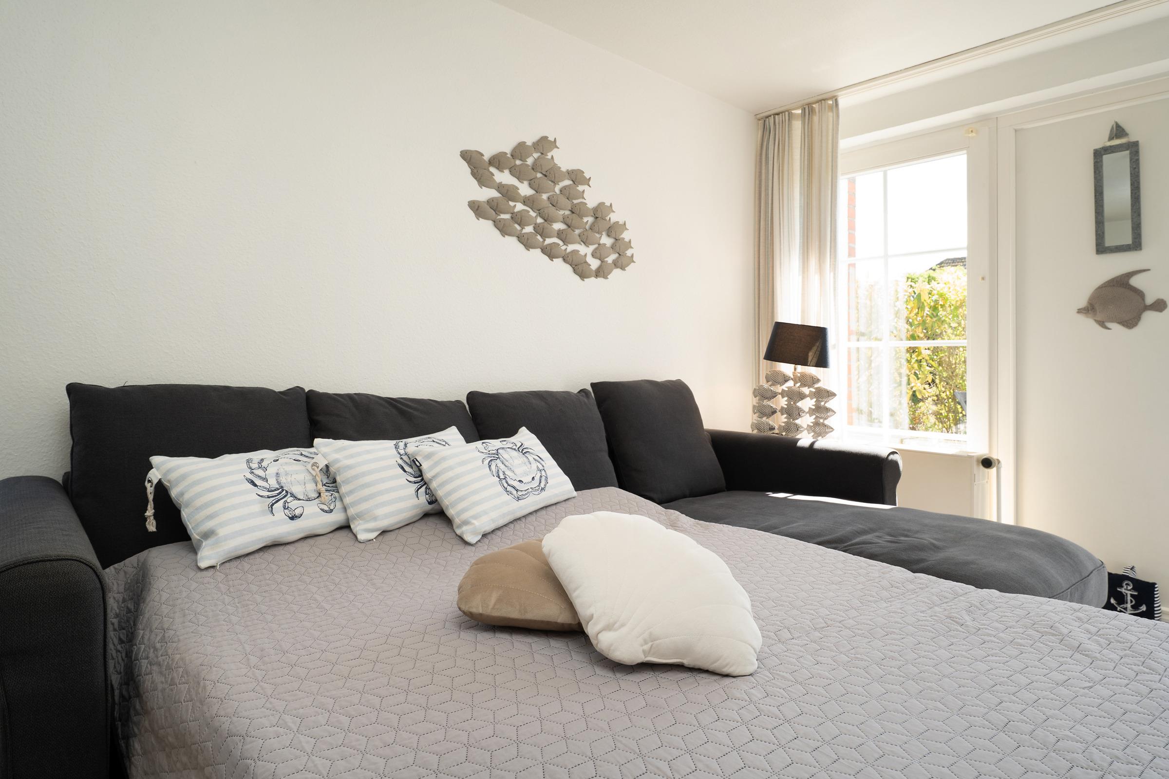 Die Ferienwohnung verfügt über zwei Schlafzimmer mit insgesamt vier Schlafmöglichkeiten. Im ersten Schlafzimmer mit Kleiderschrank erwartet Sie ein bequemes Doppelbett (ca. 2x 90x200 cm). Das 2. Schlafzimmer im 2. Obergeschoss erreichen Sie über eine Raumspartreppe, die durch ein Treppengitter gesichert ist (bitte Kinder bei der Treppennutzung beaufsichtigen). Hier schlafen Sie in zwei gemütlichen Einzelbetten (je ca. 80x200 cm). Ein 5. Reisegast kann sein Nachtlager auf dem komfortablen Schlafsofa (ca. 140x200 cm) im Wohnzimmer aufschlagen. Ein Babybett ist hier inklusive.