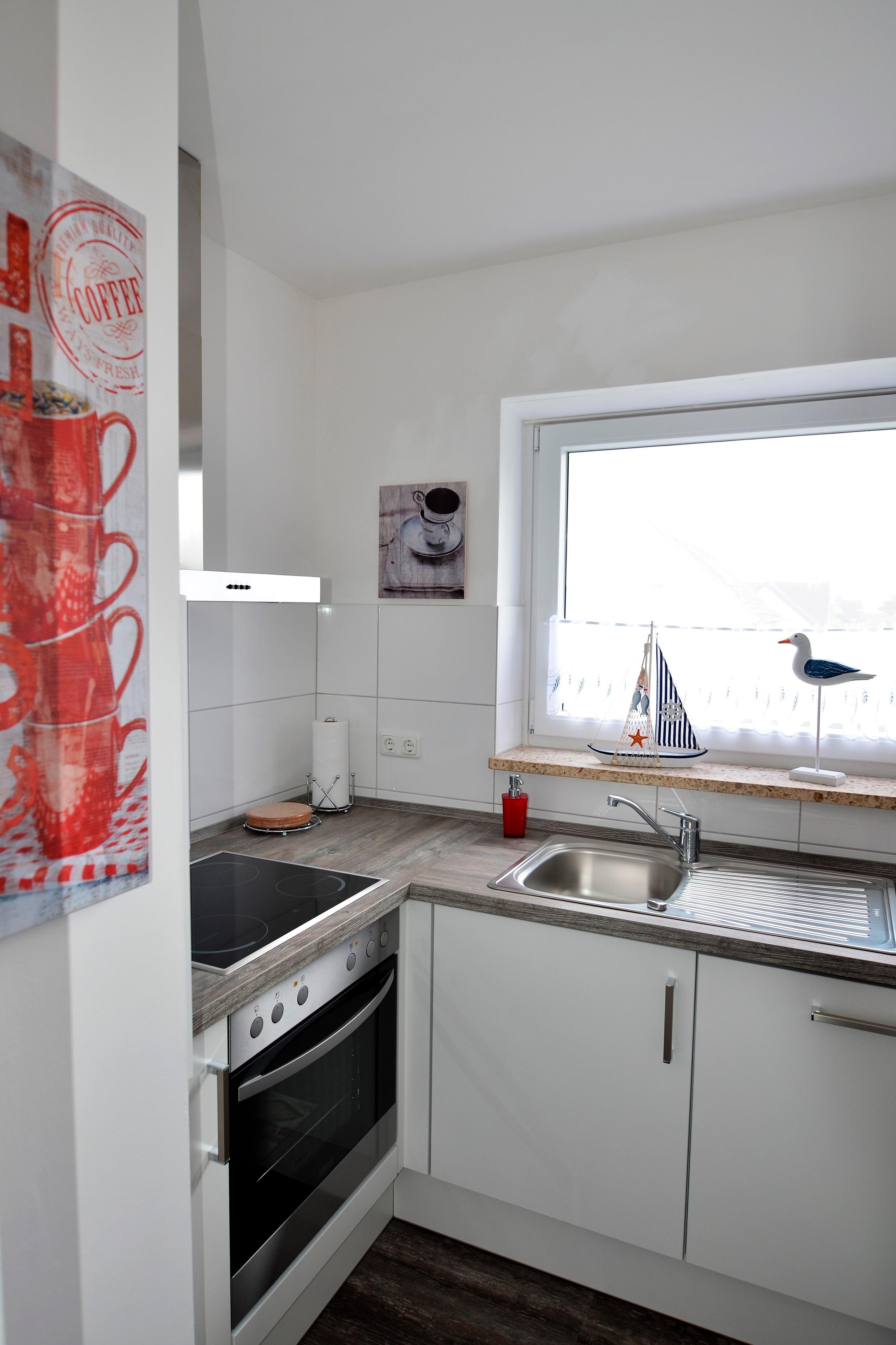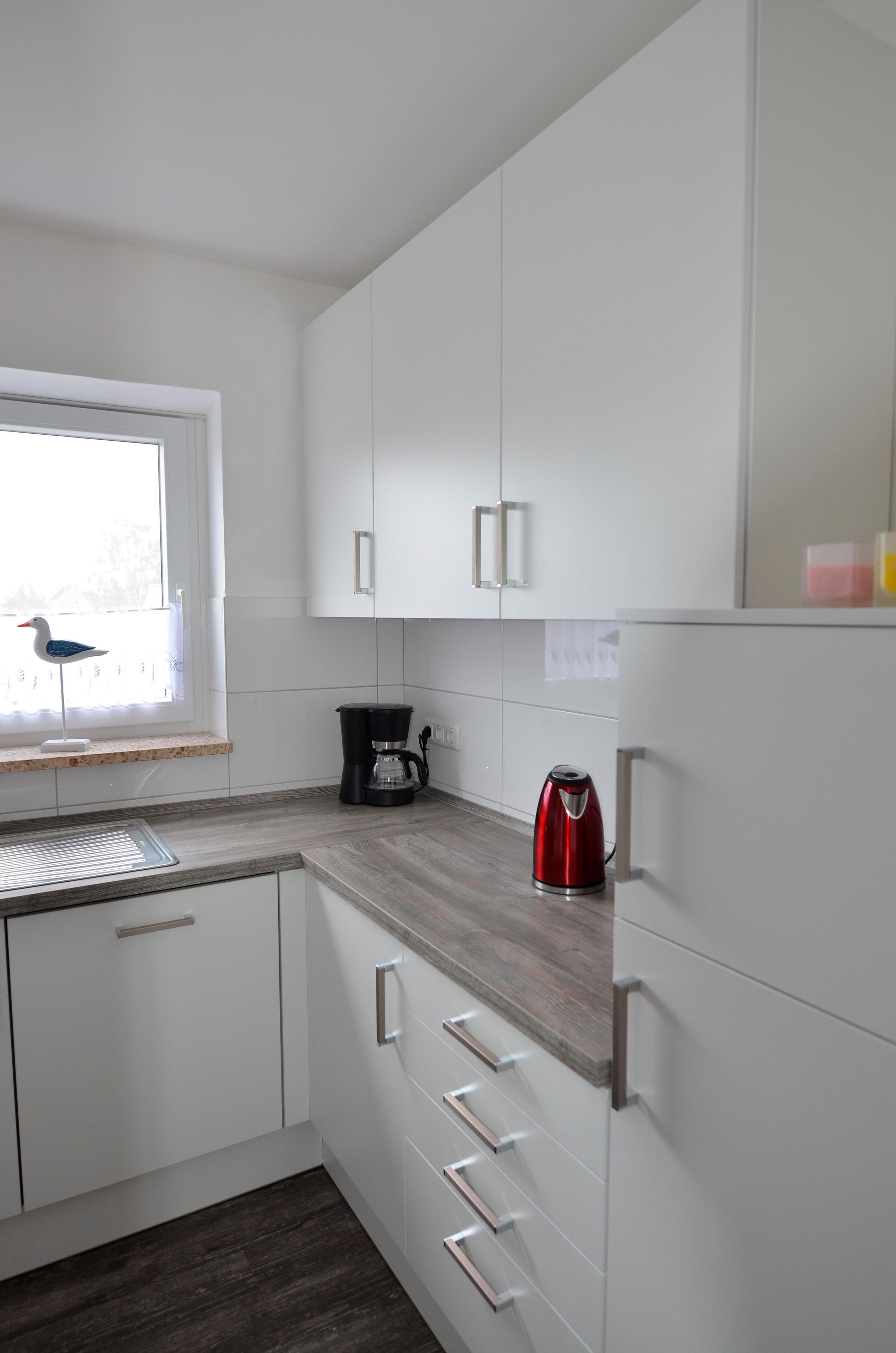 Die neue Küche in weiß-grauer Optik ist mit Geschirrspüler, Kühlschrank und separatem kleinen Gefrierschrank (2 Fächer), E-Herd mit Ceranfeld, Mikrowelle, Kaffeemaschine, Wasserkocher, Toaster und allem notwendigen Koch- und Haushaltszubehör perfekt eingerichtet.