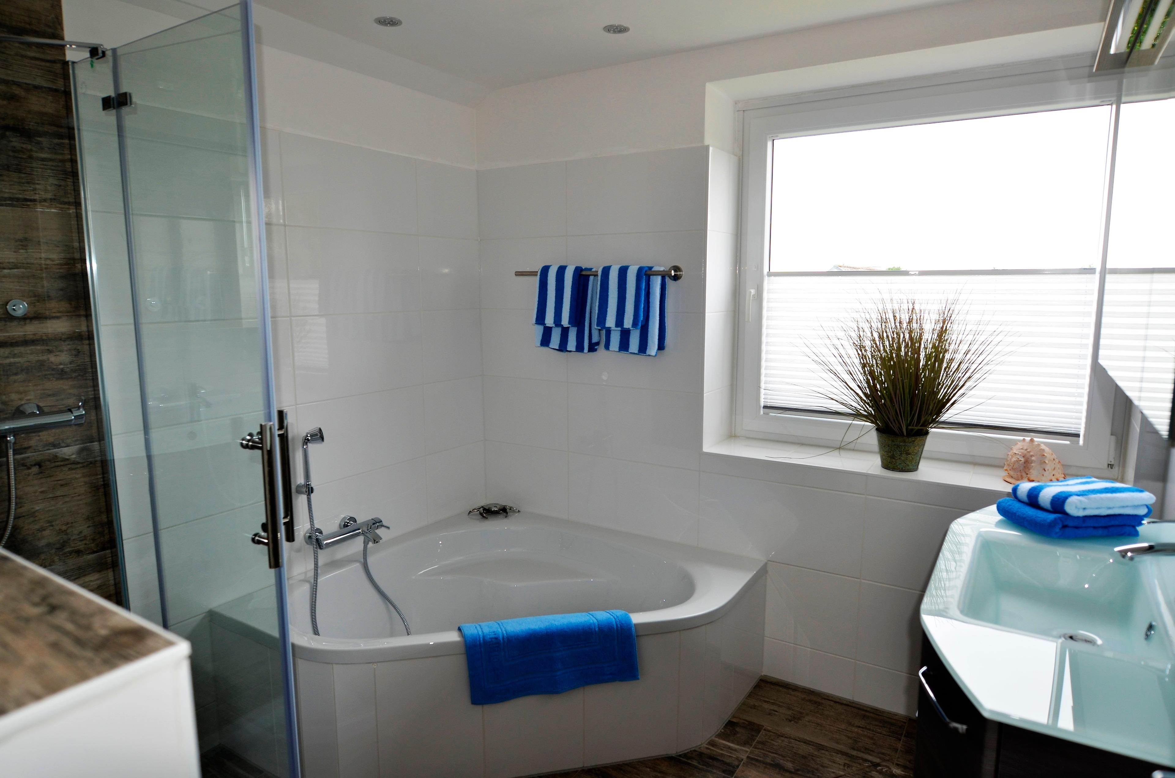 Das gleichfalls komplett renovierte Bad verfügt über eine Eckbadewanne, separate Dusche, Glaswaschtisch mit großem Spiegelschrank und zahlreichen Abstellmöglichkeiten, Toilette und Fußboden in grauer Keramik.