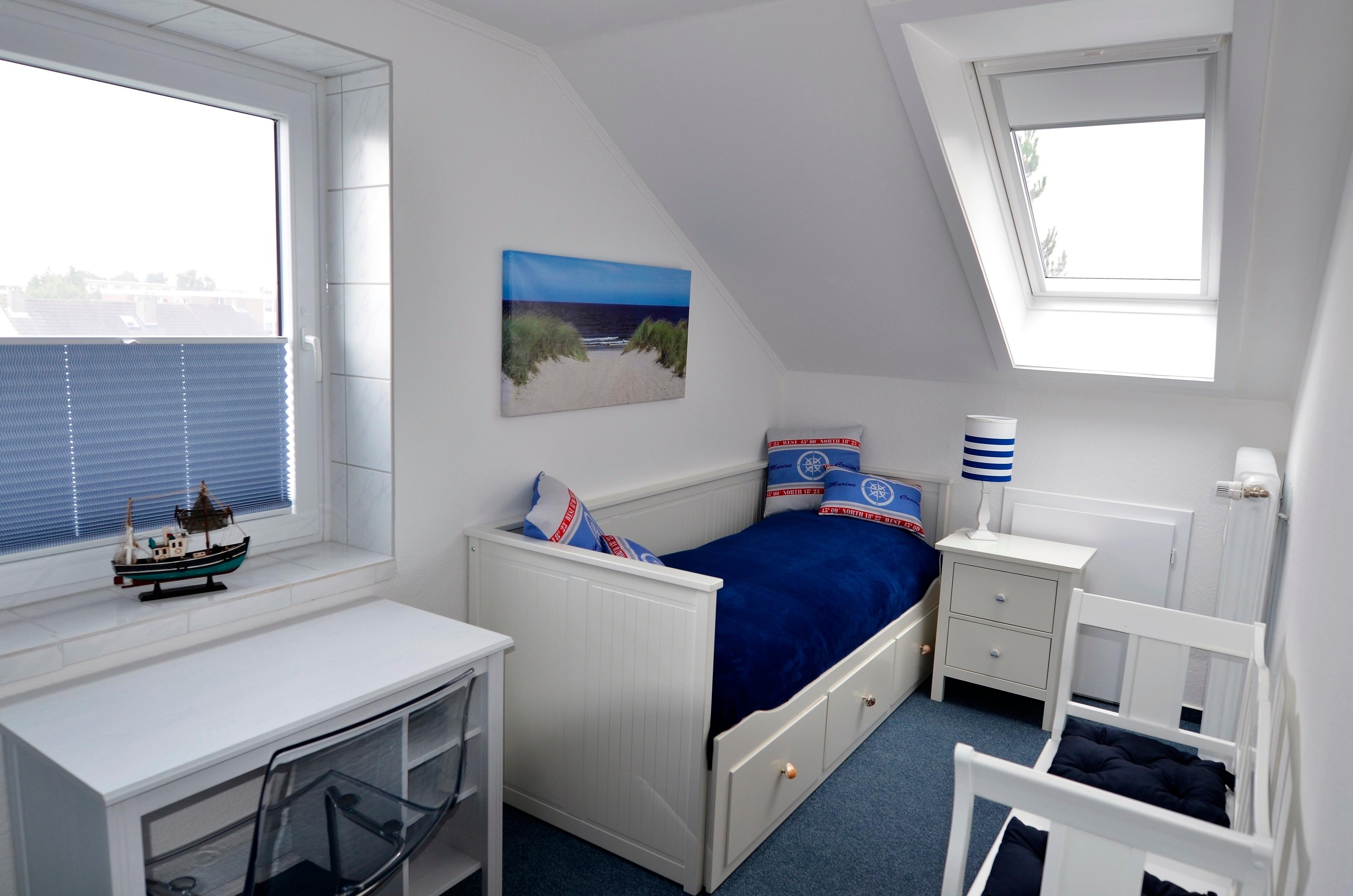 Das Kinderzimmer mit Dachschräge verfügt über 2 Einzelbetten 0,90 x 1,90 m, zwei Kommoden und einen Tisch zum Spielen. Das Veluxfenster ist gleichfalls mit einem Vedunkelungsrollo versehen.