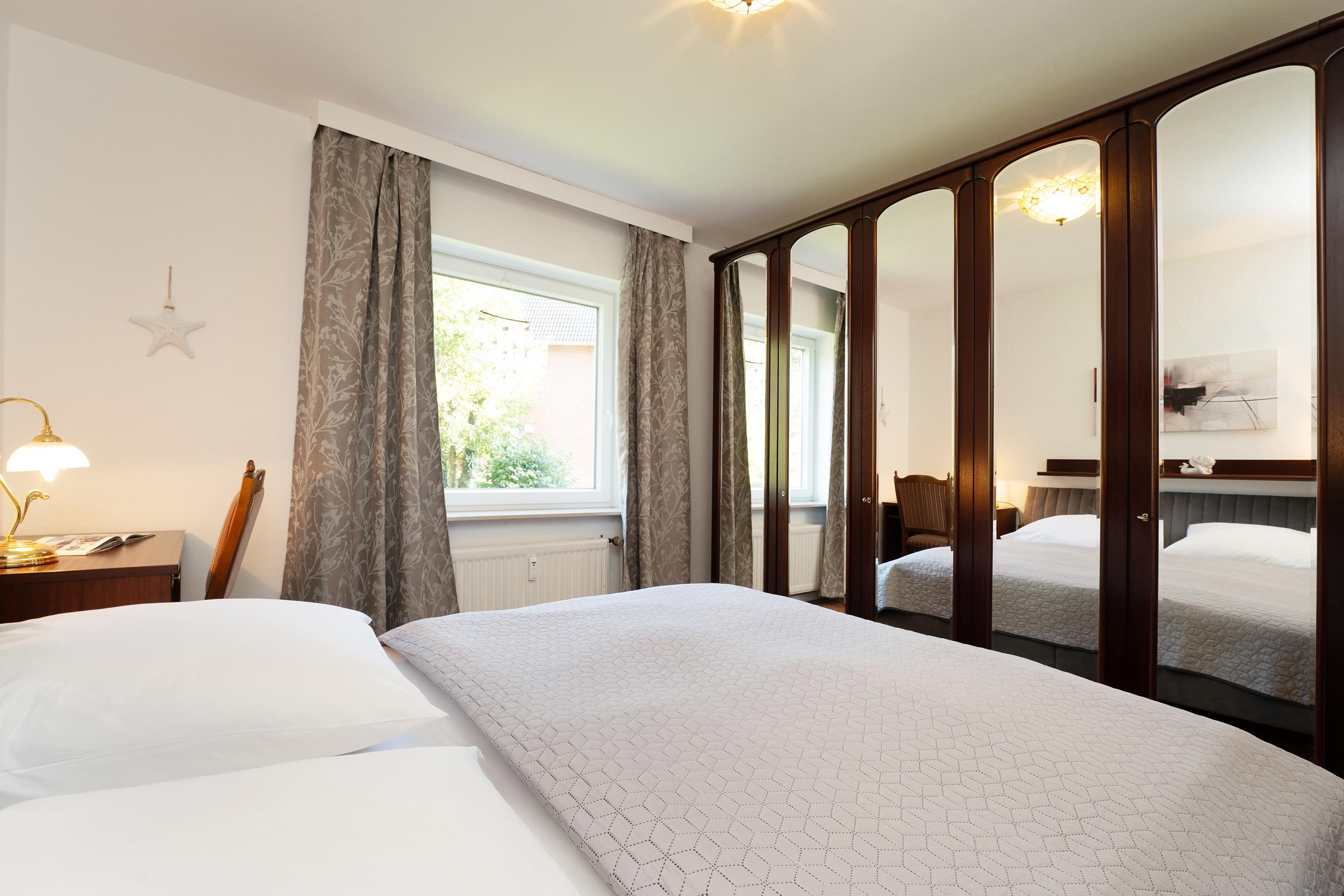 Schlafzimmer: 1 Doppelbett (2x 90x200 cm), Kleiderschrank, Verdunkelung: Rollo, Platz für ein Babybett vorhanden