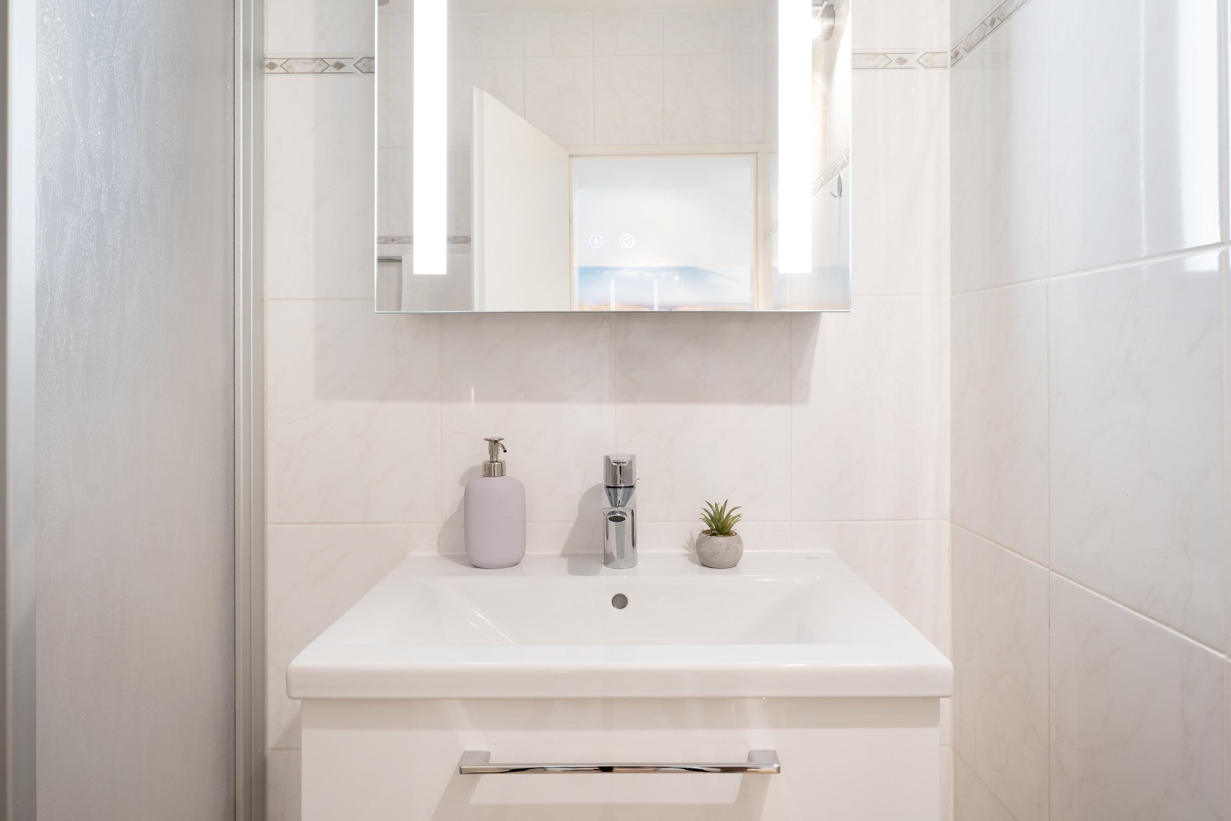 Im separaten Schlafzimmer erwartet Sie ein komfortables Doppelbett, während im Wohnbereich ein Schlafsofa für einen weiteren Gast bereitsteht. Das Bad ist funktional mit Dusche, WC und Handtuchwärmer ausgestattet.