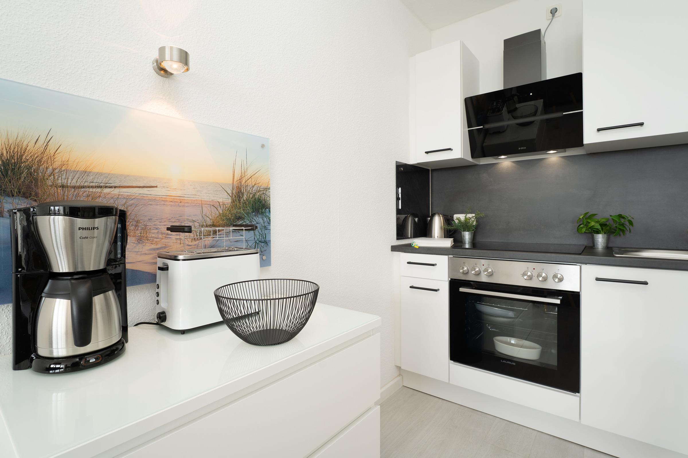 Die offene Küche bietet neben einem Cerankochfeld und Backofen auch eine Mikrowelle, Spülmaschine, Kaffeemaschine, Wasserkocher und Toaster – hier lässt sich bequem für die ganze Familie kochen. Der Essplatz schafft ein geselliges Ambiente für gemeinsame Mahlzeiten.