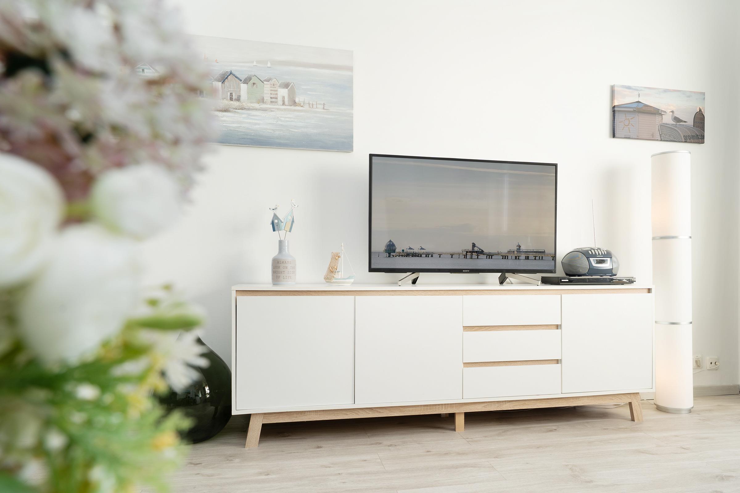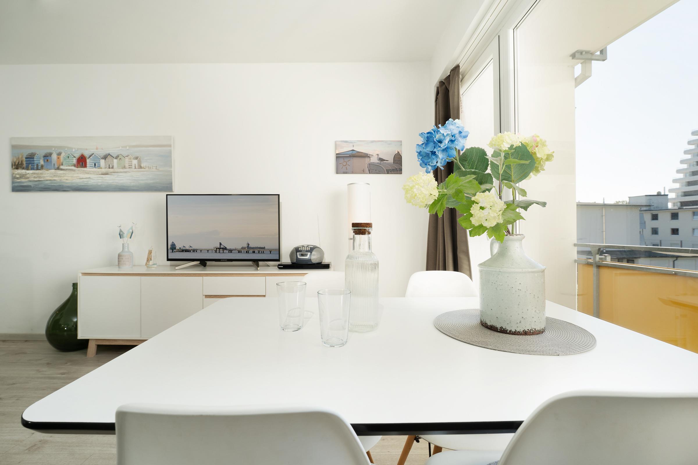 Diese freundliche Wohnung im 1. Stock empfängt Sie mit einem einladenden Wohnbereich, der mit einem gemütlichen Sofa, Flachbild-TV mit DVD-Player, CD-Player und Radio ausgestattet ist – ideal für entspannte Abende nach einem Strandtag. Der Zugang zum möblierten Balkon bietet Ihnen die Möglichkeit, frische Ostseeluft zu genießen und Ihre Mahlzeiten unter freiem Himmel einzunehmen. Die offene Küchenzeile ist funktional ausgestattet mit Induktionskochfeld, Backofen, Geschirrspüler, Kühlschrank mit Gefrierfach sowie Kaffeemaschine (Senseo), Toaster und einen Wasserkocher. Im angrenzenden Essbereich finden alle Gäste bequem Platz. Im ersten Schlafzimmer befindet sich ein Doppelbett und ein Kleiderschrank. Das zweite Zimmer ist mit einem Etagenbett ausgestattet und bietet zwei weitere Schlafmöglichkeiten. Das moderne Bad verfügt über eine Dusche sowie ein WC.