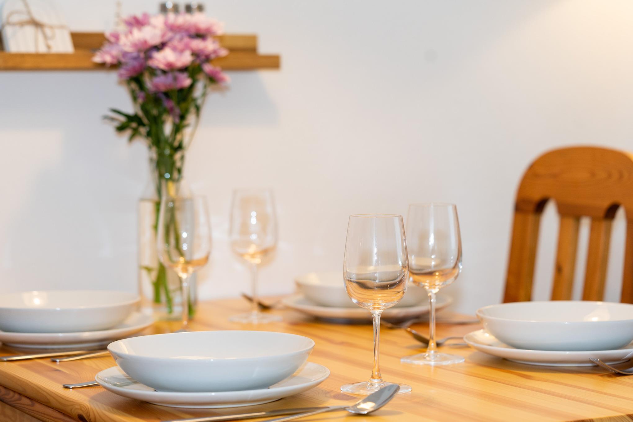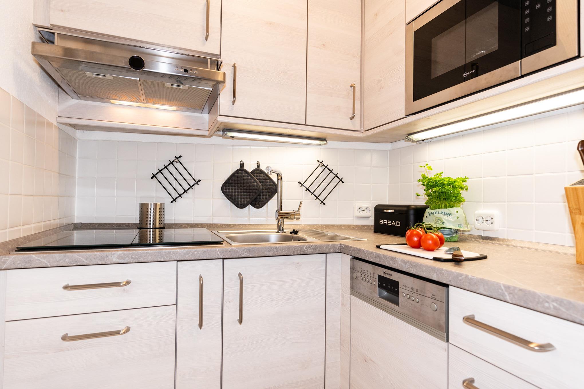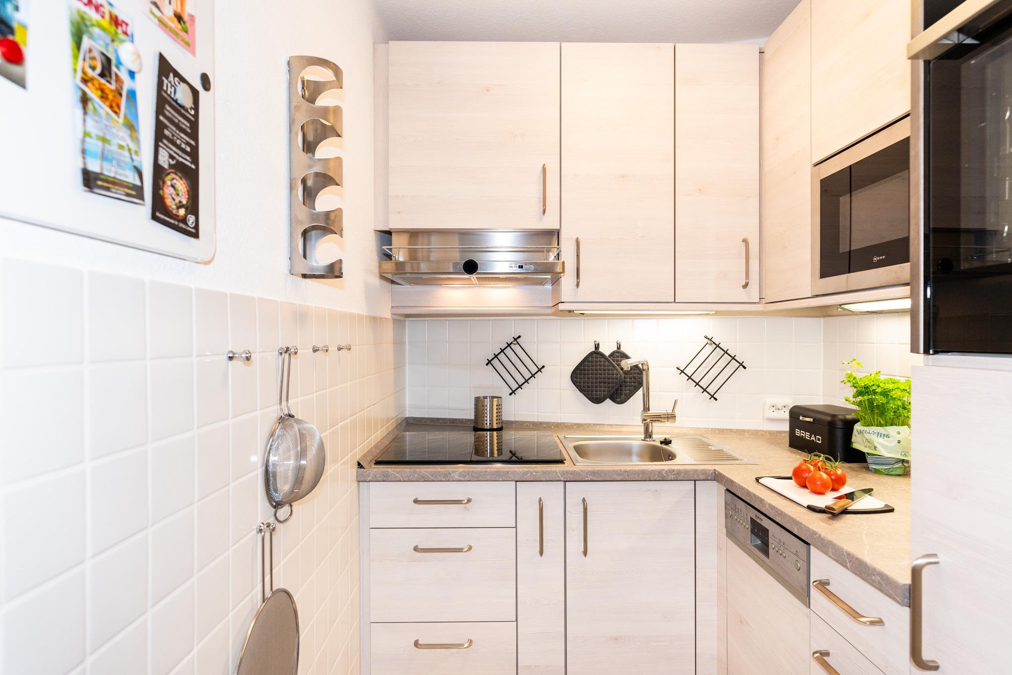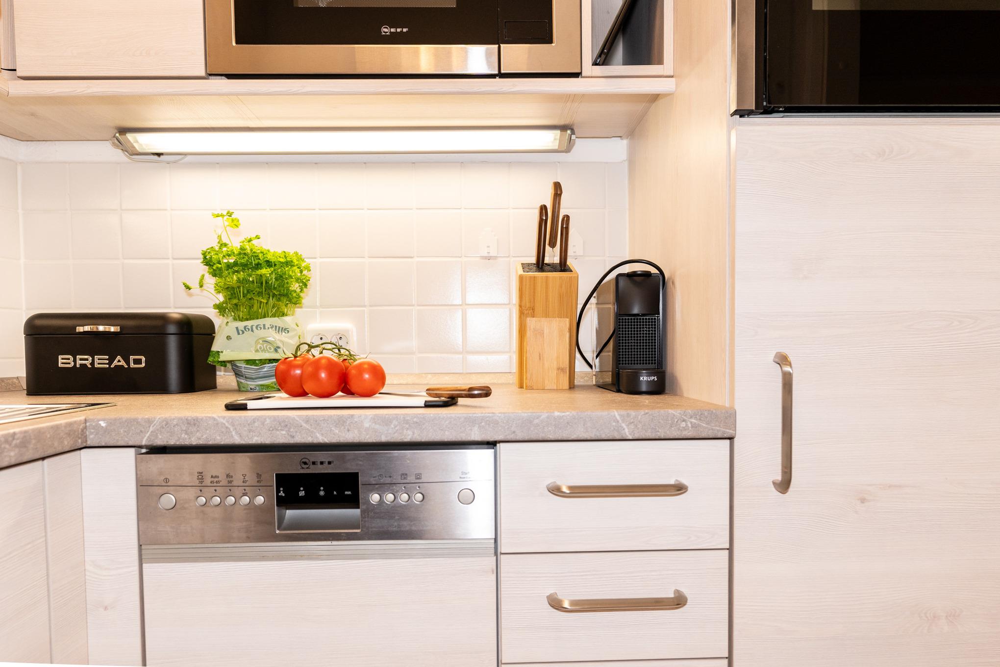 Die moderne separate Küche ist voll ausgestattet und bietet unter anderem ein modernes Induktionskochfeld, Backofen, Kühlschrank mit Gefrierfach, Spülmaschine und weitere kleine Küchenhelfer wie Kaffeemaschine, Wasserkocher und Toaster.
