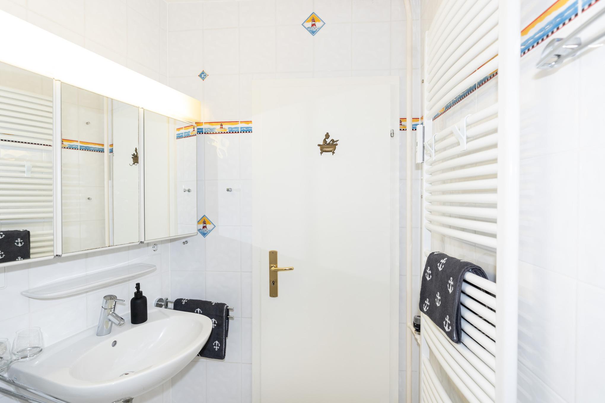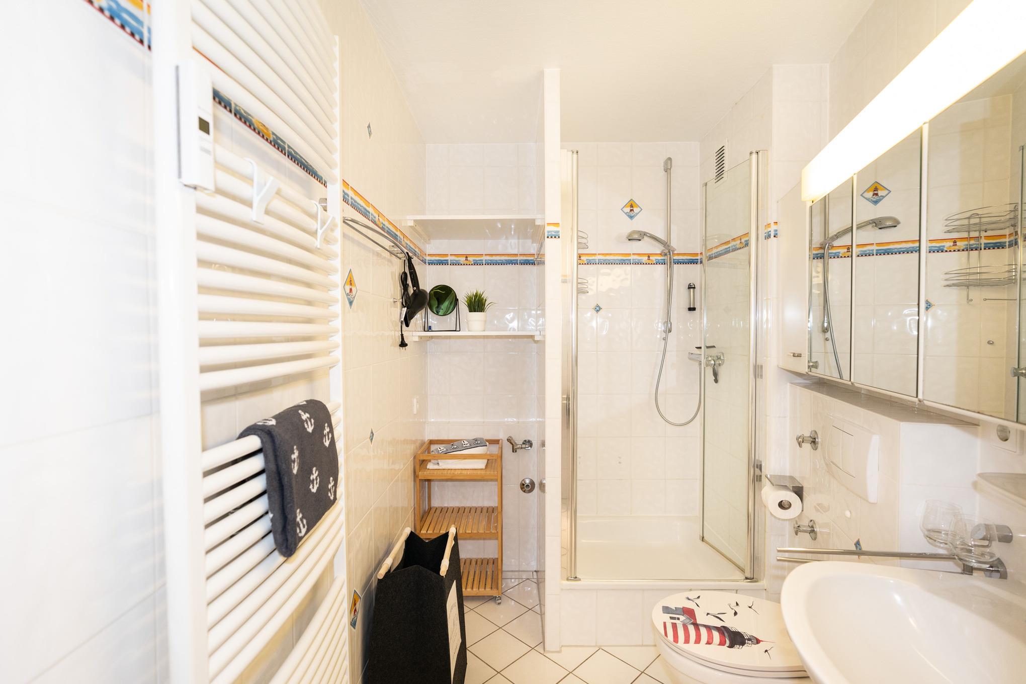 Im klassischen Badezimmer finden Sie eine Dusche, WC, Waschbecken und diverse Ablagemöglichkeiten vor.