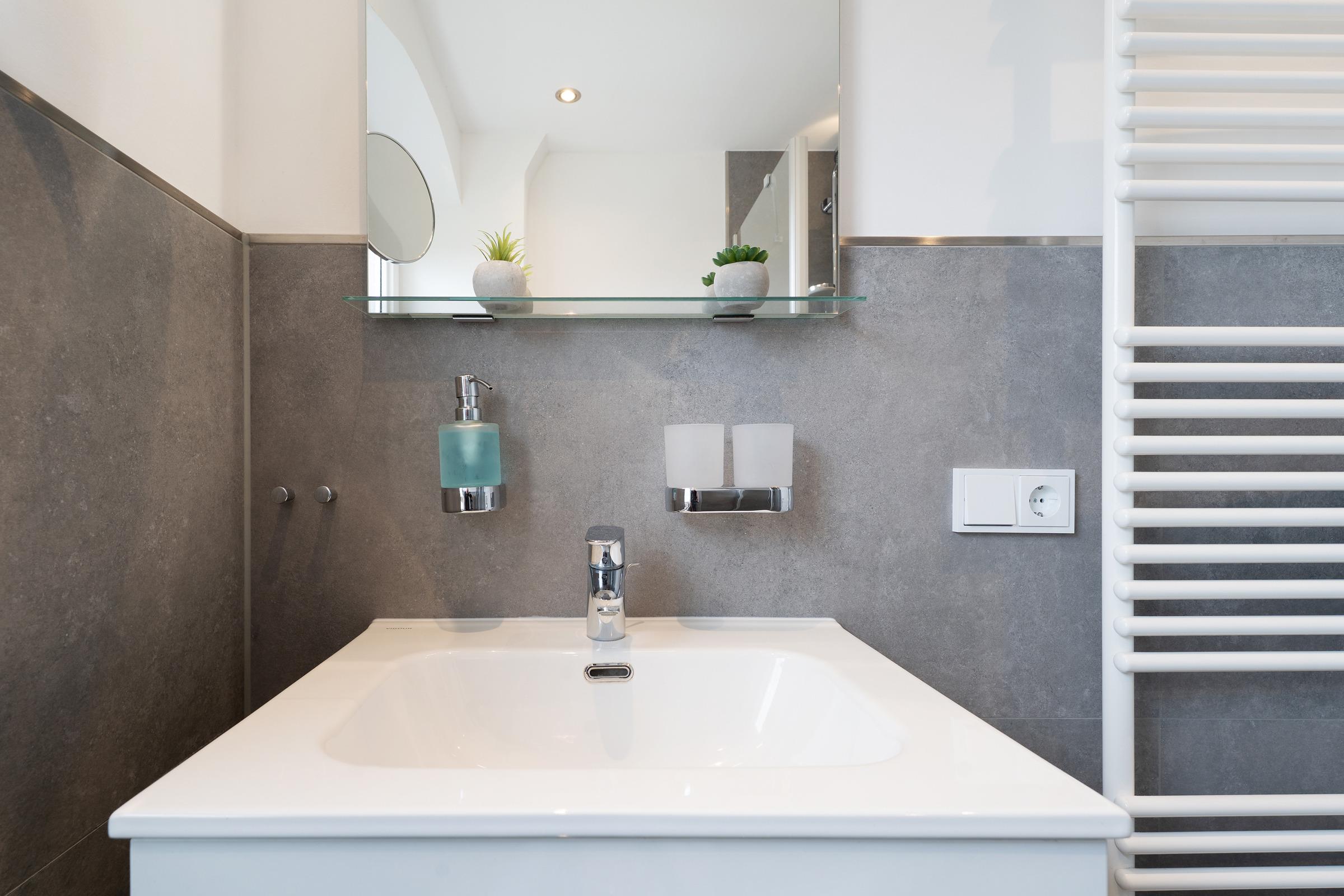Das Badezimmer verfügt über eine Dusche und einen beheizbaren Handtuchhalter.