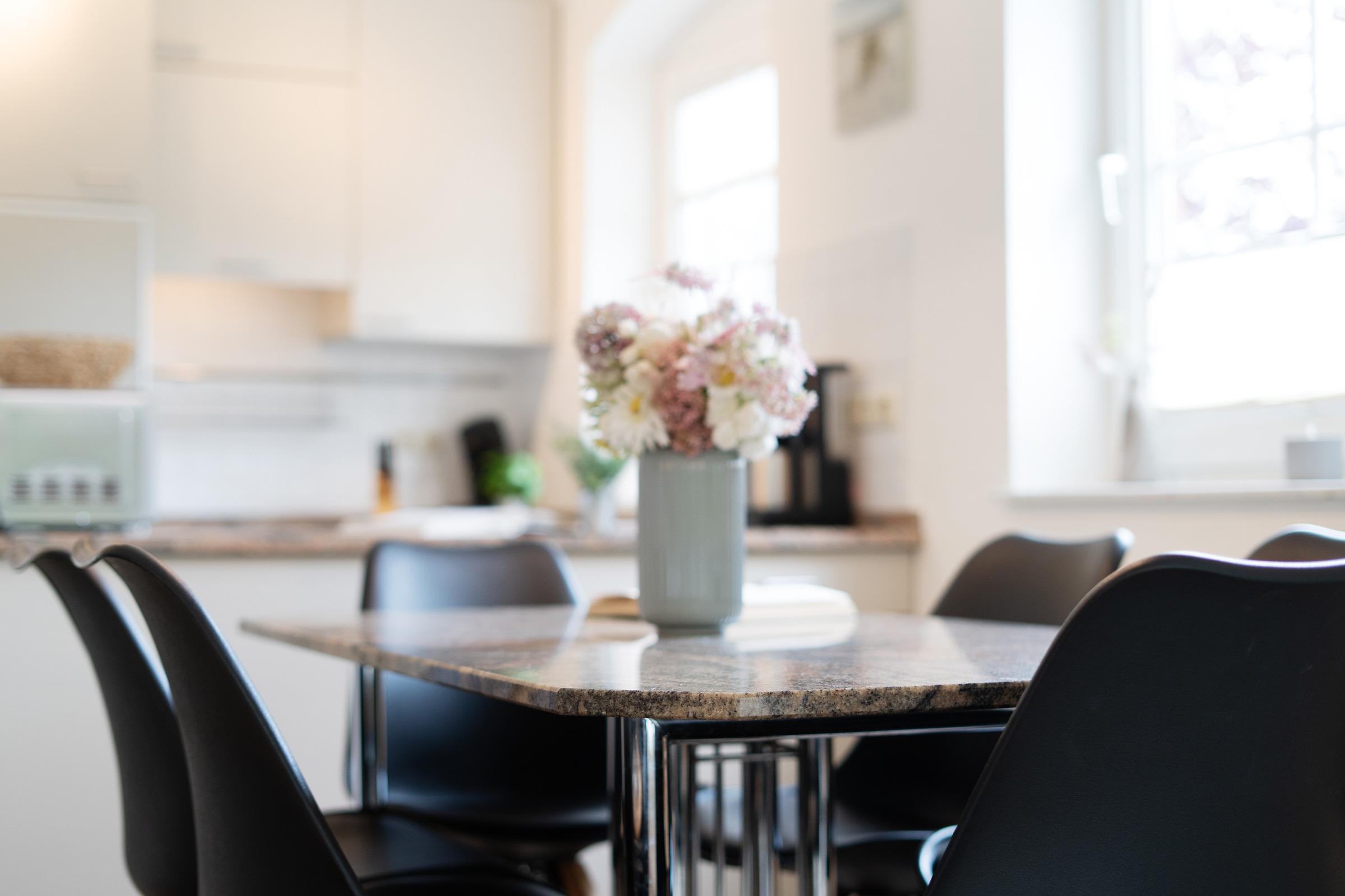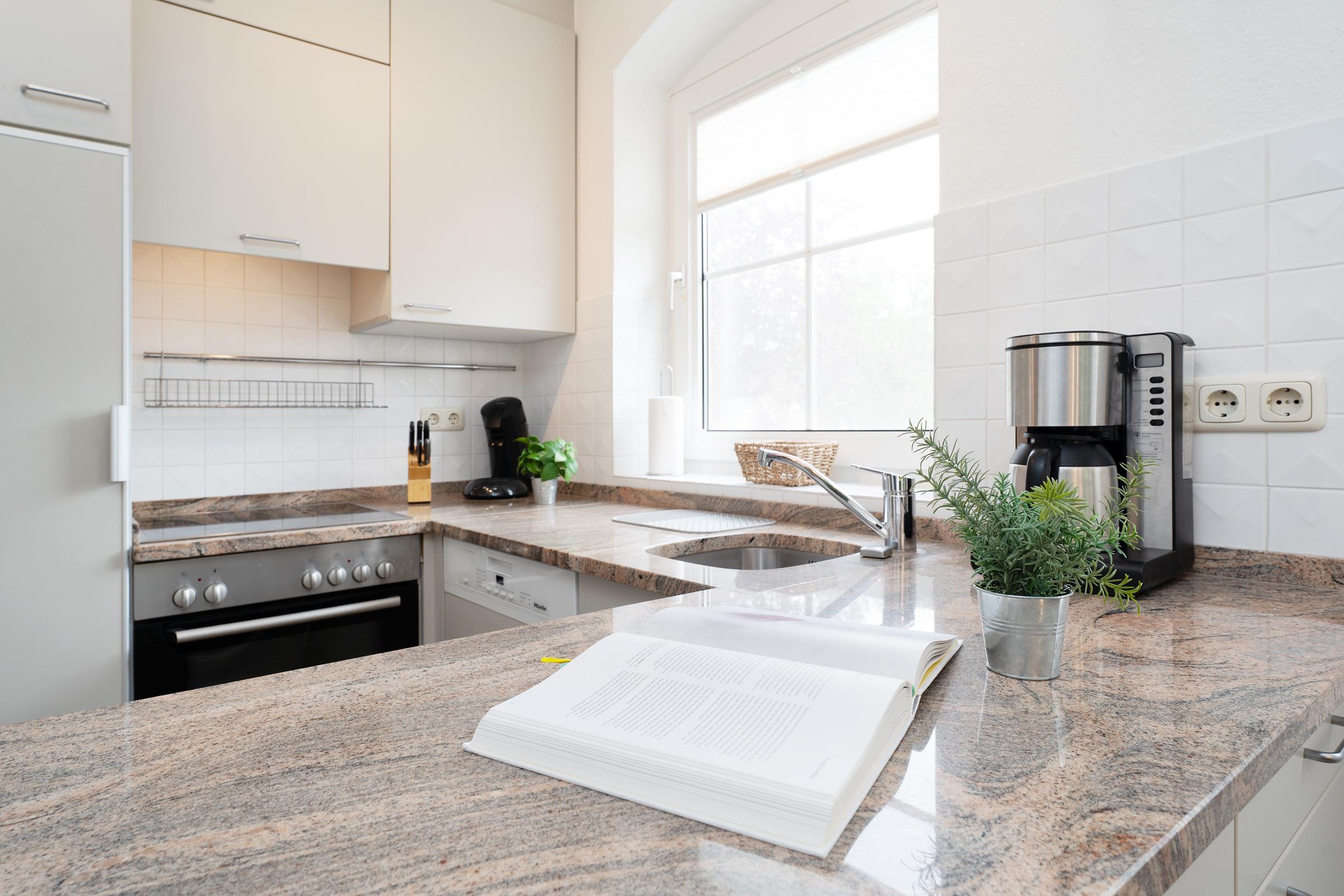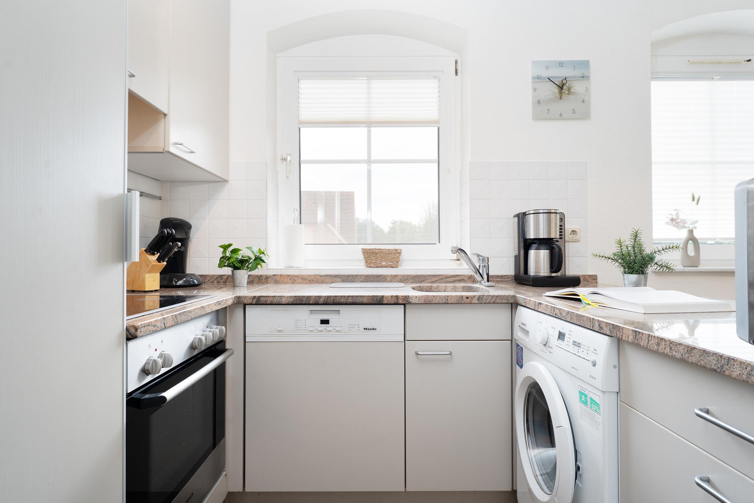 Die gut ausgestattete Küche mit Backofen, Geschirrspülmaschine, Kühlschrank mit Gefrierfach, Wasserkocher, Kaffeemaschine und Toaster lässt keine Wünsche offen. Der angrenzende Essbereich lädt zu geselligen Mahlzeiten ein.