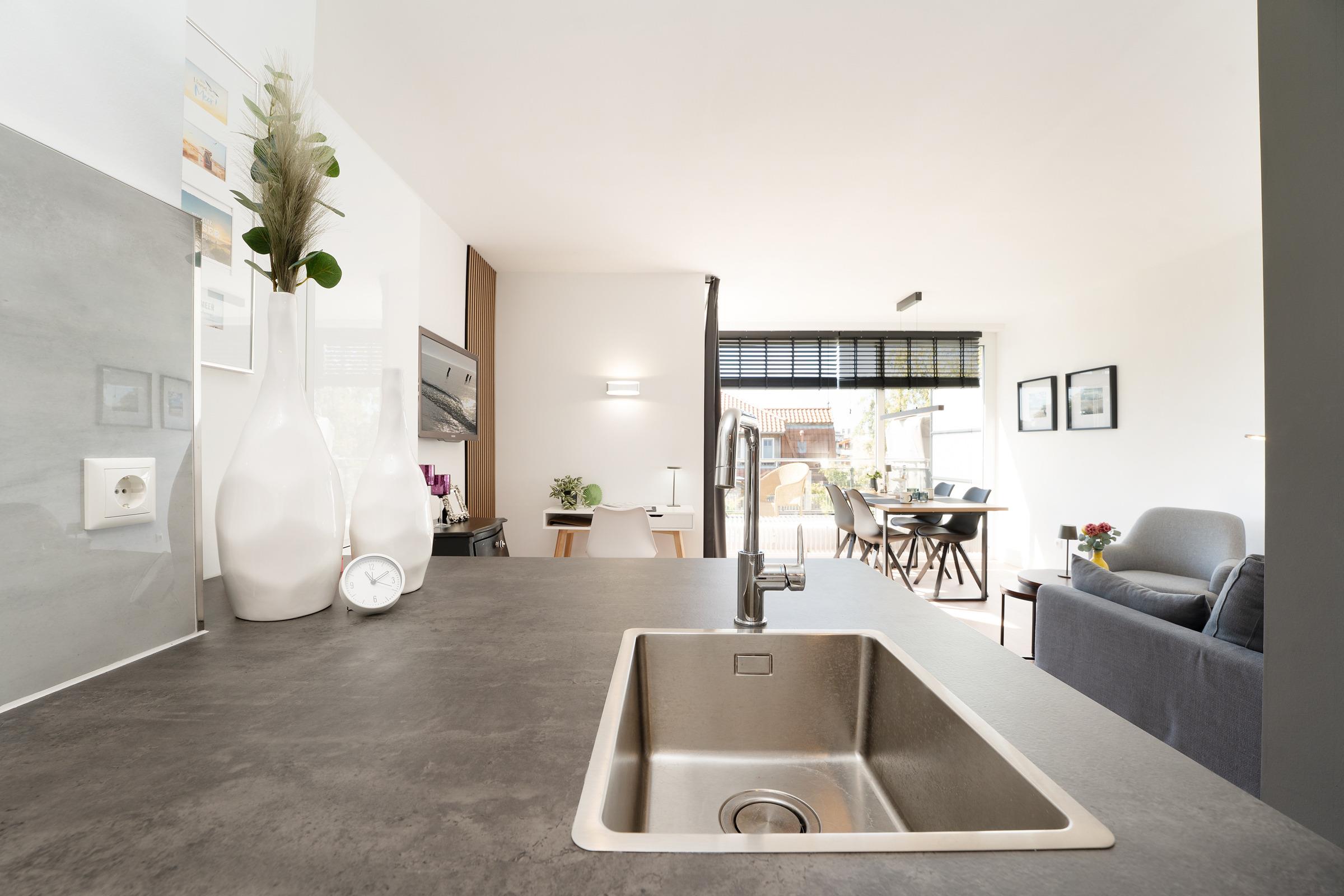 Der helle Wohnbereich lädt mit bequemen Sitzmöglichkeiten und einem Fernseher zu entspannten Stunden ein. Von hier aus gelangen Sie auf den möblierten Balkon, der zum Verweilen an der frischen Ostseeluft einlädt. Die offene Küchenzeile ist modern ausgestattet und verfügt über Backofen, Geschirrspülmaschine, Kühlschrank, Mikrowelle, Kaffeemaschine, Toaster und weitere nützliche Utensilien. Im Schlafzimmer sorgt ein komfortables Doppelbett (2x 80x200 cm) für erholsamen Schlaf. Das Badezimmer ist mit Dusche und WC ausgestattet.