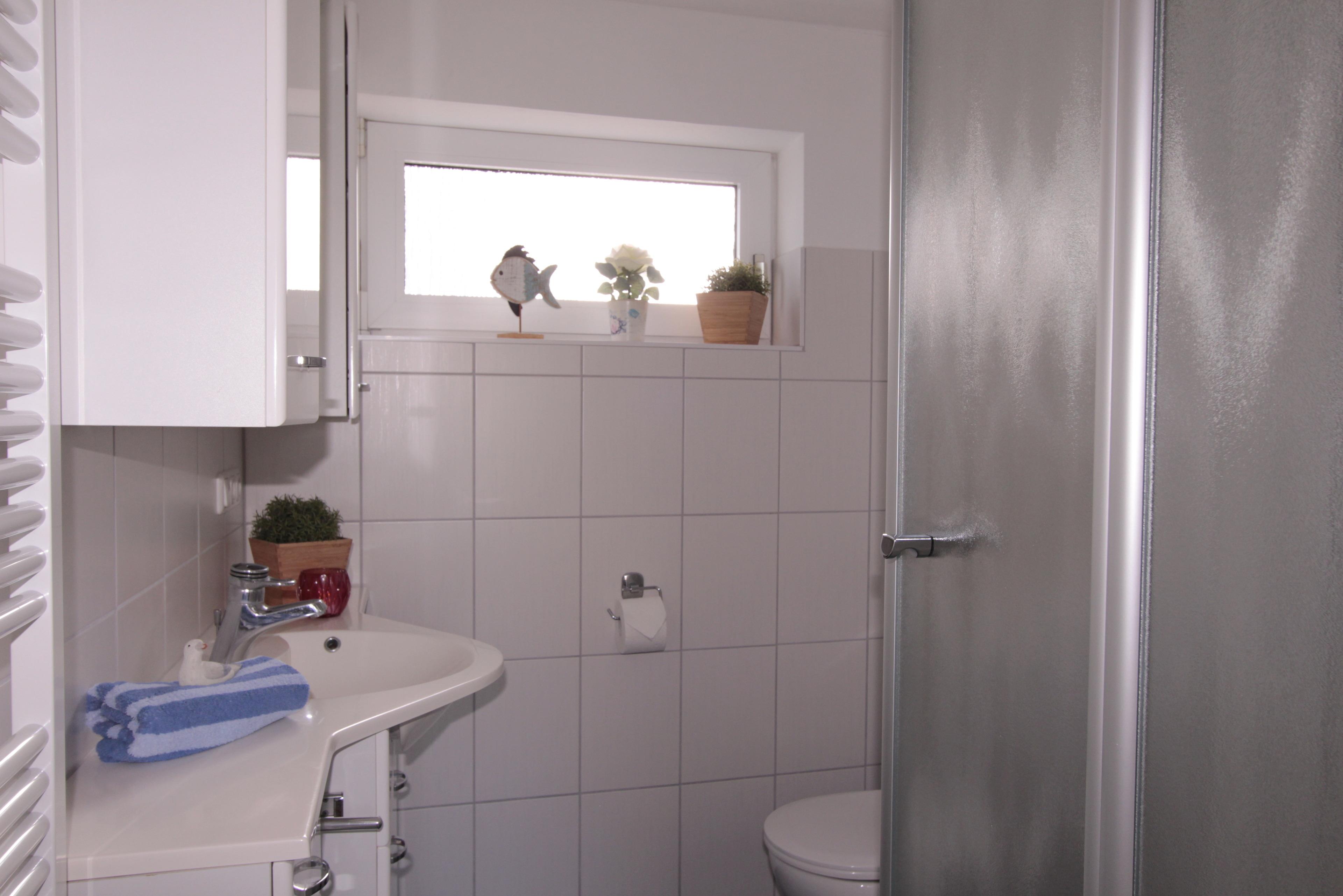 Das hell geflieste Duschbad hat einen großen Spiegelschrank für genügend Stauraum, WC und Dusche.