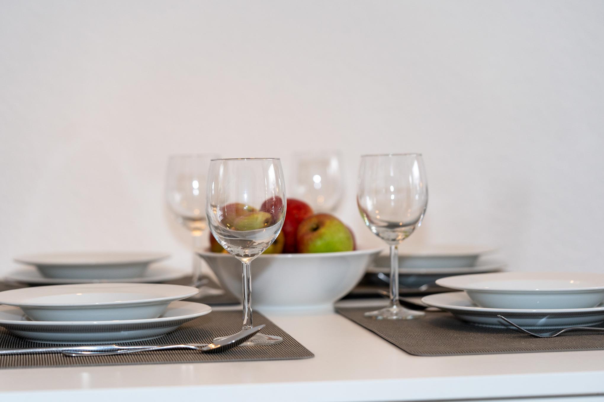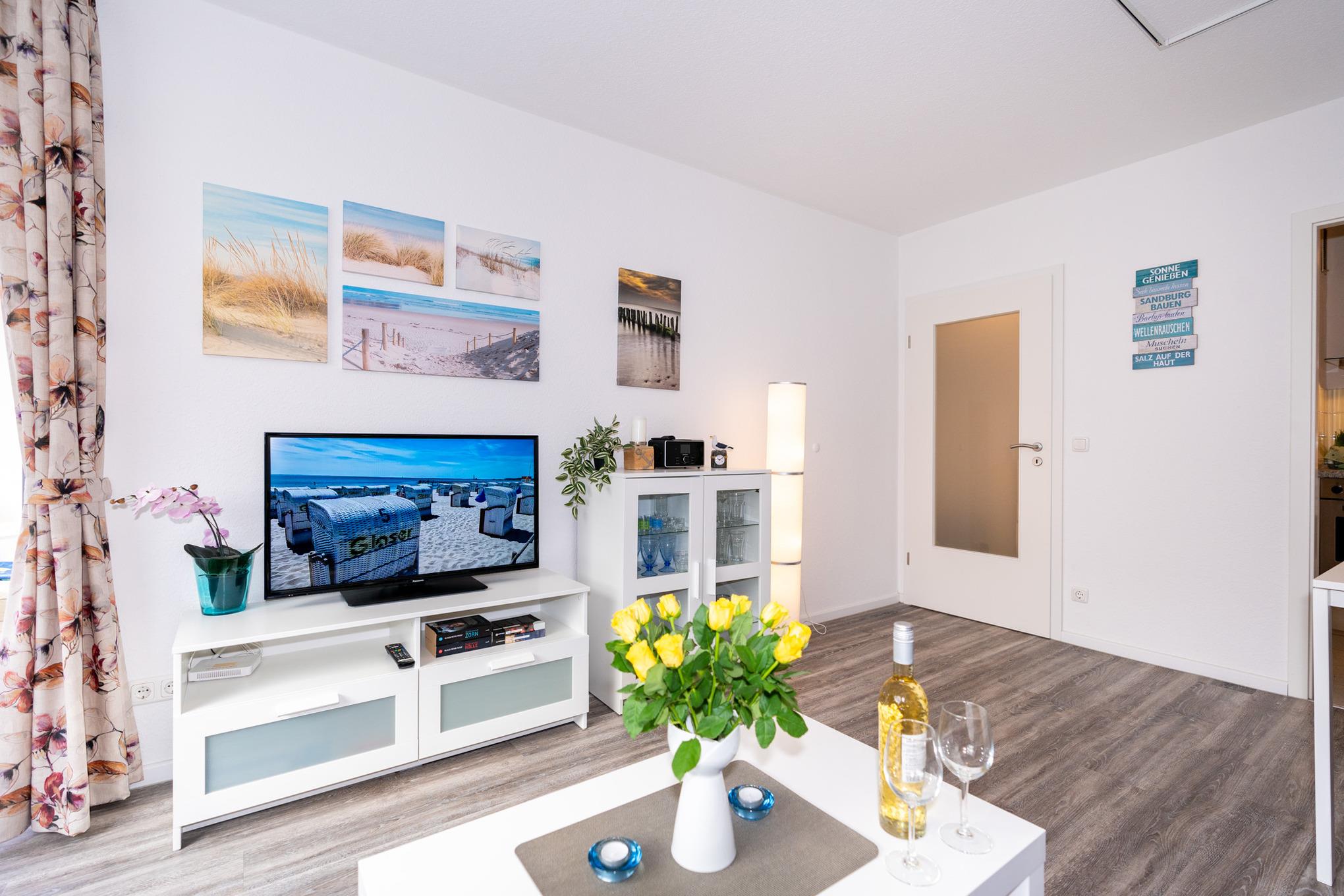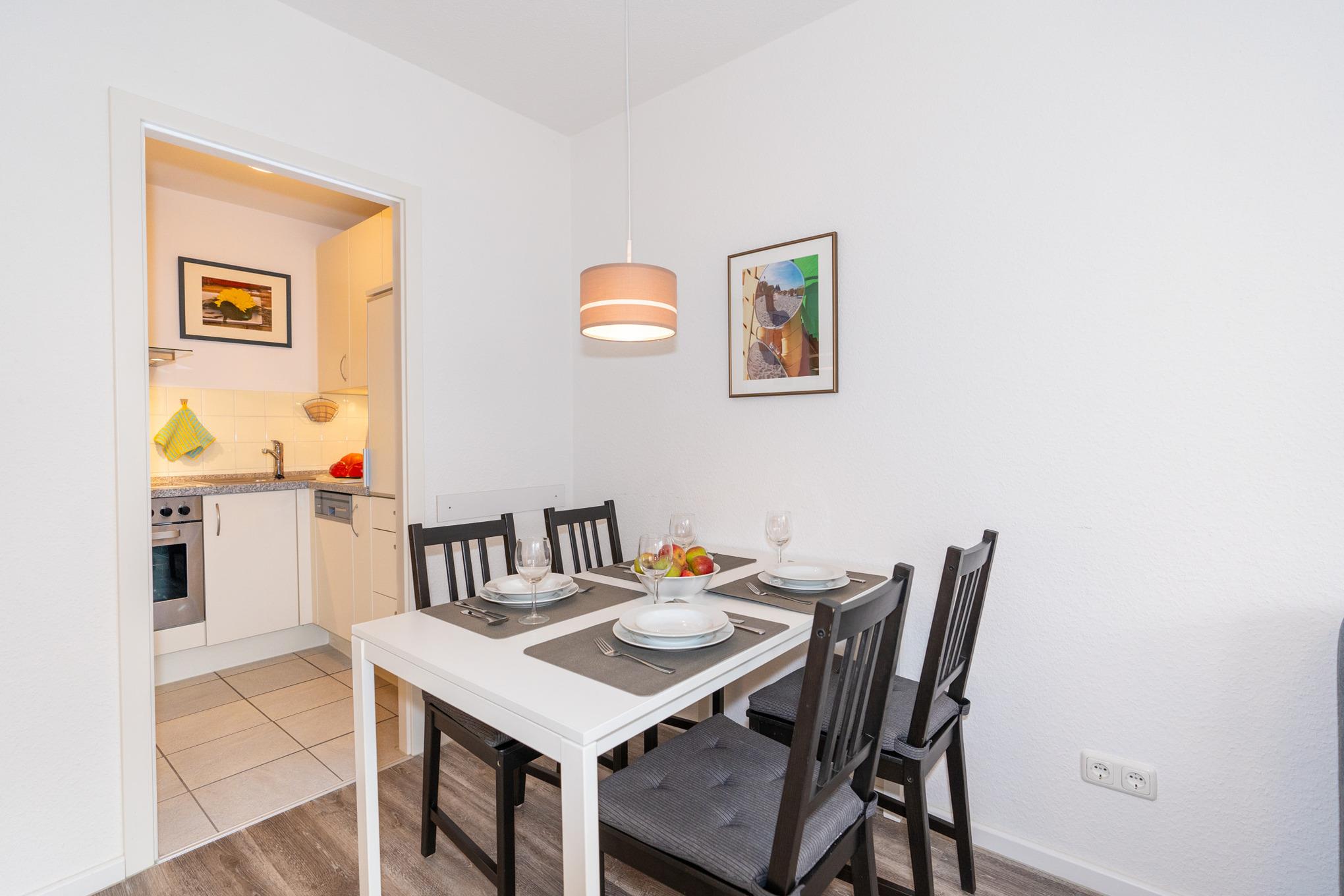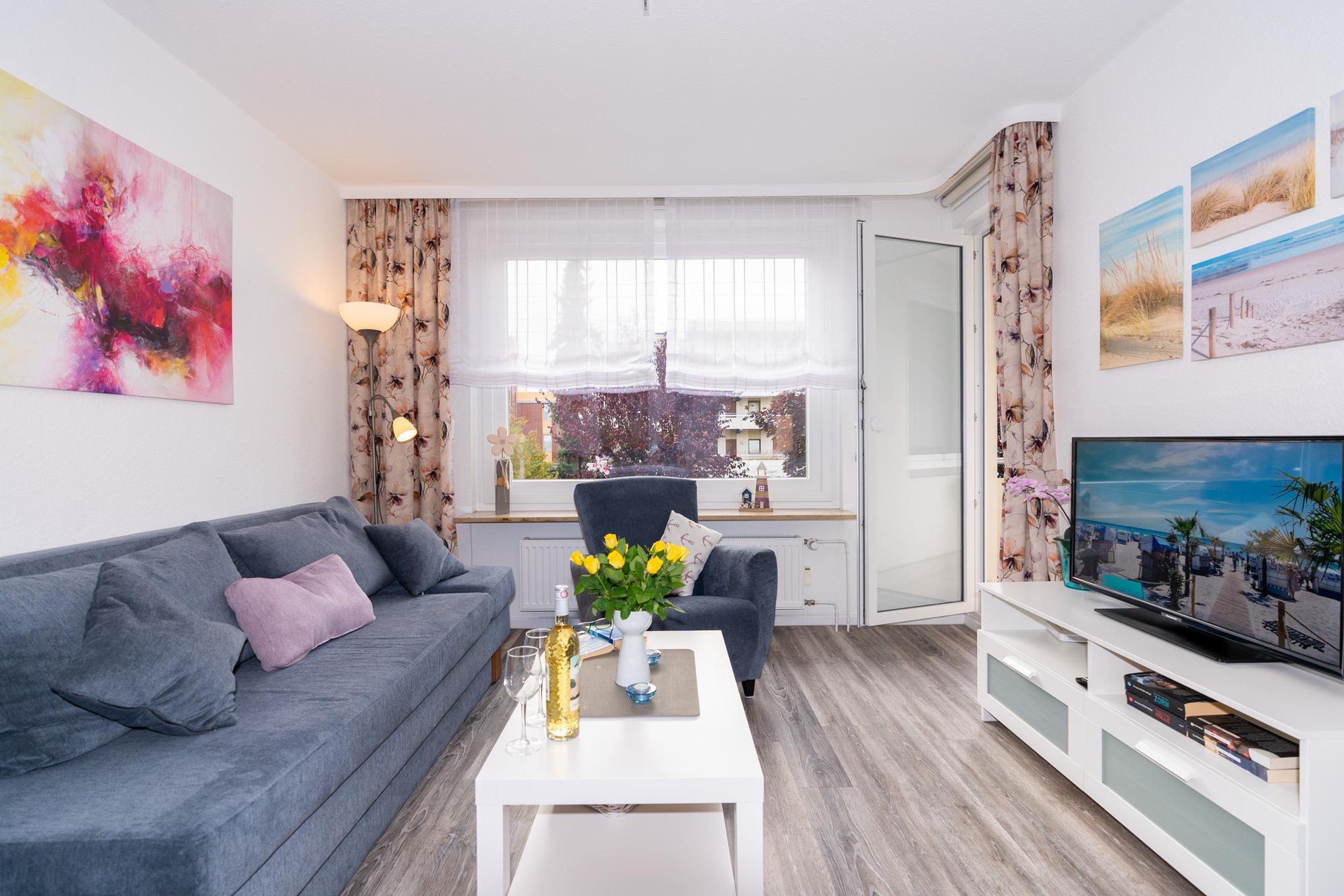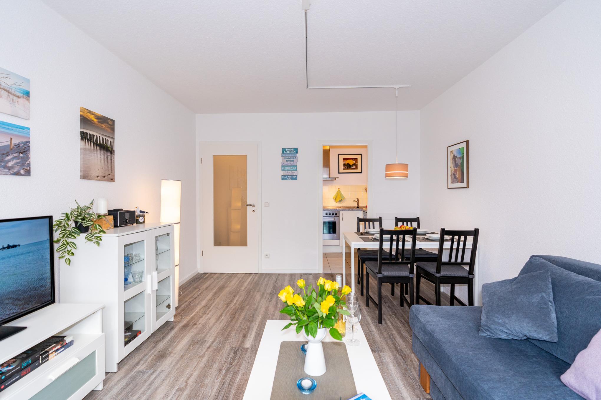 Der helle Wohnbereich bietet Ihnen nicht nur eine Couch-Ecke mit neuwertigem Schlafsofa und TV, sondern auch einen Essbereich für bis zu 4 Personen. Den sonnigen Süd-Balkon erreichen Sie ebenfalls über das Wohnzimmer. Ausgestattet mit einem Tisch und vier Stühlen, lässt sich hier hervorragend der Tag ausklingen. Kostenloses W-Lan steht Ihnen selbstverständlich zur Verfügung.