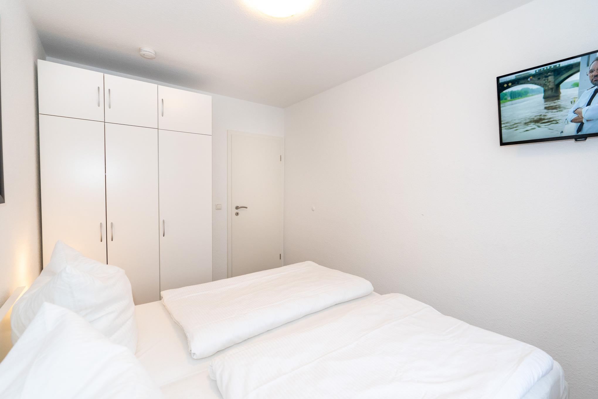 Das Schlafzimmer ist mit einem bequemen Doppelbett, einem Kleiderschrank, Nachttischen und einem zusätzlichen Flat-TV ausgestattet. Weitere Schlafplätze bietet die Schlafcouch im Wohnzimmer.