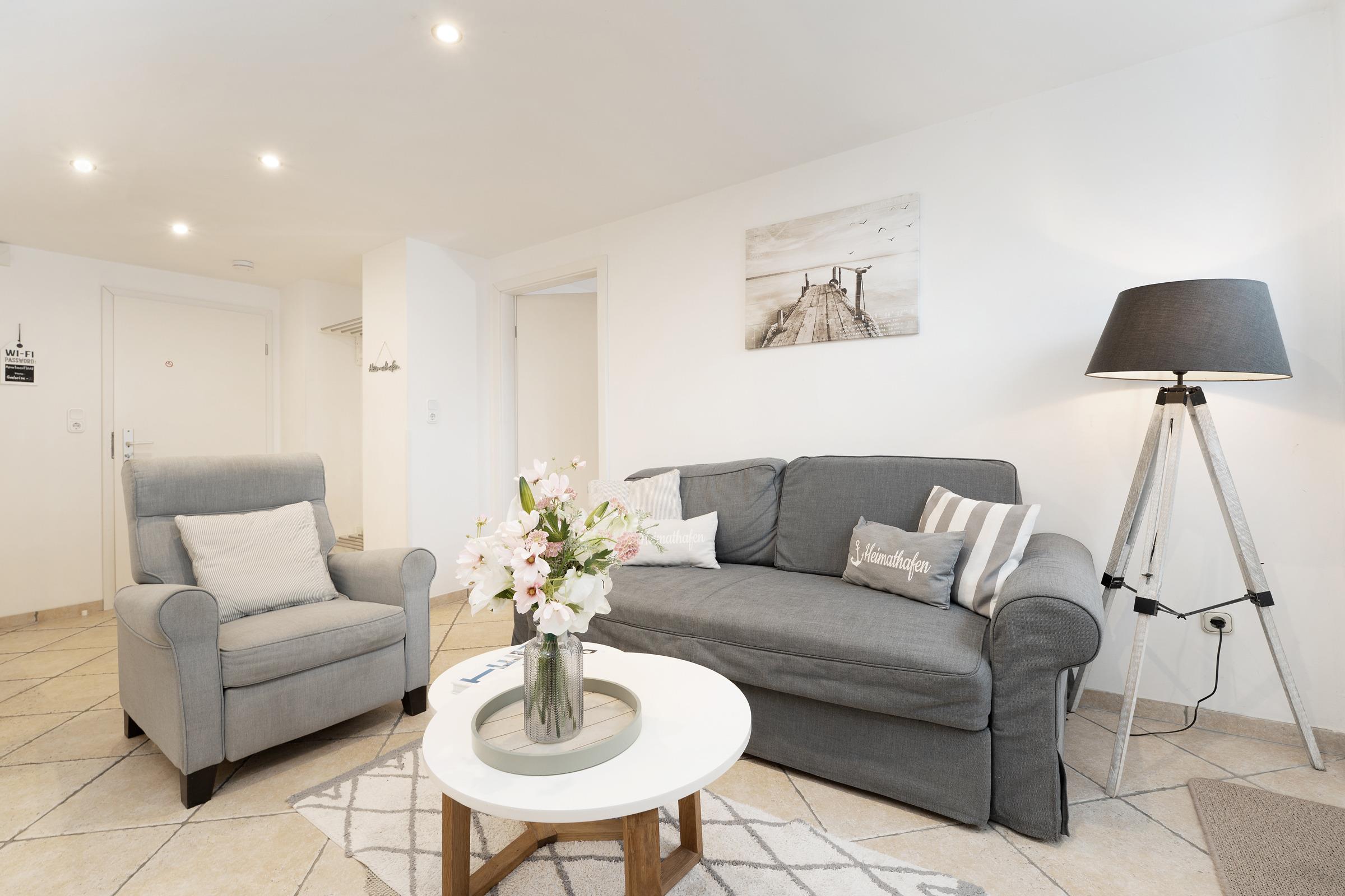Die gemütliche Wohnung empfängt Sie mit einem freundlichen Wohnbereich, der dank Fernseher und Radio zu entspannten Stunden einlädt. Von hier aus gelangen Sie direkt auf die schöne Süd-West Terrasse mit Gartenmöbeln – ideal, um die frische Ostseeluft zu genießen. Bitte beachten Sie, dass das Grillen nicht gestattet ist.