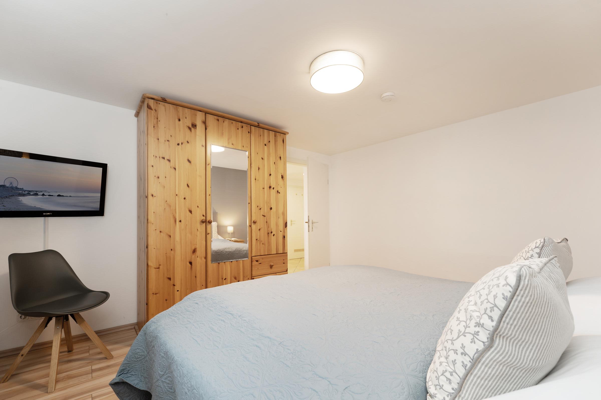 Schlafzimmer: 1 Boxspringdoppelbett (2x 90x200 cm mit durchgehendem Topper), Kleiderschrank, TV, Verdunkelung: Rollladen, Platz für ein Babybett vorhanden