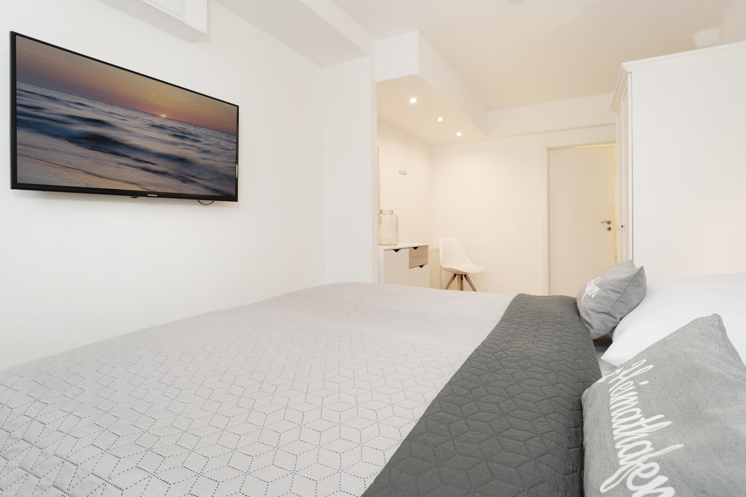 Schlafzimmer 1: 1 Boxspringdoppelbett (2x 90x200 cm mit durchgehendem Topper), Kleiderschrank, TV, Bad en suite, Verdunkelung: Rollladen, Platz für ein Babybett vorhanden