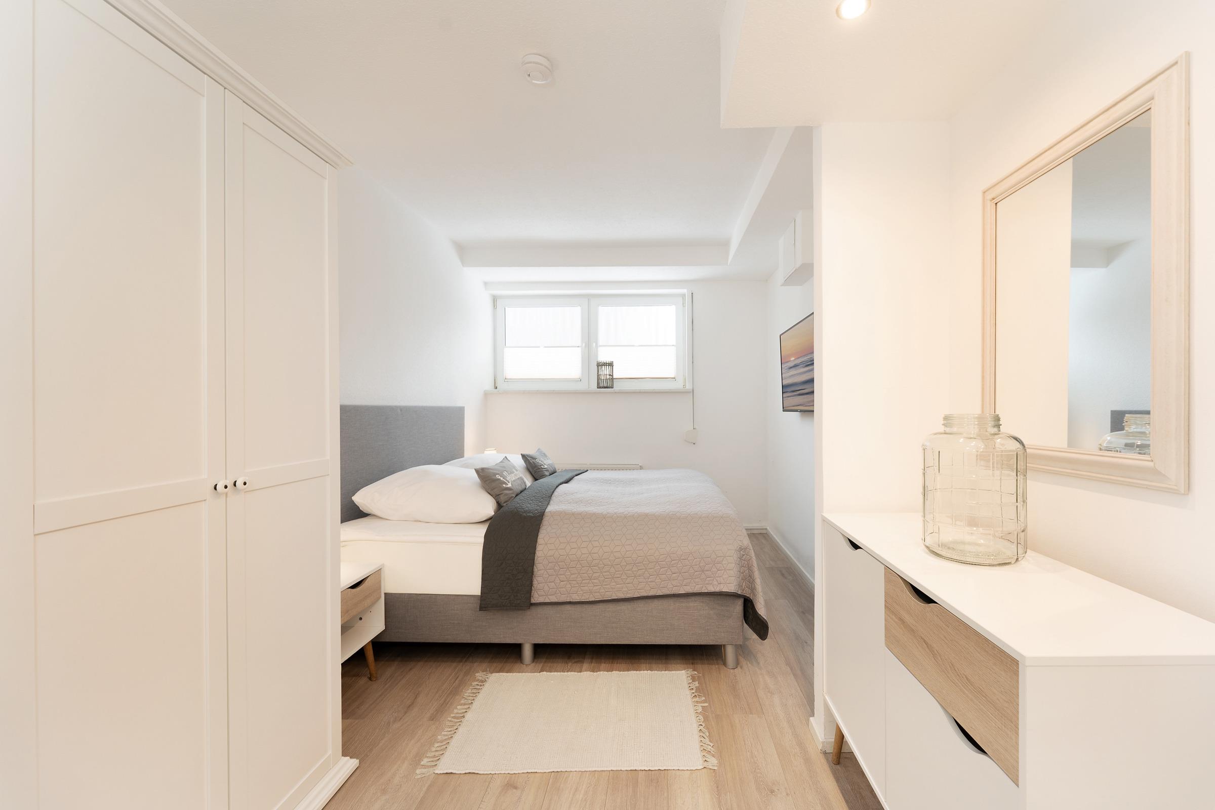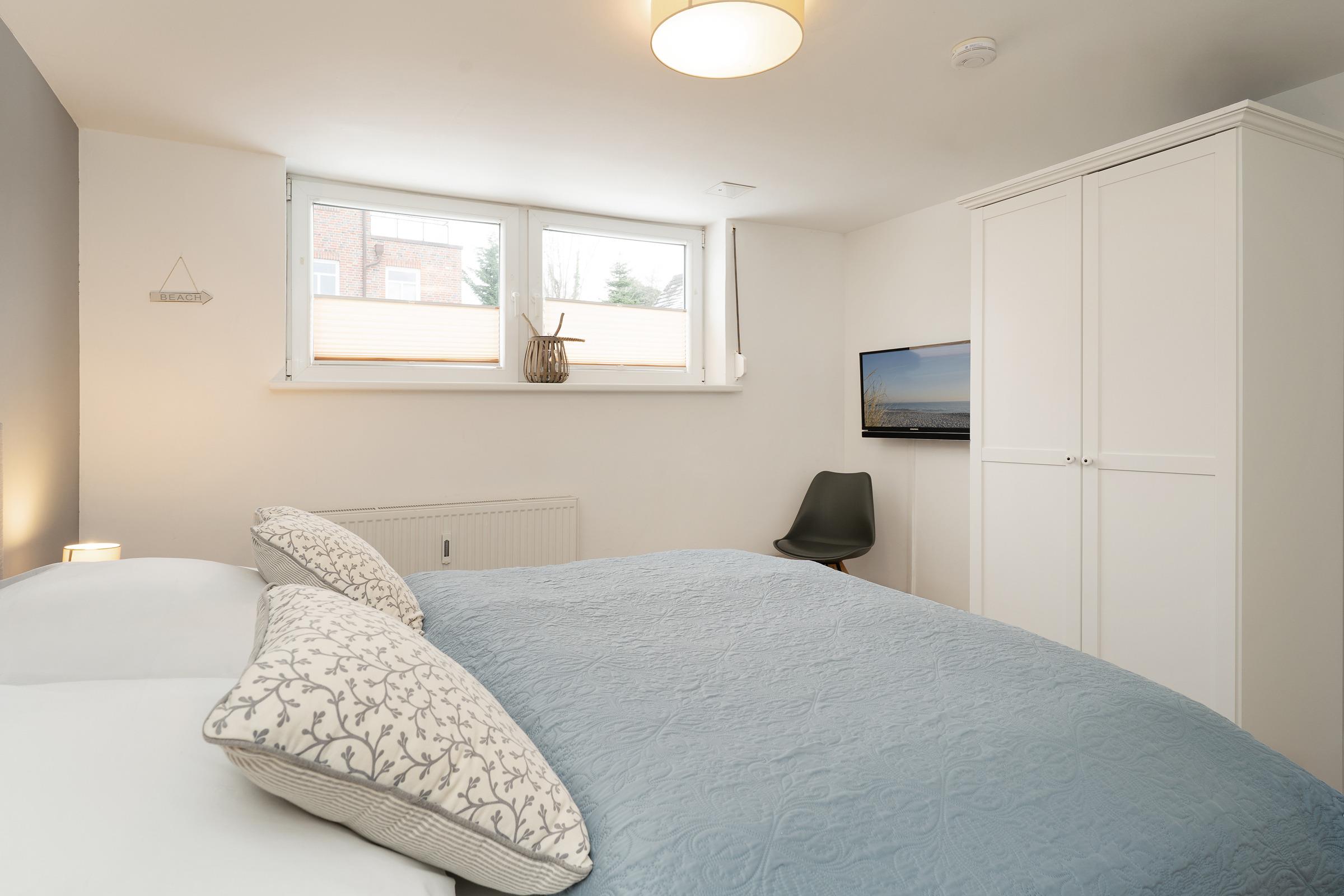 Schlafzimmer 2: 1 Boxspringdoppelbett (2x 90x200 cm mit durchgehendem Topper), Kleiderschrank, TV, Bad en suite, Verdunkelung: Rollladen, Platz für ein Babybett vorhanden