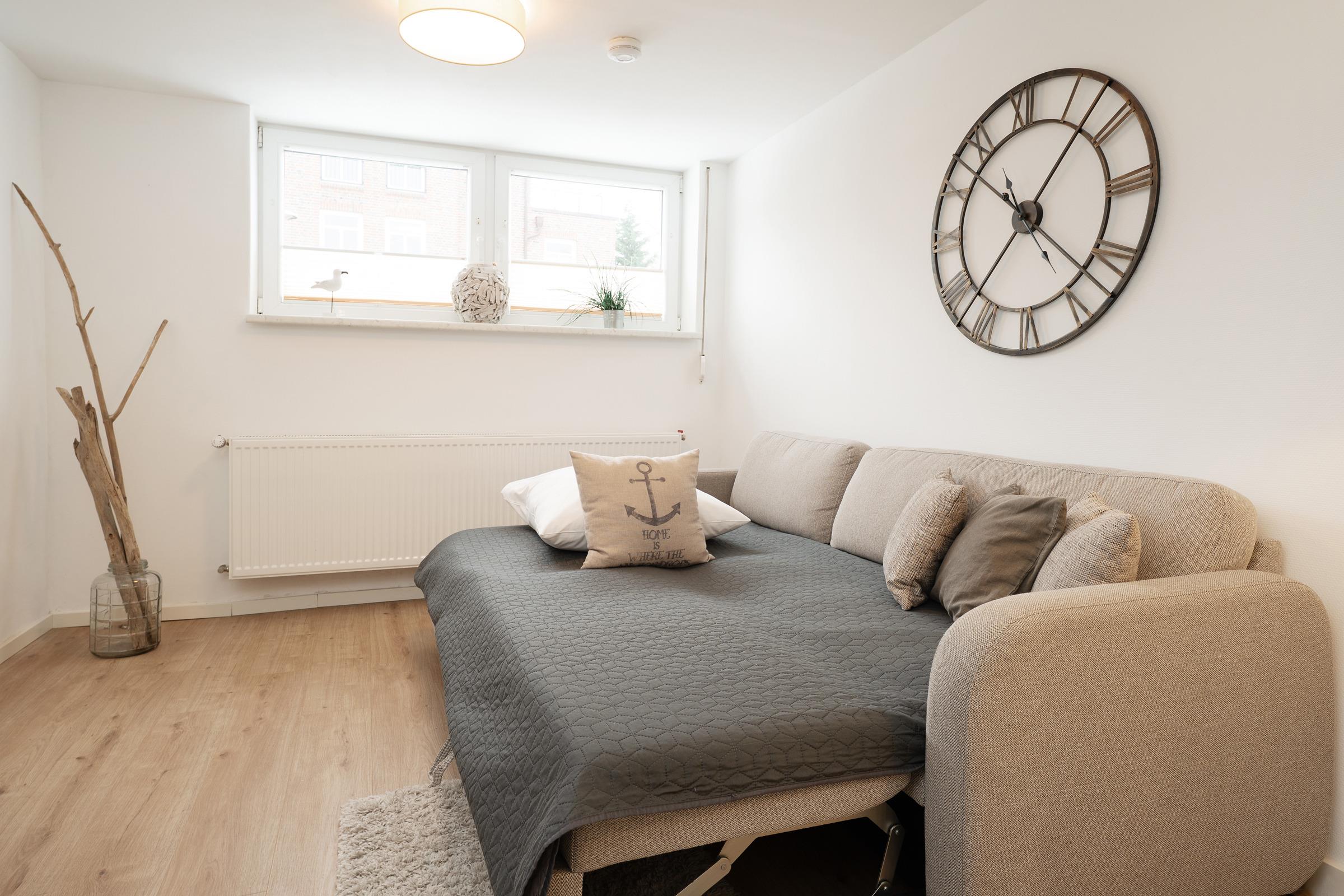 Wohn-/ Schlafzimmer: 1 Schlafsofa (140x200 cm), TV, Verdunkelung: Rollladen, Platz für ein Babybett vorhanden