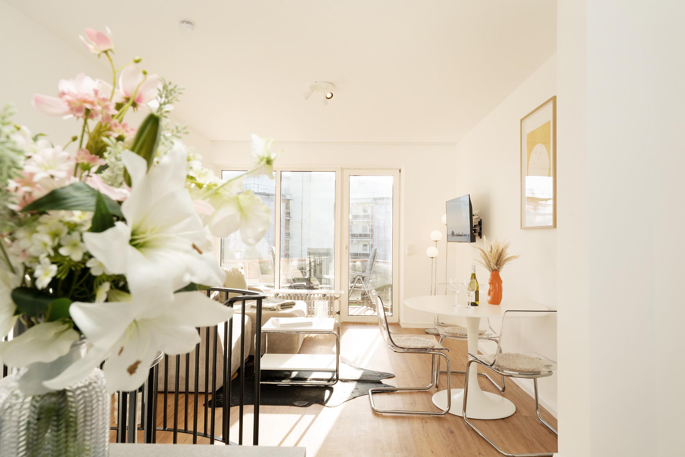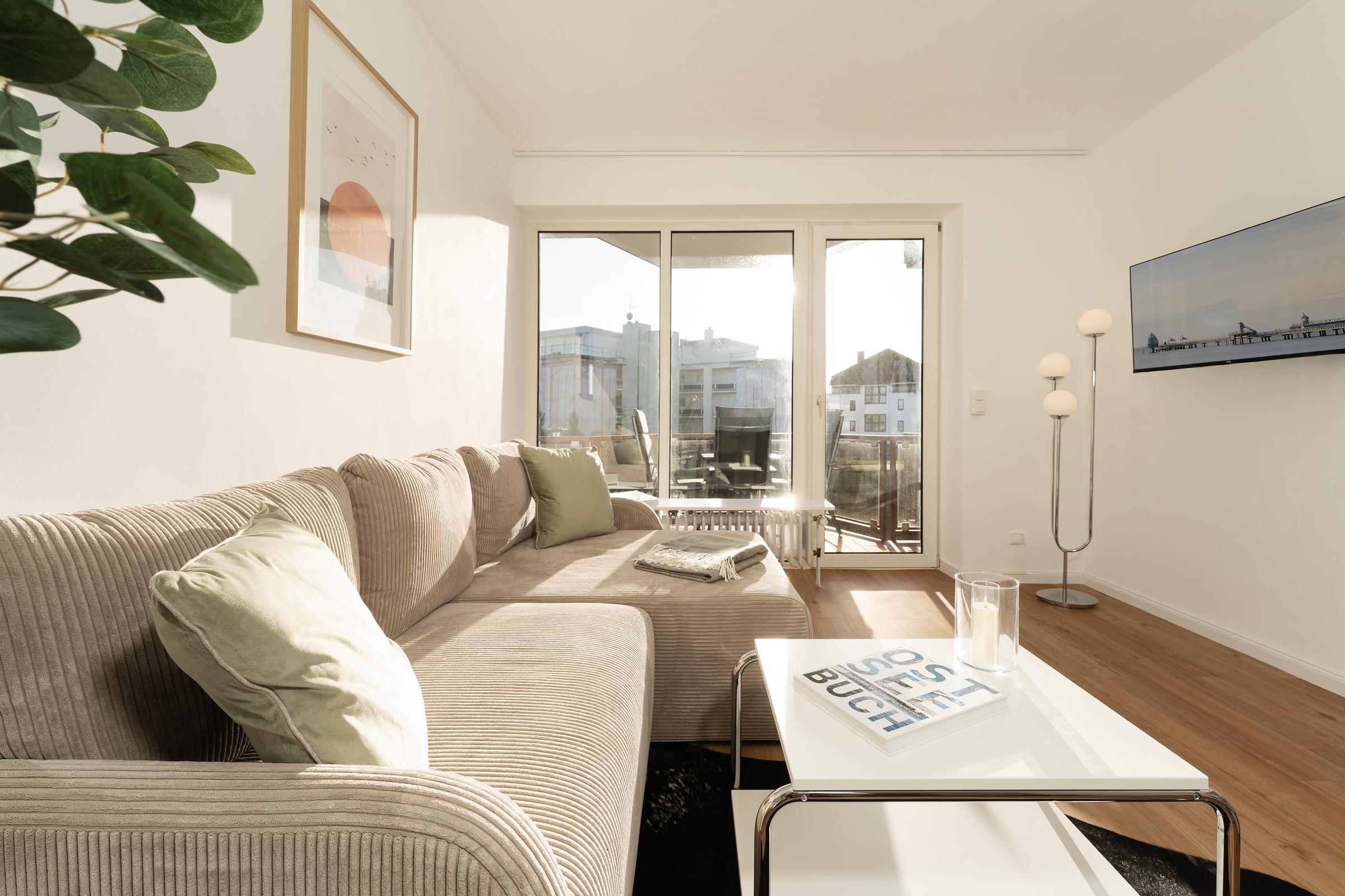 Willkommen in der Deichbude: Diese gemütliche Wohnung kombiniert modernen Komfort mit einer strandnahen Lage in Grömitz. Der Wohn- und Schlafbereich ist freundlich gestaltet und bietet ein Schlafsofa sowie einen Fernseher und ein Radio – ideal für entspannte Abende. Von hier aus gelangen Sie direkt auf einen der schönen möblierten Balkone, der nach Süden ausgerichtet ist und zum Verweilen einlädt.