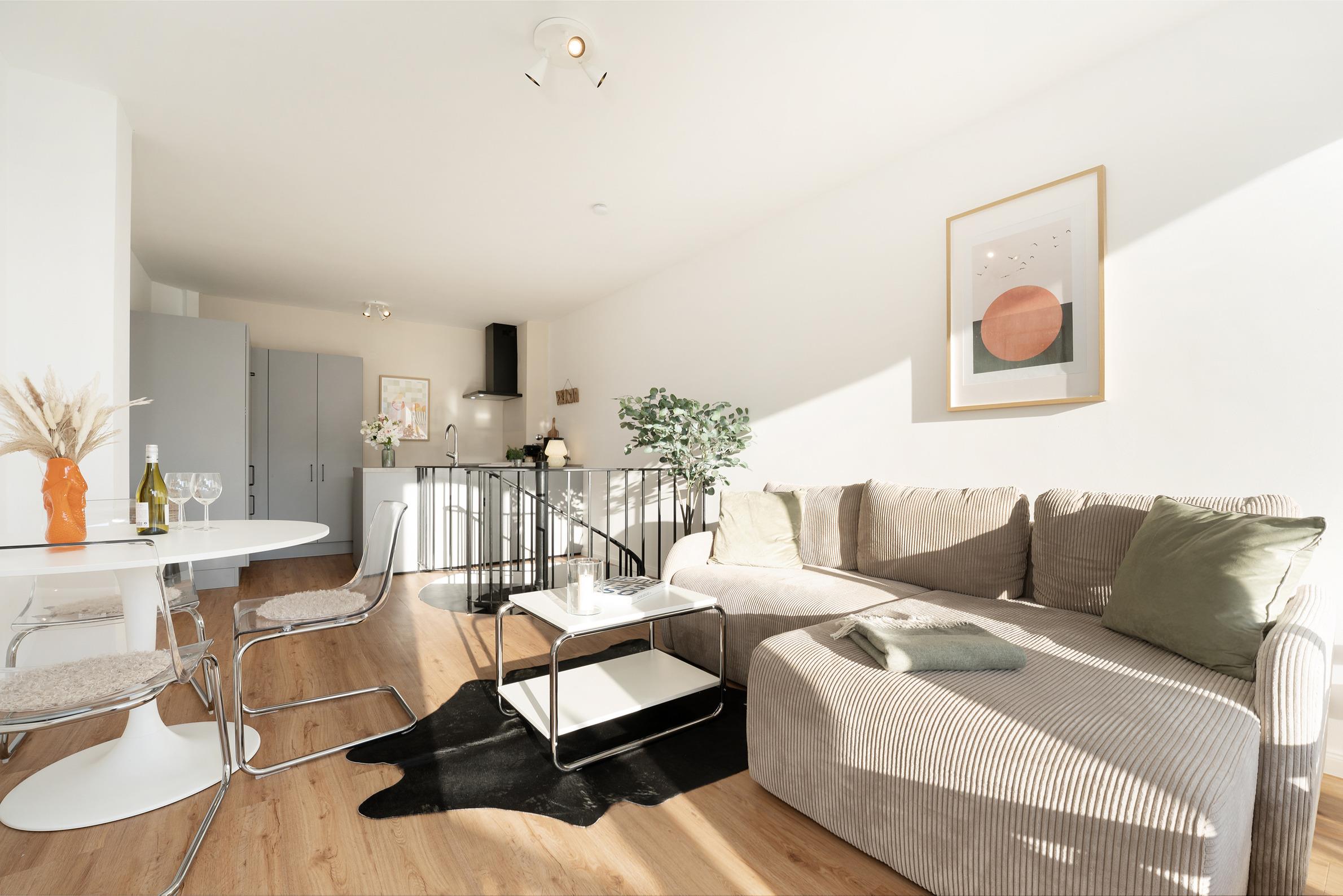 In der offenen Küche starten Sie morgens mit einem frischen Kaffee entspannt in den Tag. Der Essbereich grenzt harmonisch an und bietet ausreichend Platz für gemeinsame Mahlzeiten. Das gemütliche Sofa lässt sich abends in einen bequemen Schlafplatz für einen dritten Gast verwandeln. Im separaten Schlafzimmer sorgt ein komfortables Doppelbett für ruhige Nächte. Das modern ausgestattete Badezimmer verfügt über eine Dusche, WC und Haartrockner.