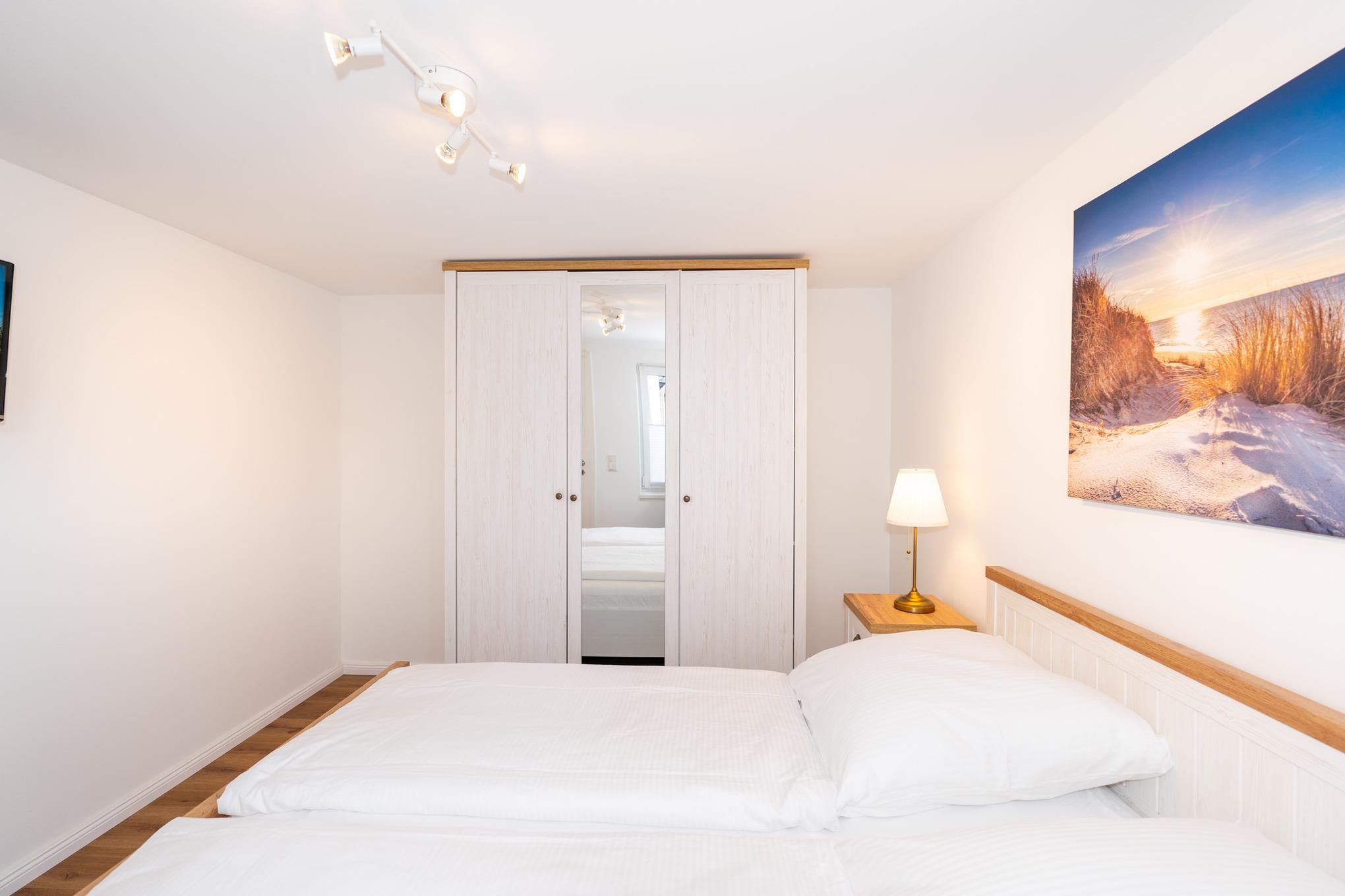 Ihnen stehen 2 Schlafzimmer mit jeweils einem Doppelbett (2x90x200), einem Kleiderschrank und zwei Nachttischen zur Verfügung. Highlight sind die jeweils an der Wand angebrachten Flat-TV.