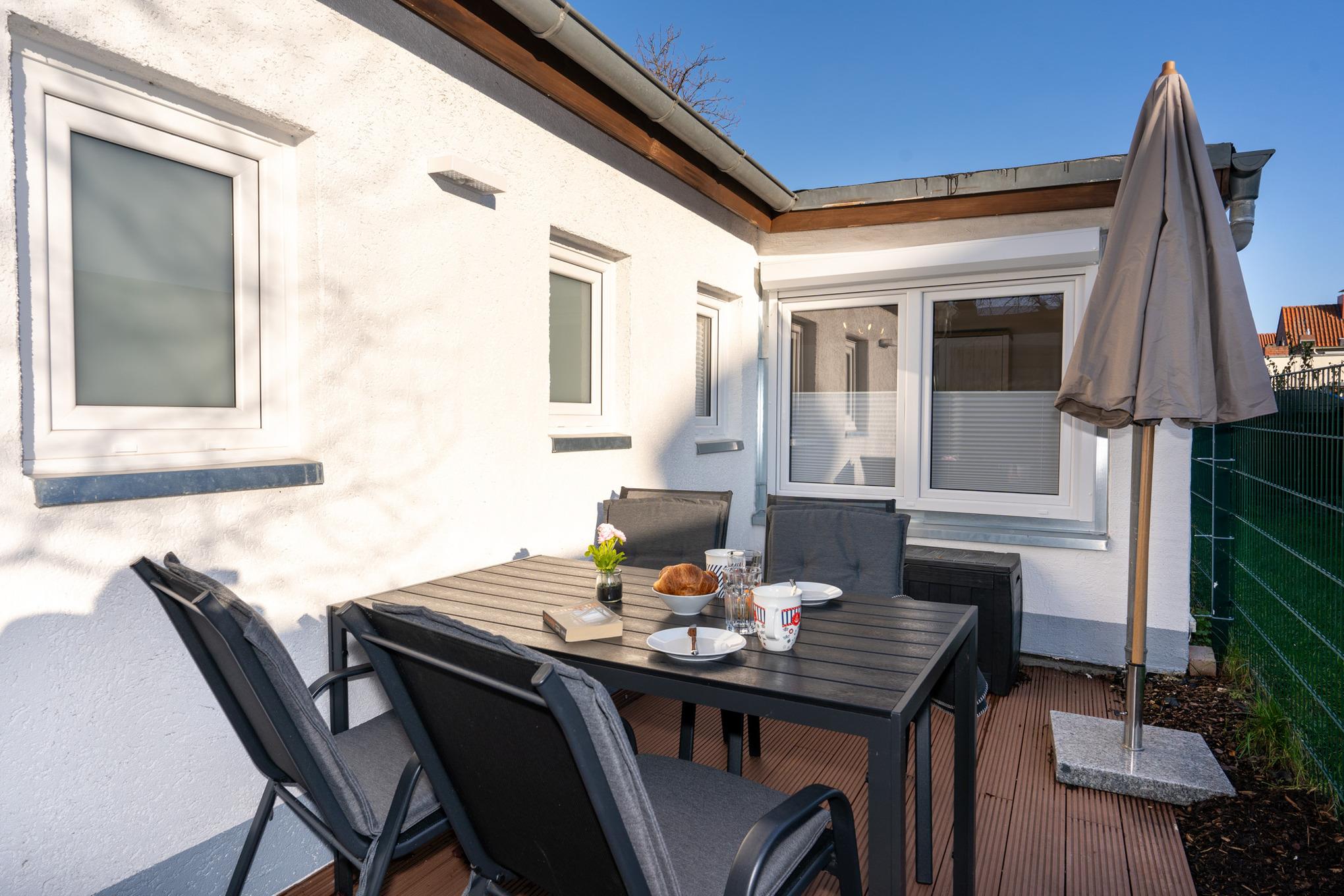 Entspannen Sie nach einem Strandtag auf Ihrer eigenen Terrasse die Sie mit einem Sonnenschirm beschatten können. Hier genießen Sie abseits neugieriger Blicke Ihre Ruhe.