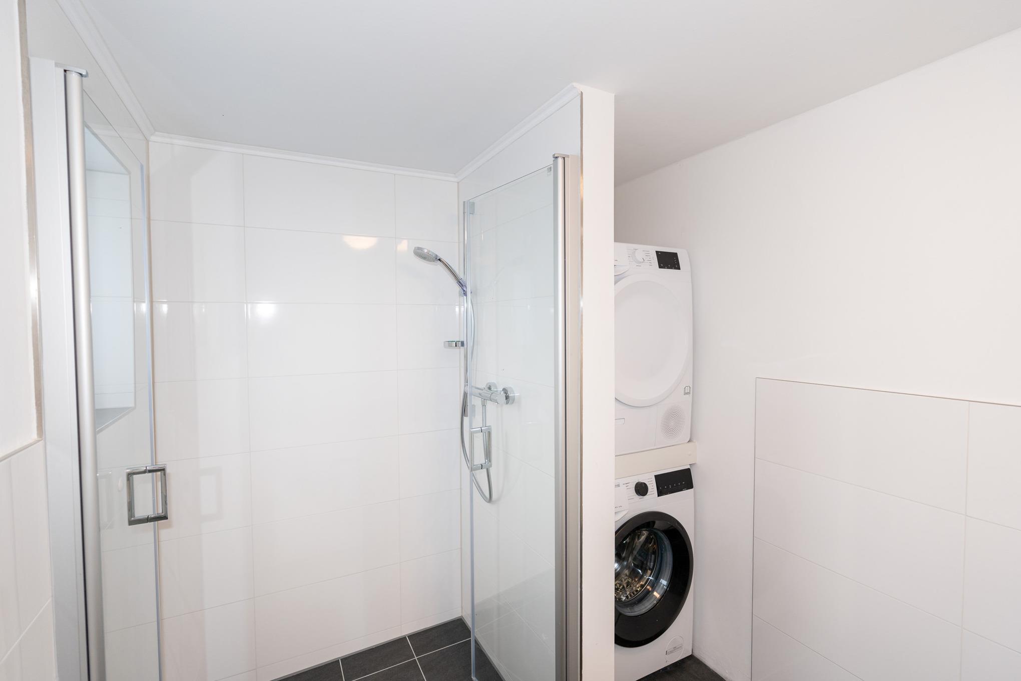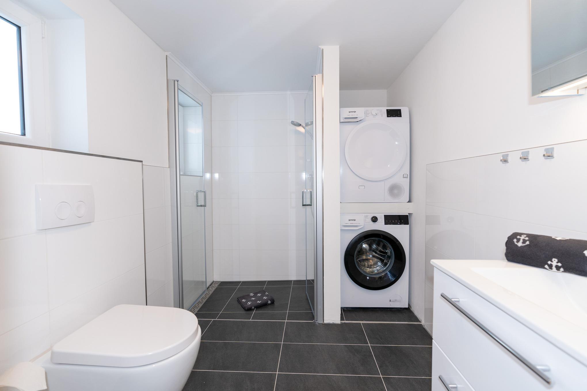 Das großzügige Badezimmer mit Fenster verfügt über eine breite und barrierefreie Dusche, ein WC und einen Waschtisch mit Schubladen. Ein beleuchteter Spiegelschrank sorgt für weitere Ablagemöglichkeiten. Die Fußbodenheizung und der zusätzliche Handtuchheizkörper sorgen ein angenehmes Wohlbefinden. Eine Waschmaschine und ein Trockner, welche Ihnen kostenlos zur Verfügung stehen, runden dieses perfekte Bad ab.