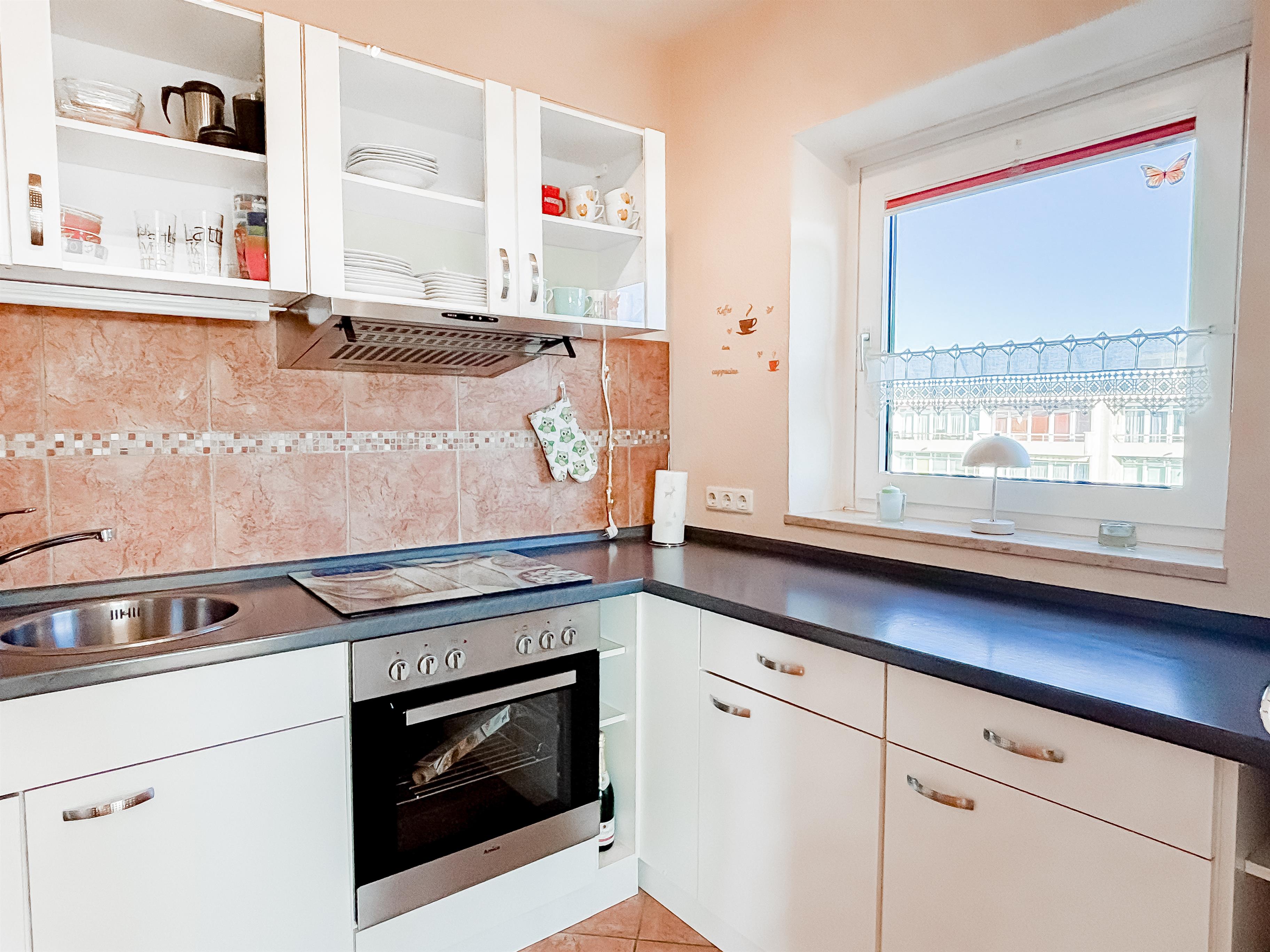 Küche: Die offene Küche zum Wohnbereich ist mit E-Herd-Ceranfeld, Backofen, Mikrowelle, Kühlschrank-3-Sterne-Gefrierfach und den üblichen Küchengeräten gut ausgestattet.