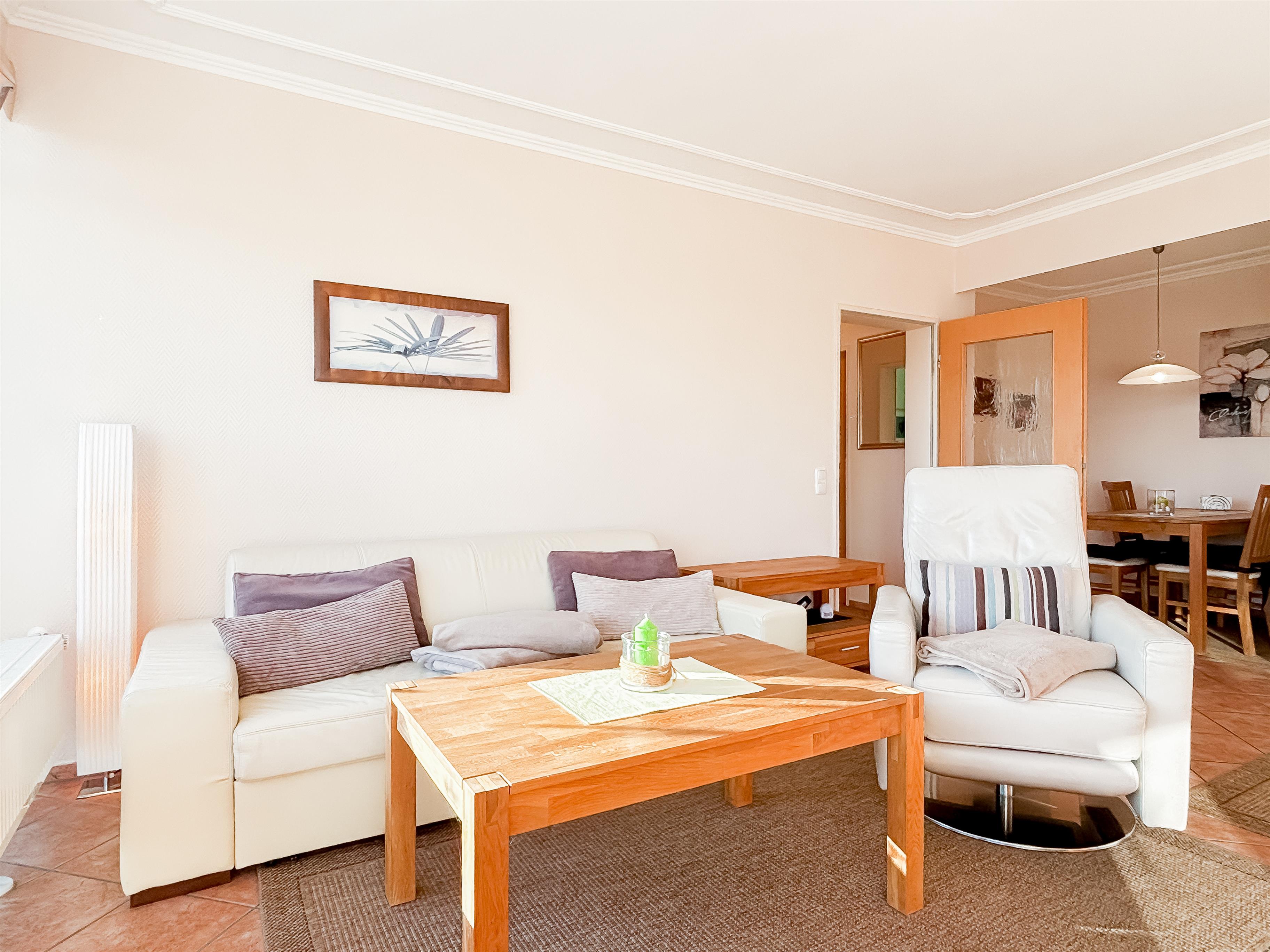 Wohnzimmer: Im hellen geräumigen Wohnbereich befindet sich ein Essplatz für 4 Personen und ein Ecksofa zum Ausziehen, sowie ein bequemer Fernsehsessel und TV. Eine sonnige Loggia mit Markise gehört ebenfalls dazu. Von hier geniessen Sie einen herrlich weiten Blick über das Meer.