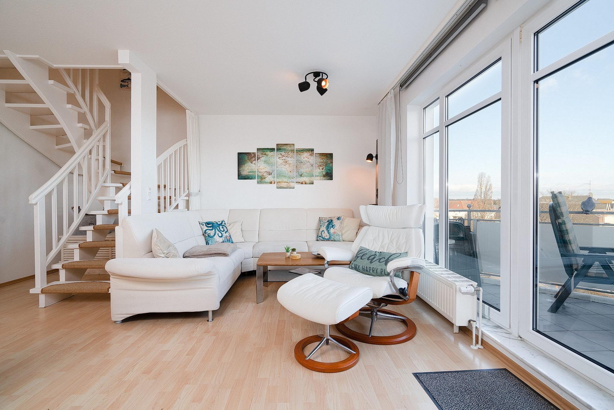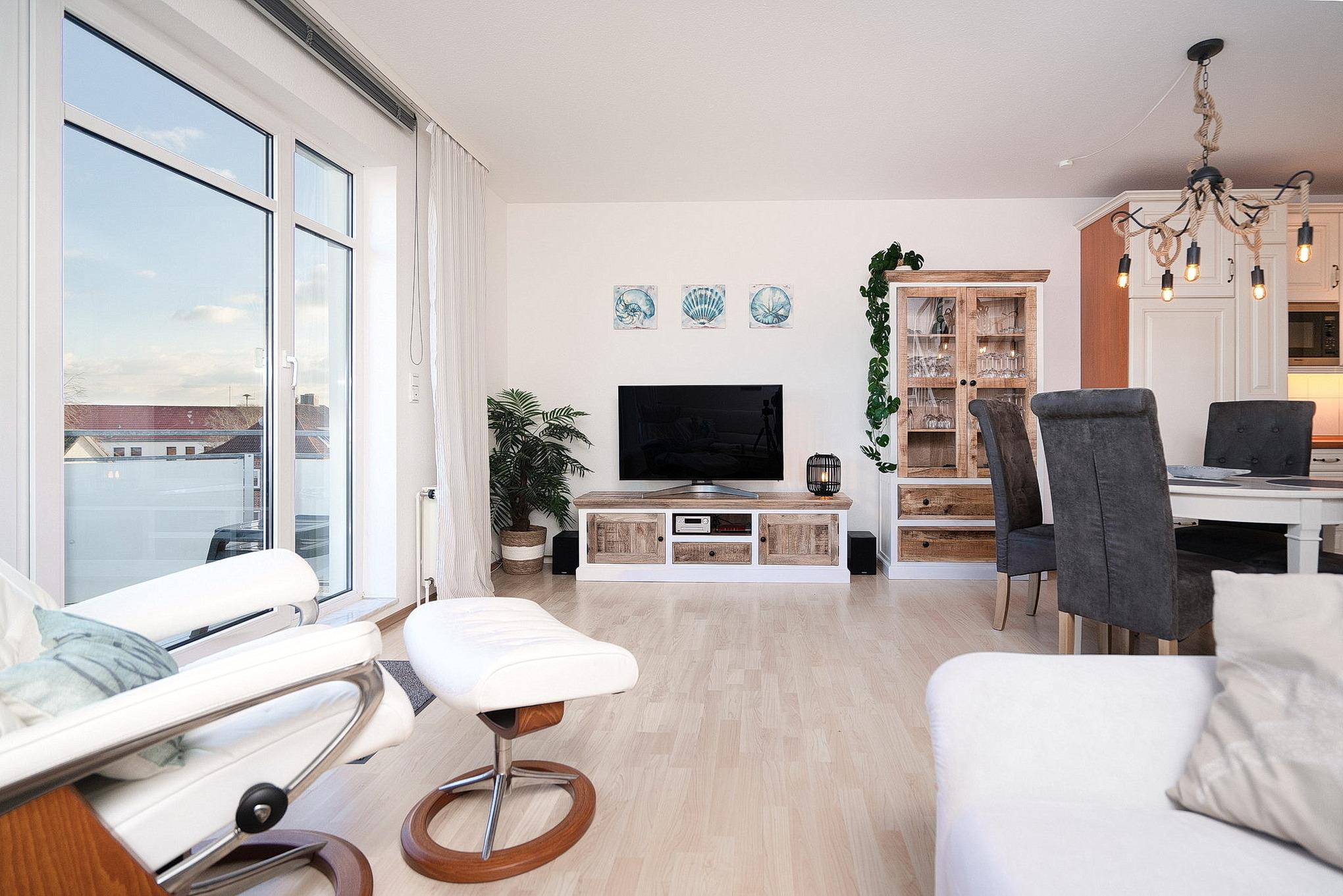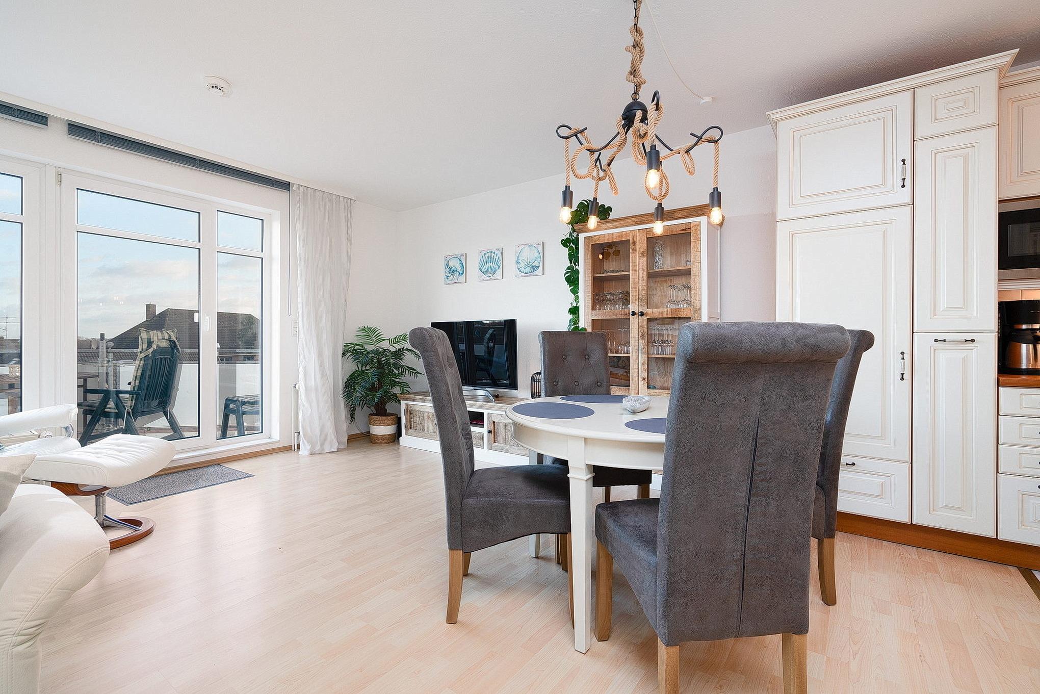 Moderne Ferienwohnung in Grömitz mit Balkon, Aufzug und zentraler Lage nahe Kurpark und Einkaufsmöglichkeiten.