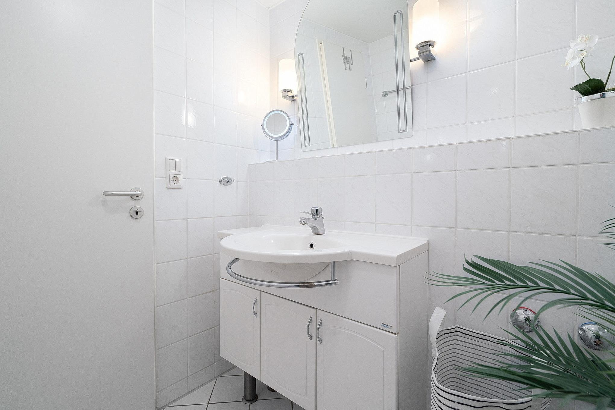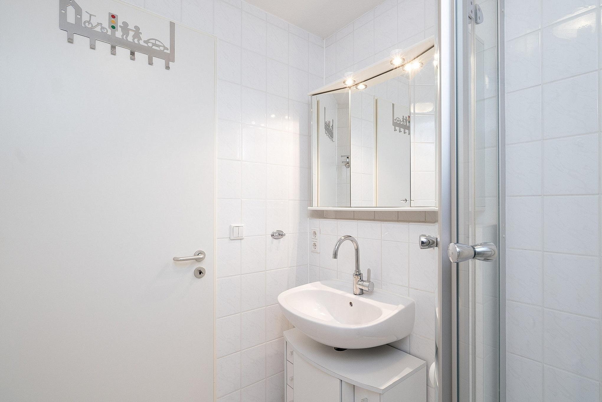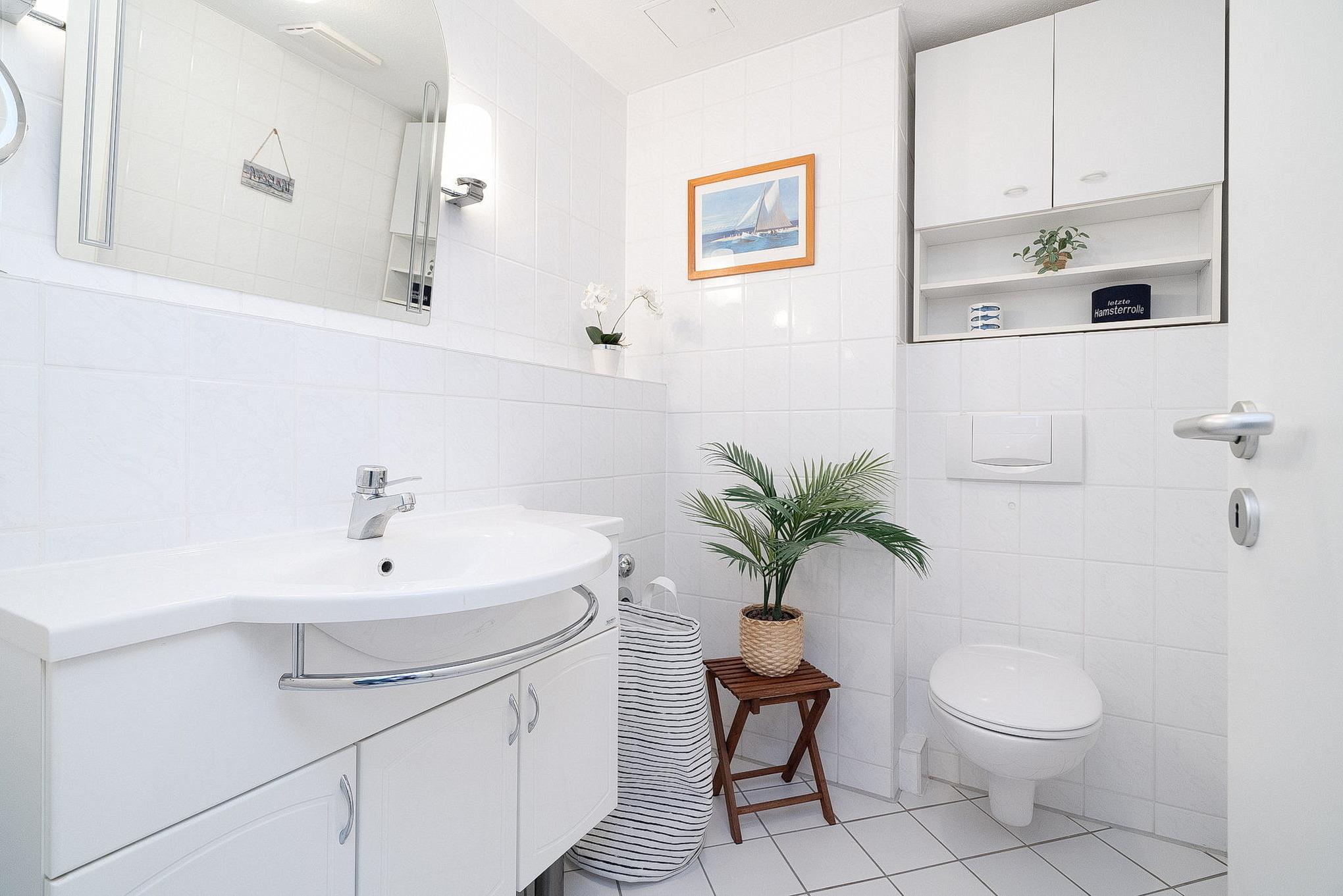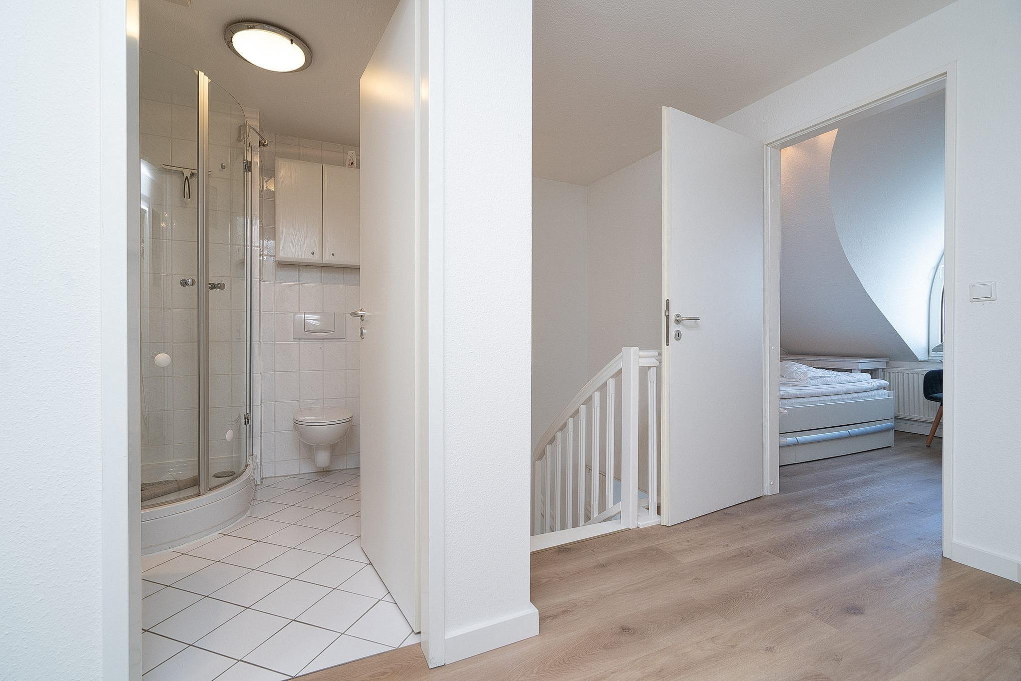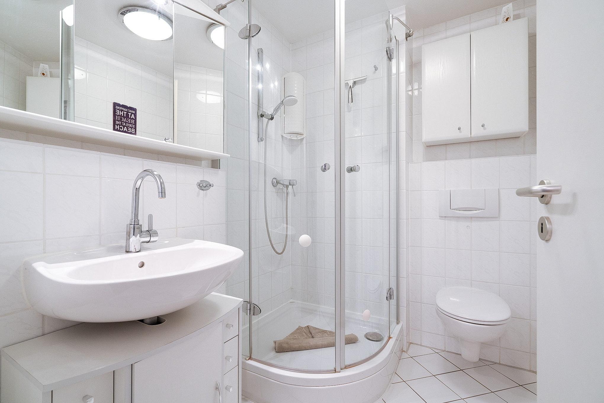 Helles Badezimmer mit Dusche, WC und Waschbecken. Es steht Ihnen ein weiteres Gäste-WC zur Verfügung.