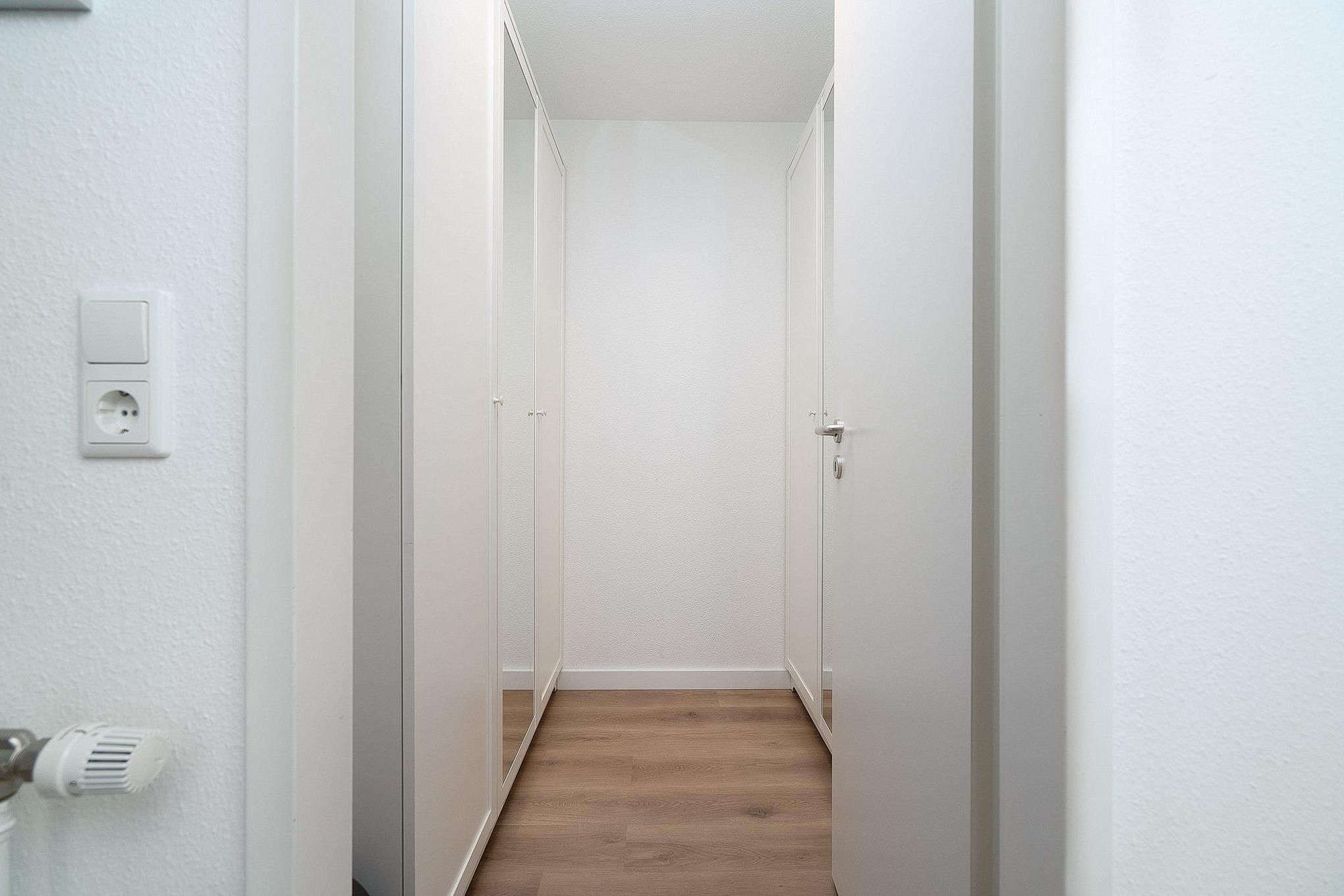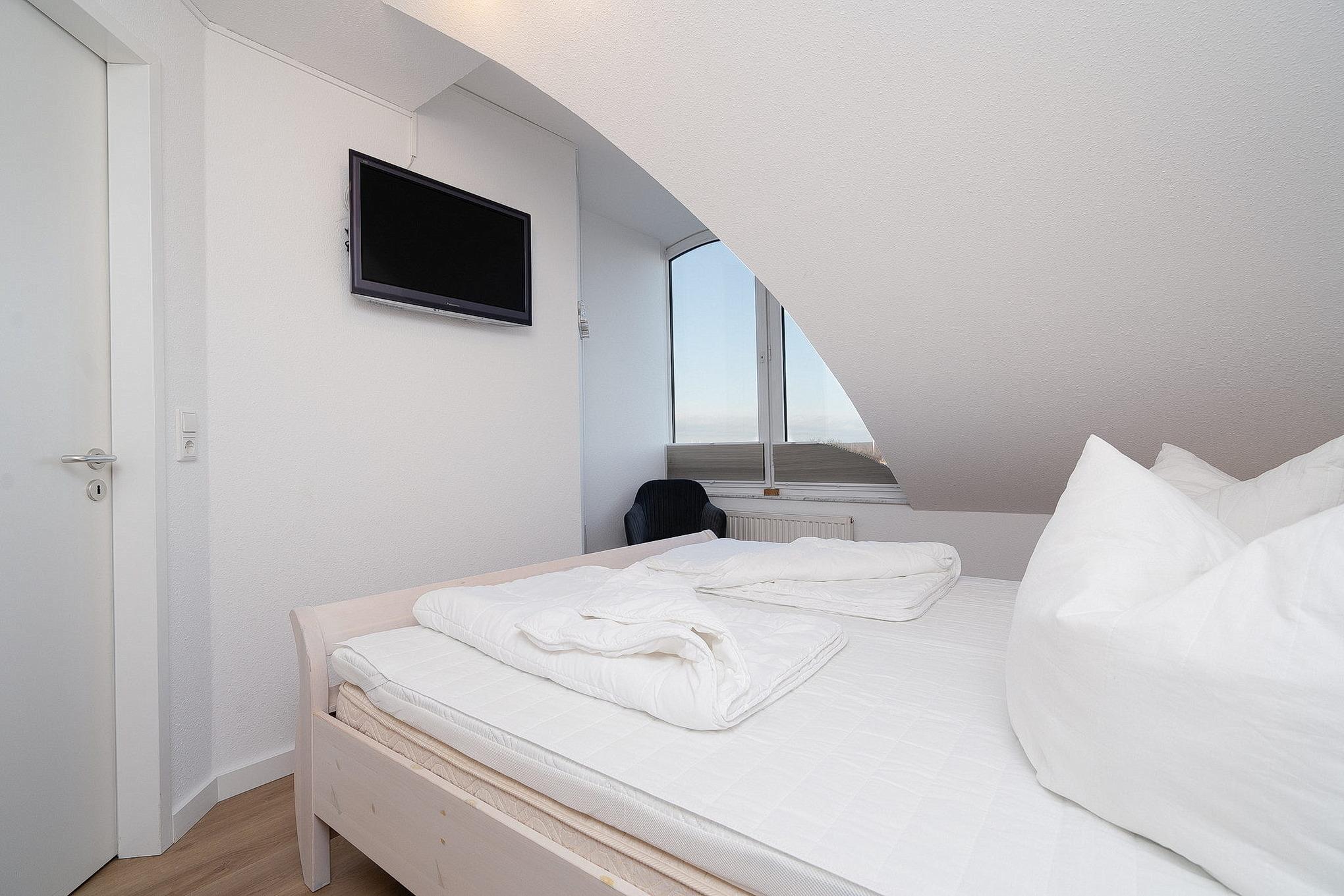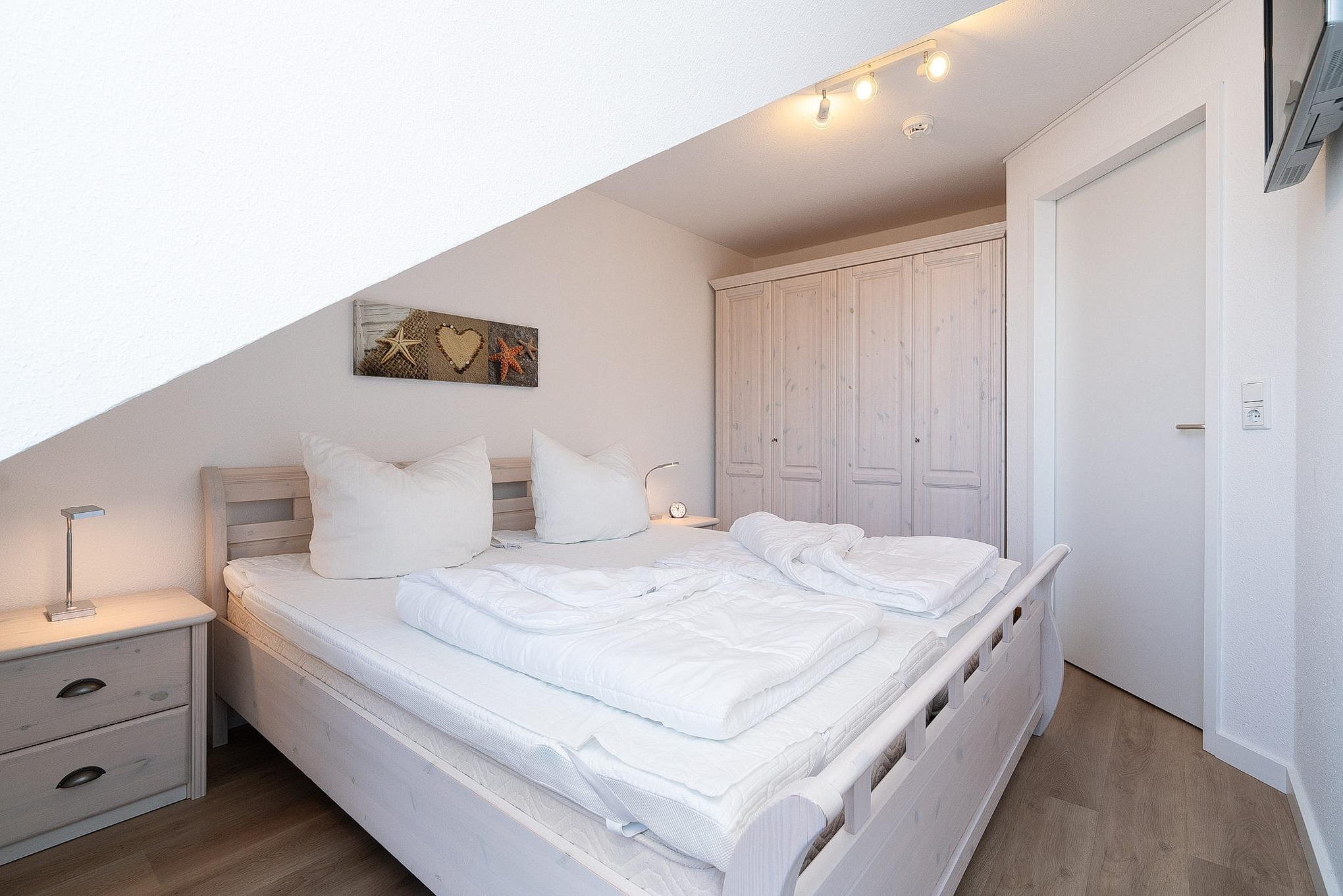 Das Schlafzimmer ist mit einem Doppelbett (2x90x200cm) und einem Kleiderschrank ausgestattet. Auch hier steht ein wandmontierter TV zur Unterhaltung bereit. Der Schlafbereich ist mit Laminat ausgelegt und lässt sich durch ein Plissee blickdicht verdunkeln.