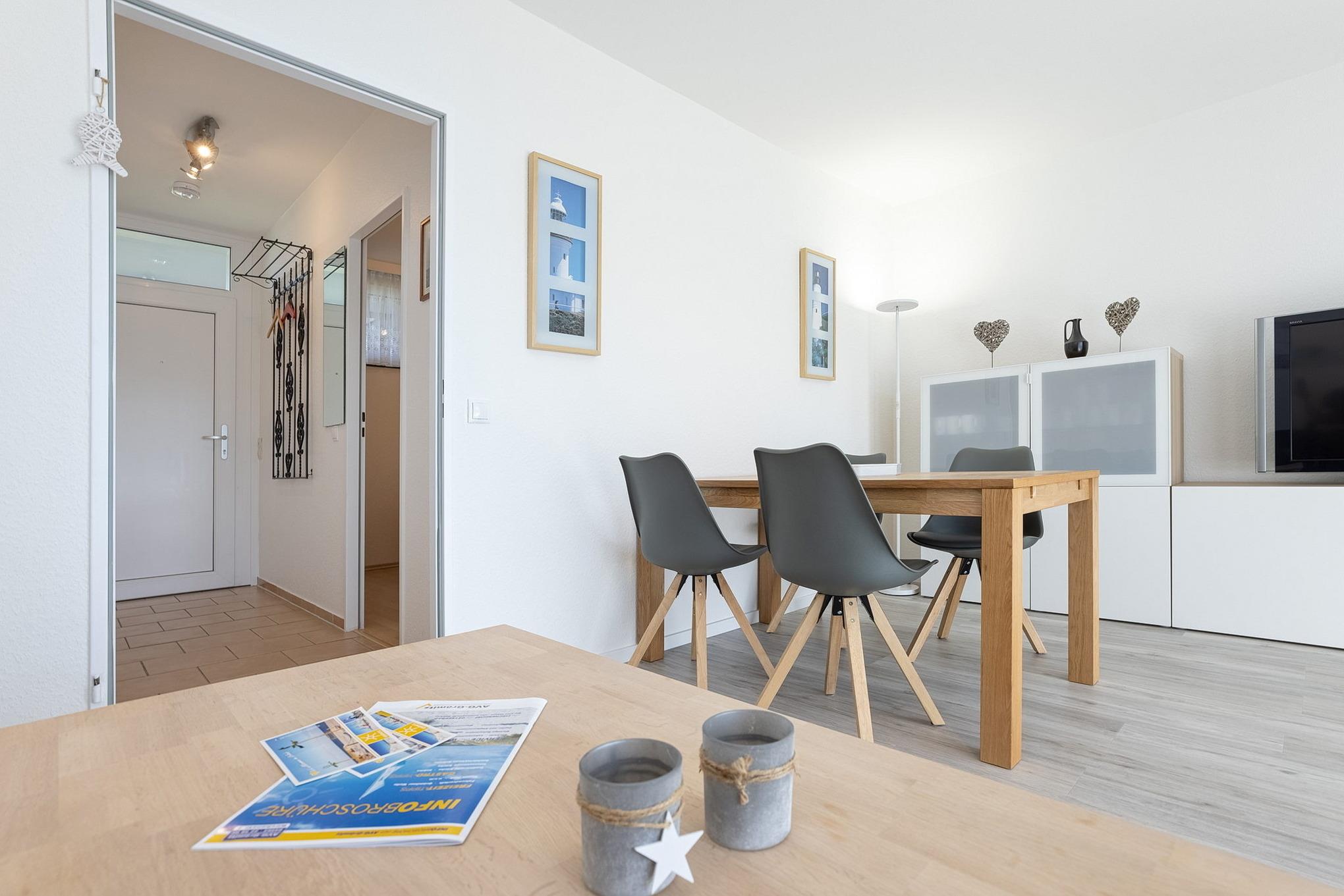Modernes, helles Wohn- und Esszimmer mit direktem Zugang zum Balkon. Das Wohn- und Esszimmer ist mit Laminatboden ausgelegt. Das Wohn- und Esszimmer ist mit einem Leder-Schlafsofa mit Bettfunktion (Liegefläche 157 x 231cm), einem Esstisch für 4 Personen und einer Schrankwand ausgestattet. Zur Unterhaltung steht ein Fernseher, ein DVD-Player und eine Mini-Stereoanlage mit Radio, CD und Kassettenfach zur Verfügung.