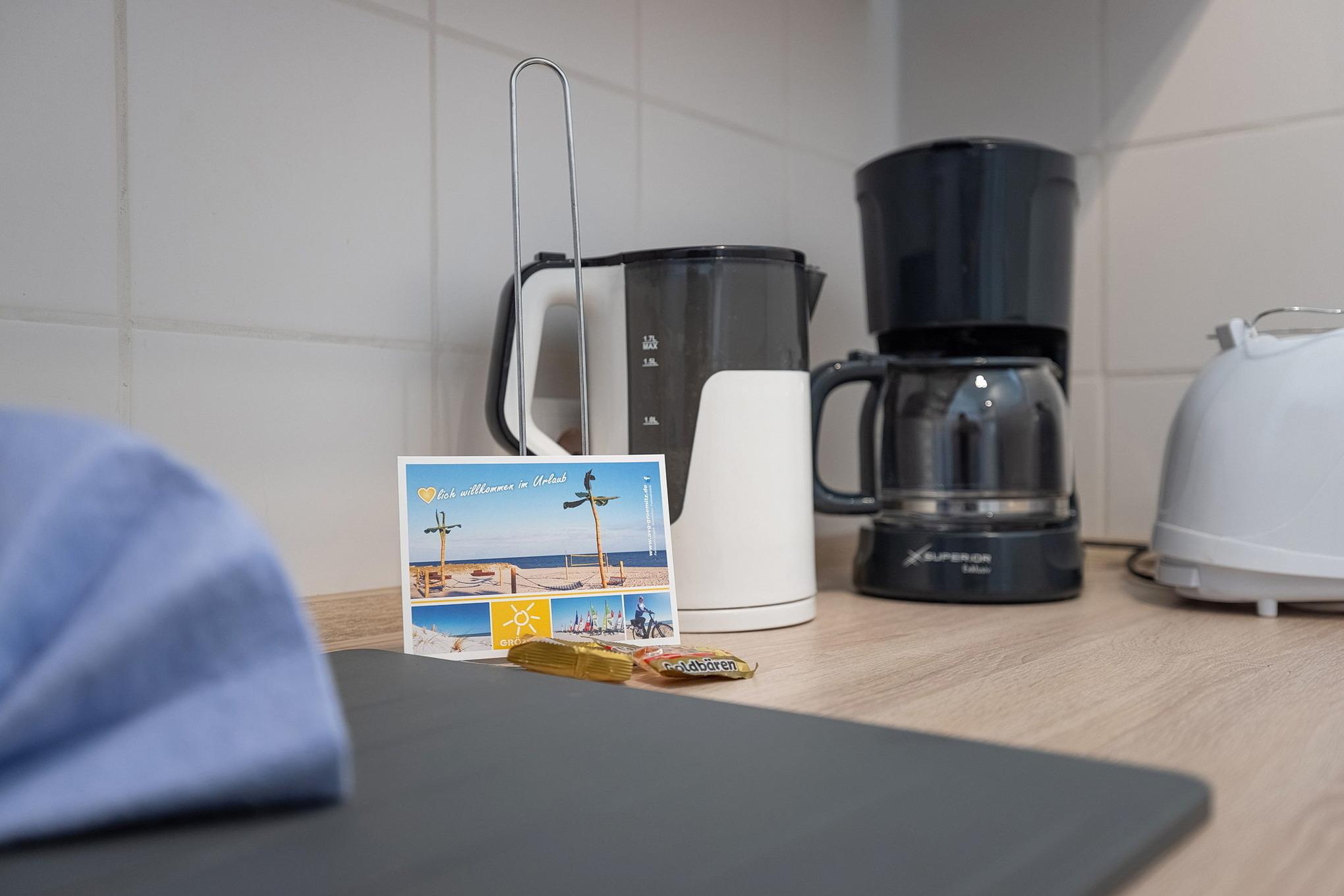 Moderne, komplett ausgestattete Küche mit einem Cerankochfeld, Kühlschrank mit kleinem 3-Sterne Gefrierfach, Backofen, Wasserkocher, Kaffeemaschine und Toaster.