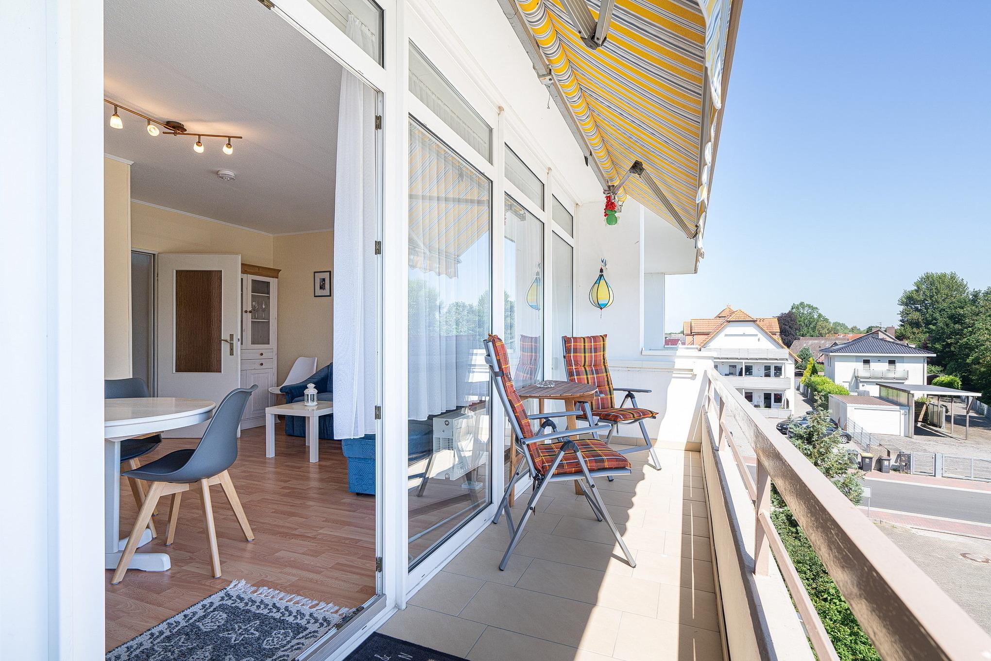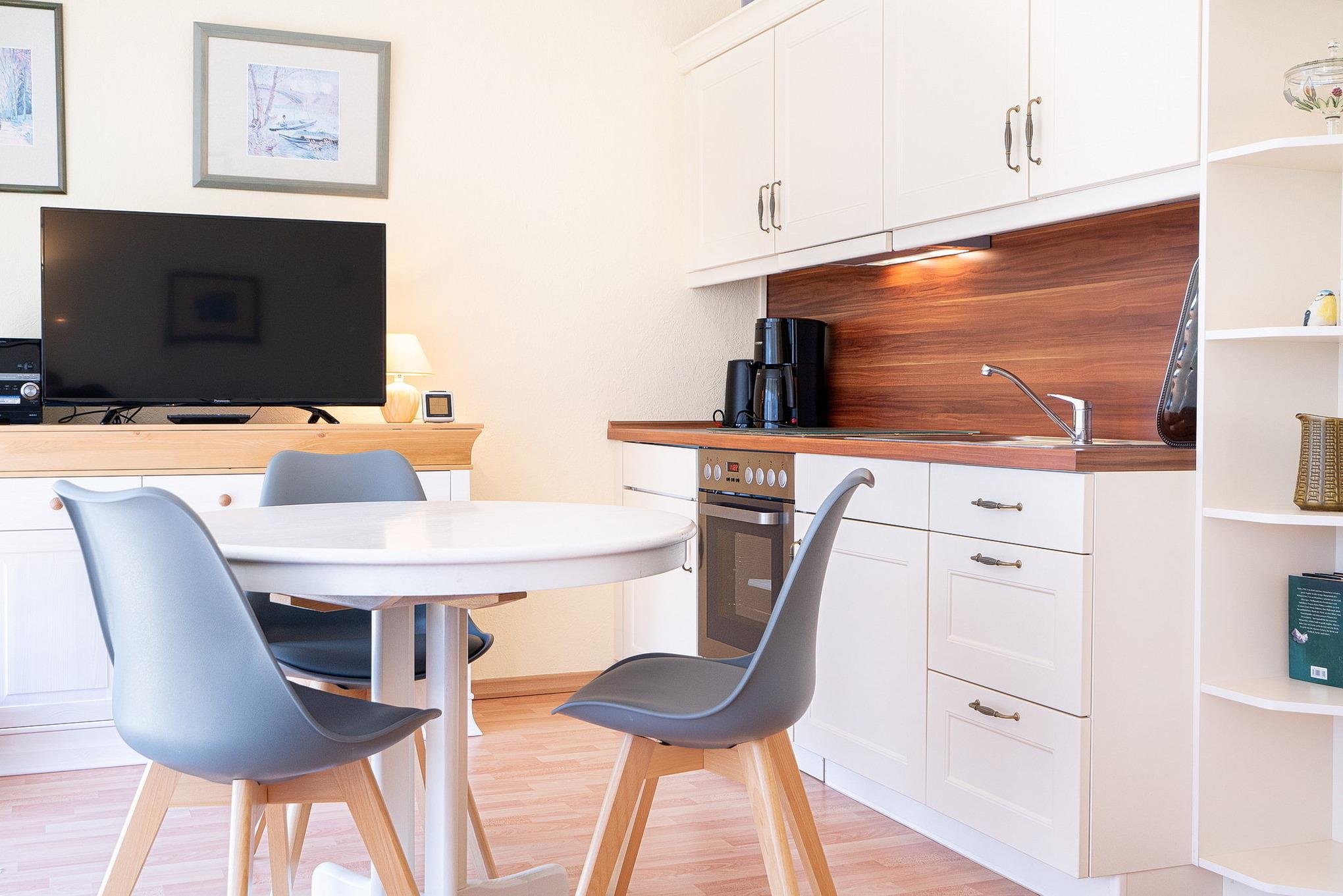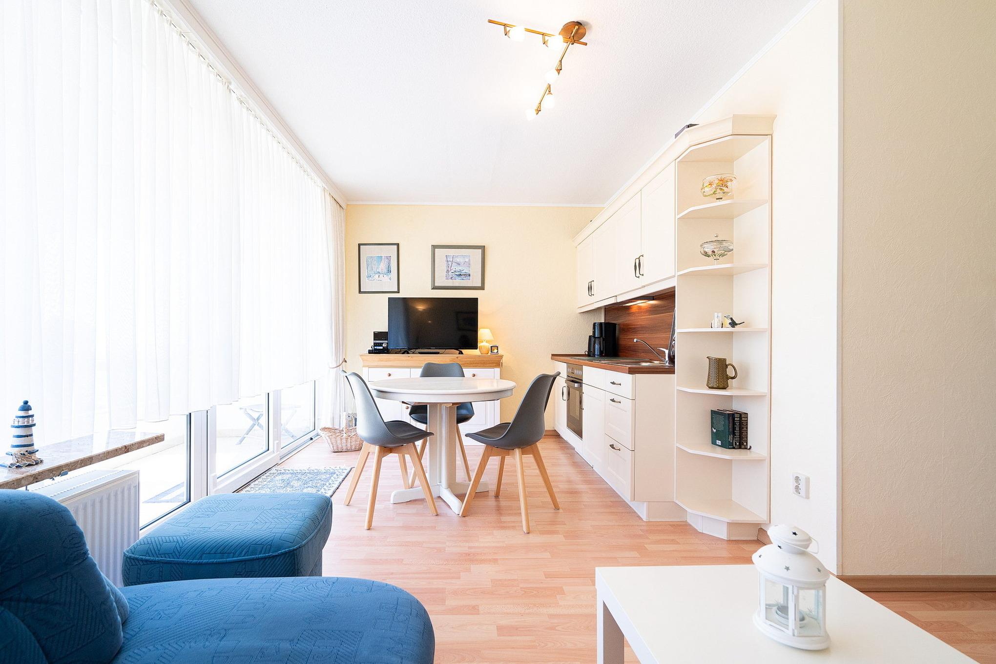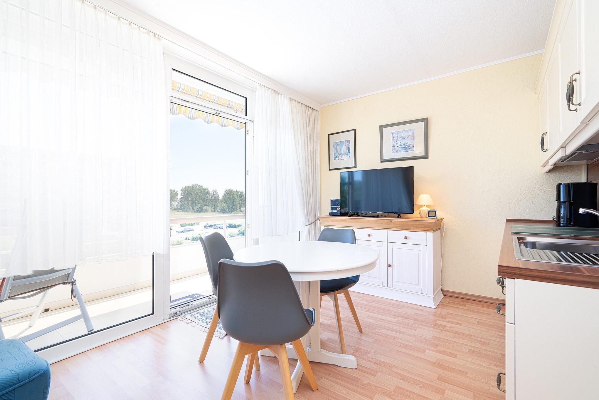 Gemütliches Wohn- und Esszimmer mit direktem Zugang zum sonnigen Balkon mit Blick auf den Deich und seitlichem Seeblick. Das Wohn- und Esszimmer ist mit einem Essplatz für 3 Personen, einem Wohnzimmerschrank, einer Schlafcouch und einem Couchtisch ausgestattet. Des Weiteren stehen ein Fernseher und eine kleine Hifi-Anlage zur Verfügung.