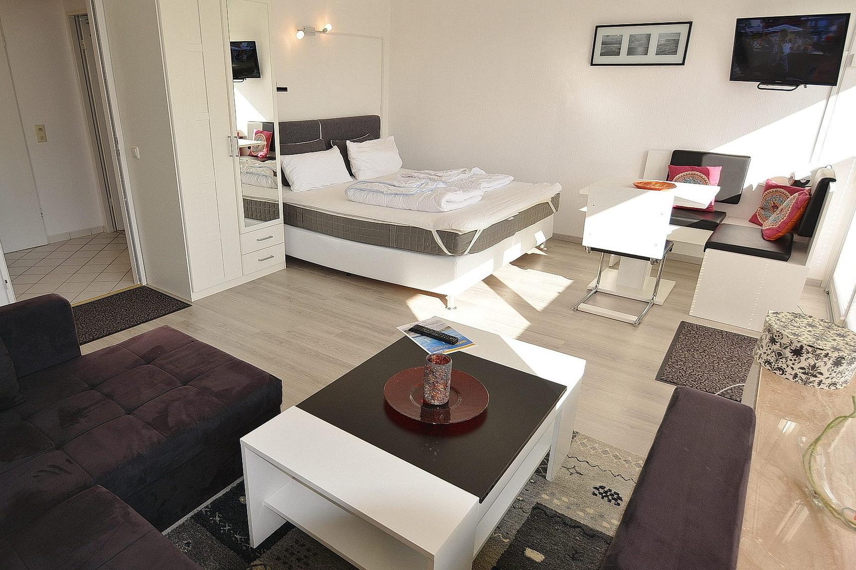 Modern ausgestattetes Wohn-/Schlafzimmer mit direktem Zugang zum Balkon in östliche Richtung. Das Wohn-/ Schlafzimmer ist mit einem Boxspringbett (180 x 200 cm), einem 2-türigen Kleiderschrank, einer kleinen Eck-Couch, einem Couchtisch, einem Essplatz für 4 Personen und einer Kommode ausgestattet. Zur Unterhaltung stehen ein Flachbildschirm (Kabel-TV) und eine Mini-Stereoanlage mit CD-Player zur Verfügung. Das Zimmer ist mit Laminat-Fußboden ausgelegt. Die Wohnung verfügt über Innenjalousien für Sicht- und Sonnenschutz. Eine komplette Abdunklung des Raumes wird dadurch nicht erzielt.