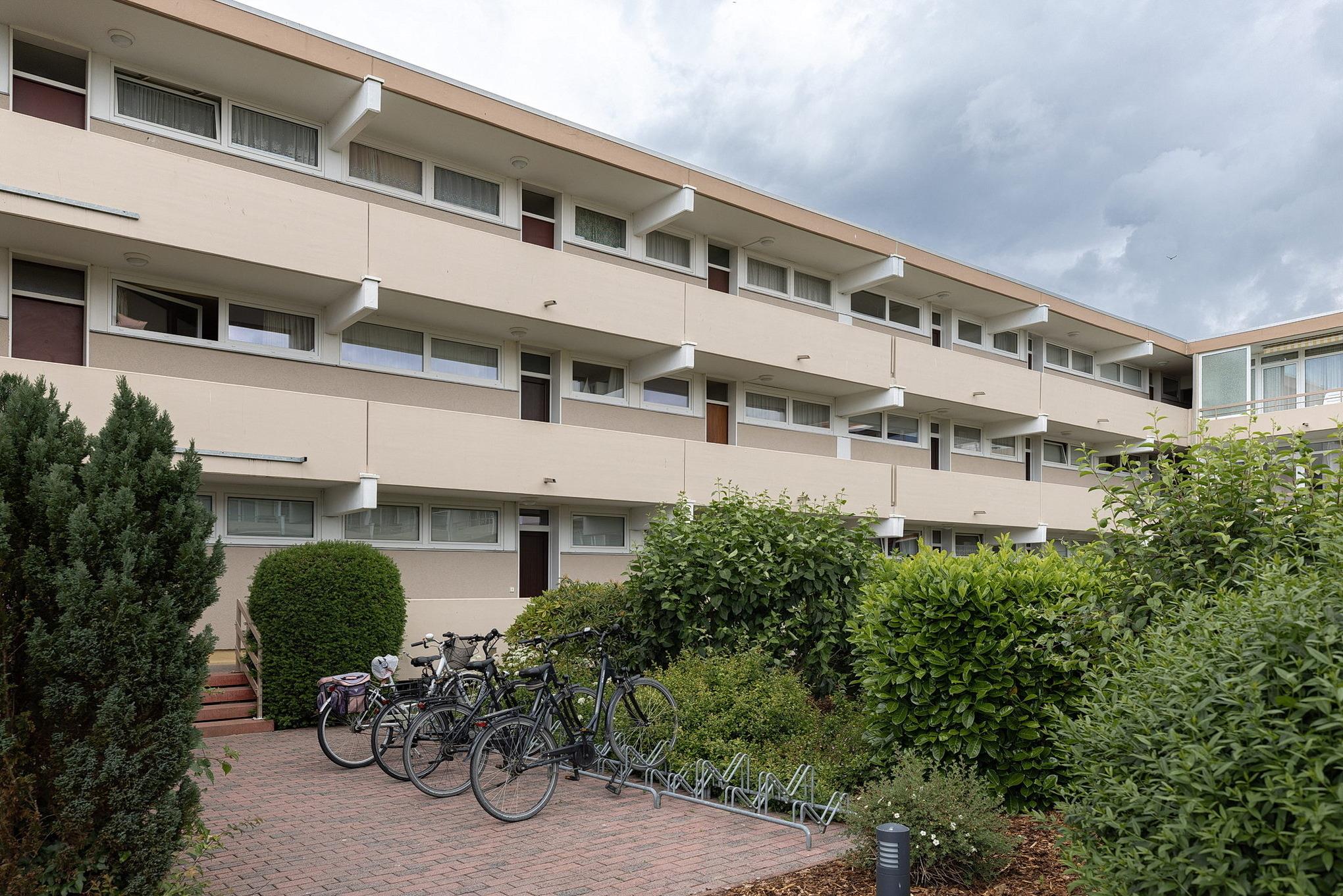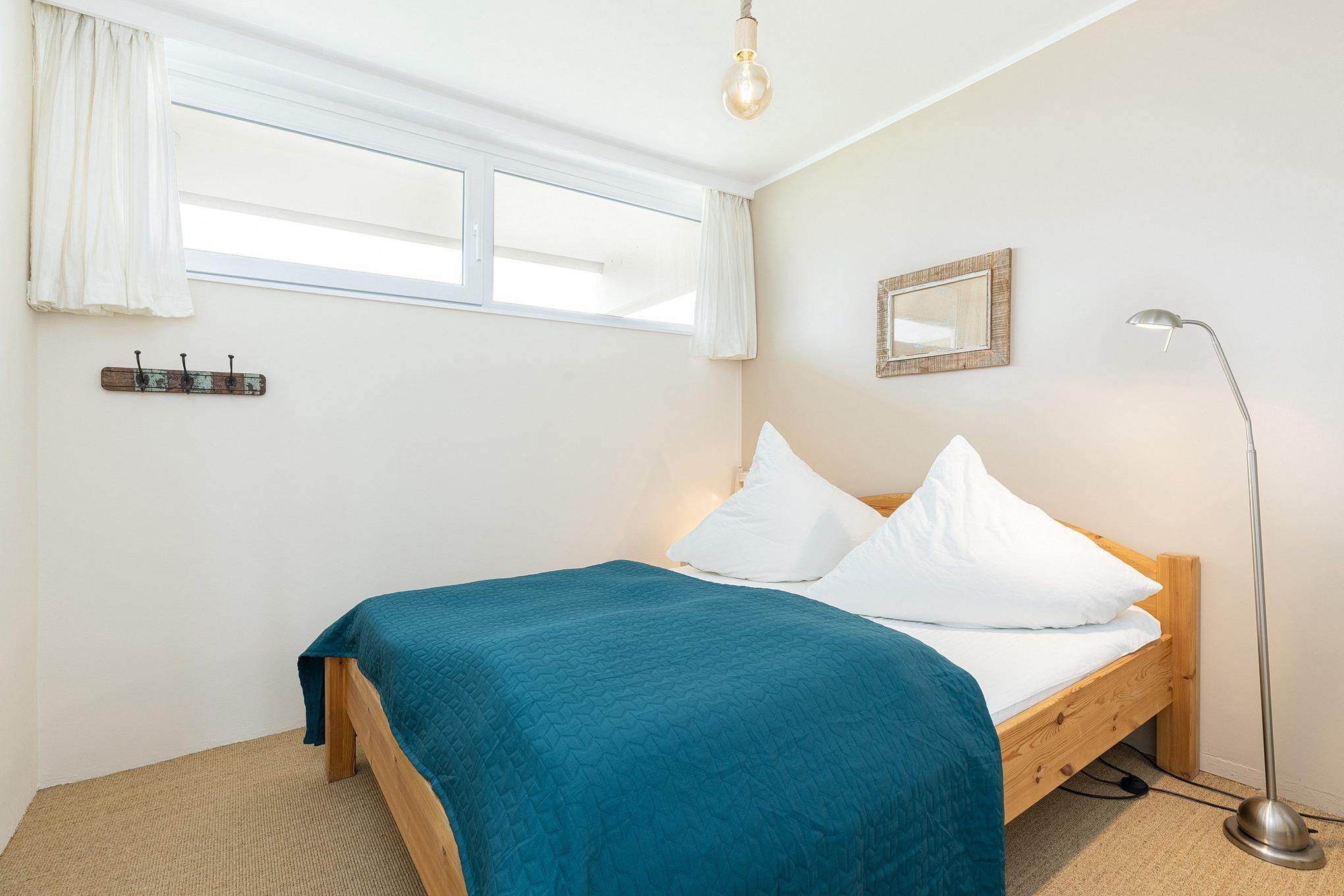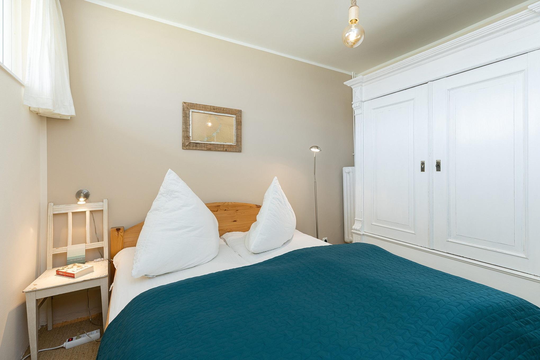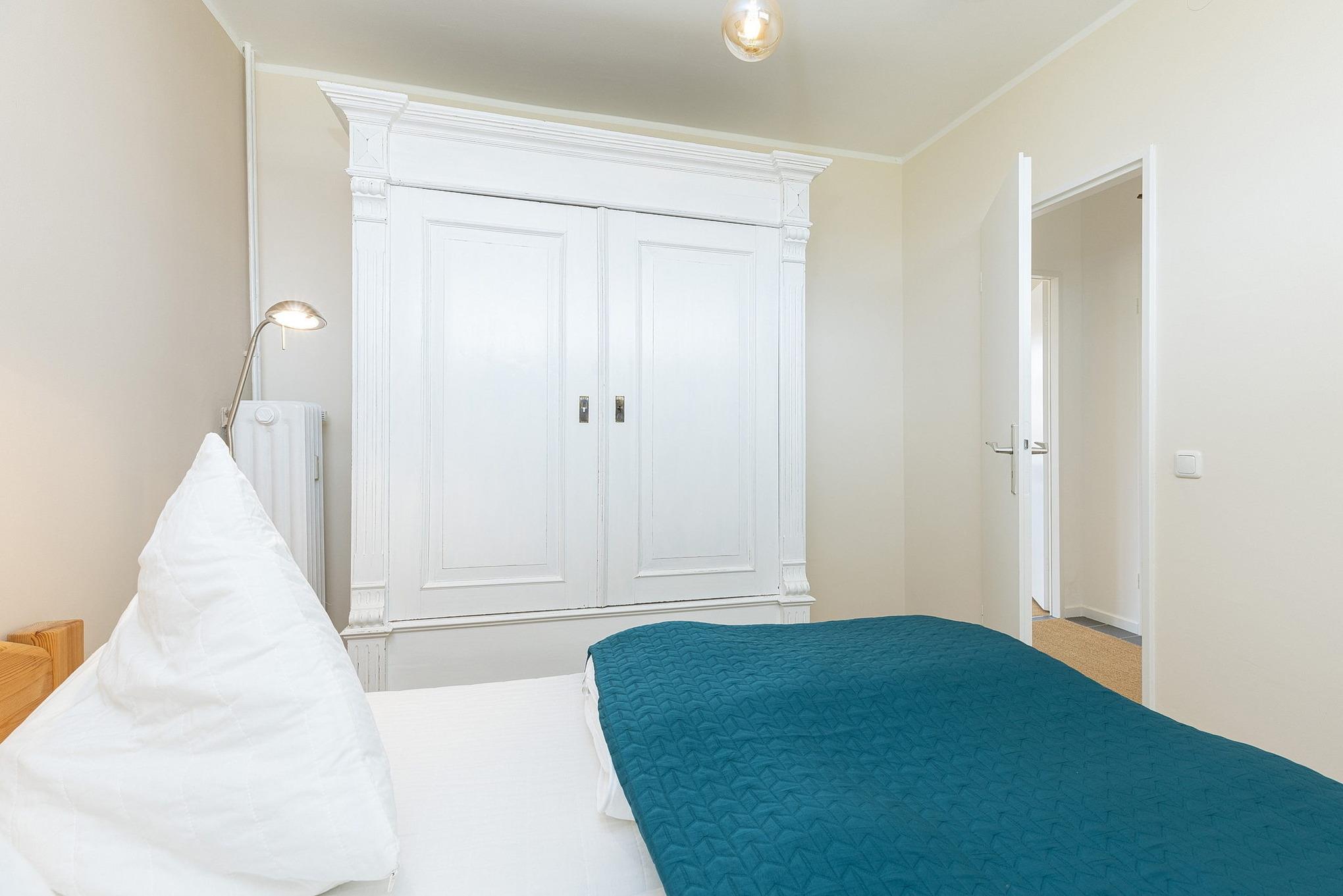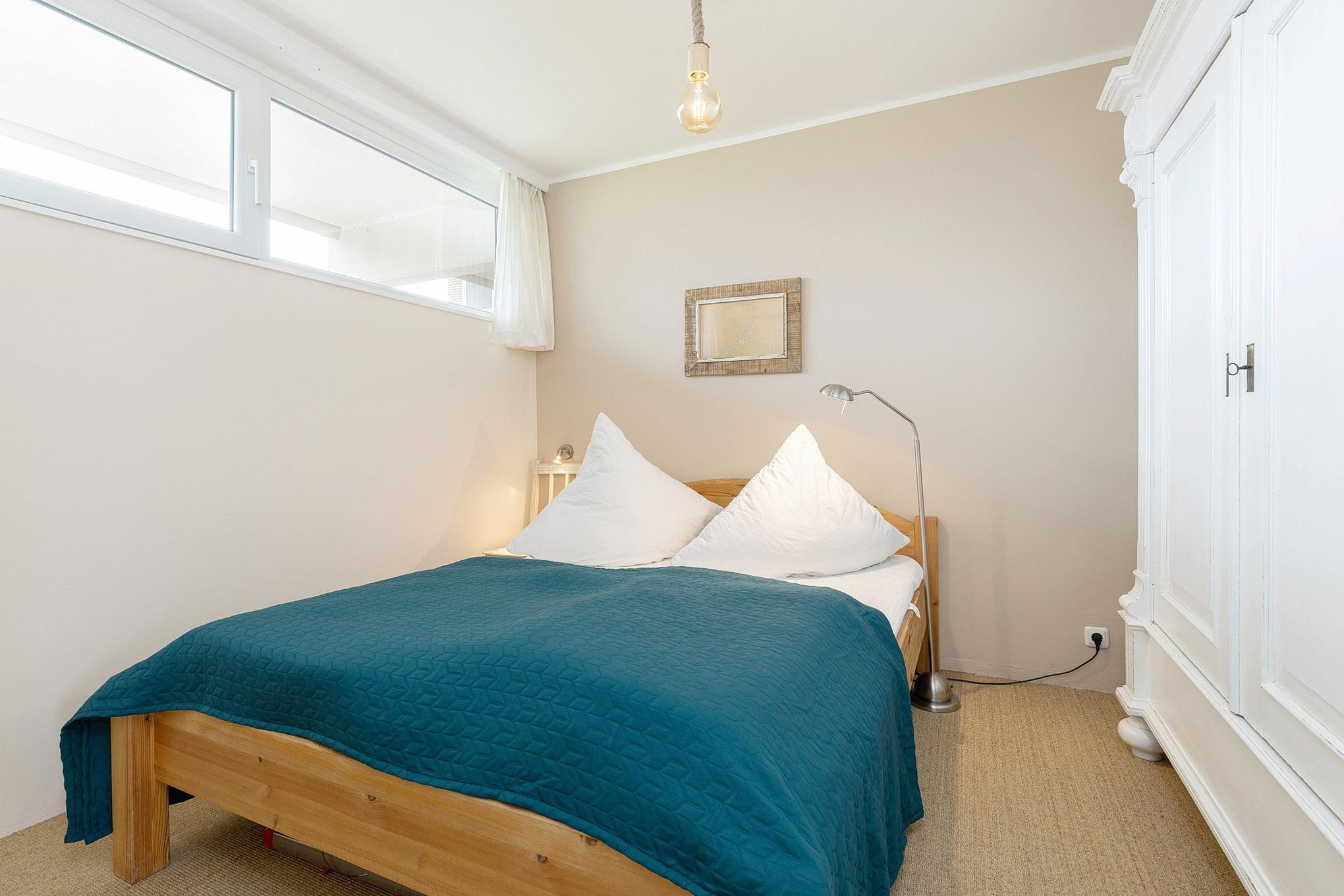 Freundliches, separates Schlafzimmer mit einem Doppelbett und einem Kleiderschrank. Das Schlafzimmer ist mit Teppich ausgelegt. Die schmalen Fenster zum Laubengang lassen sich durch Vorhang ein wenig verdunkeln.