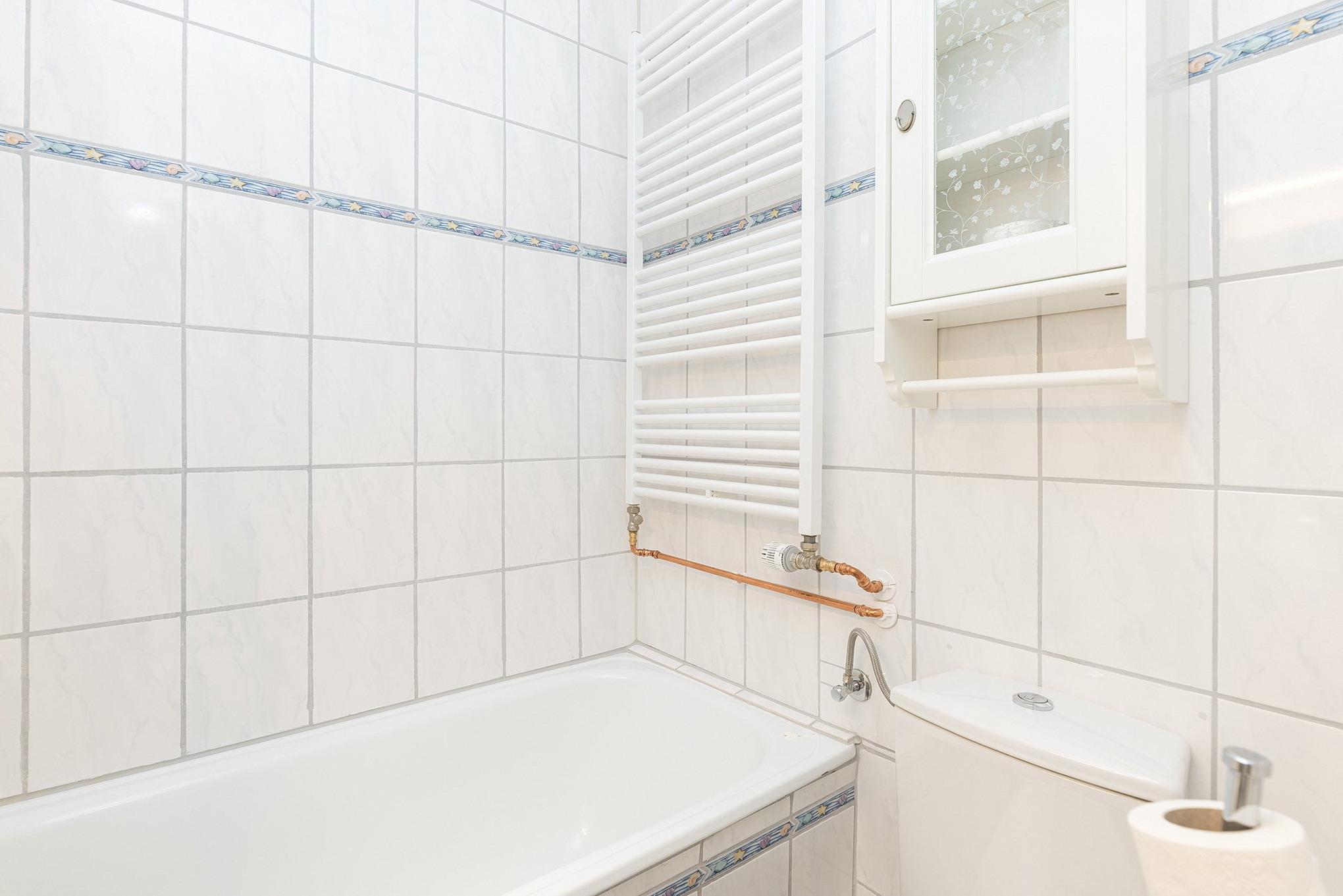 Hell gefliestes, sehr kleines Bad mit Badewanne, WC und Waschbecken.