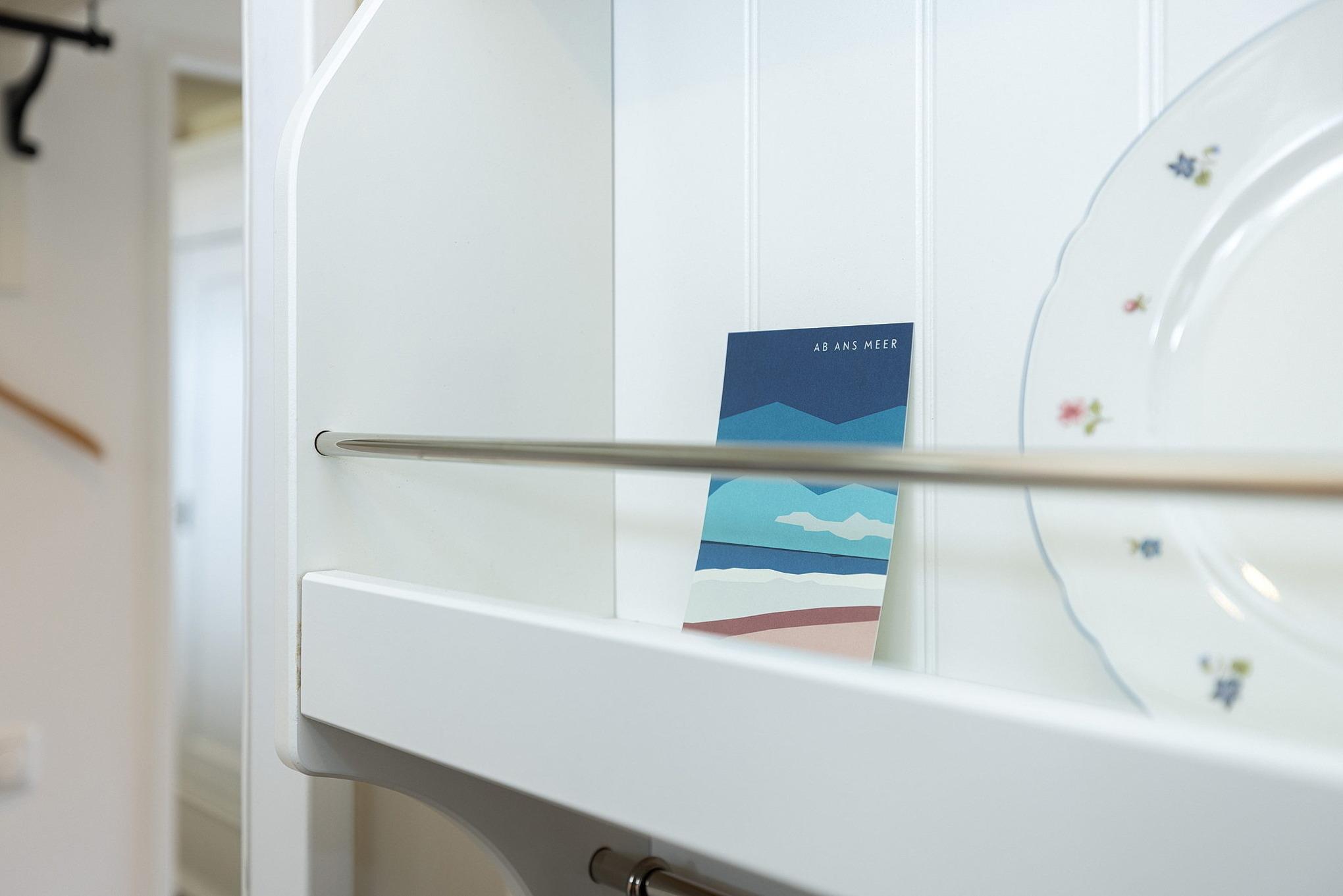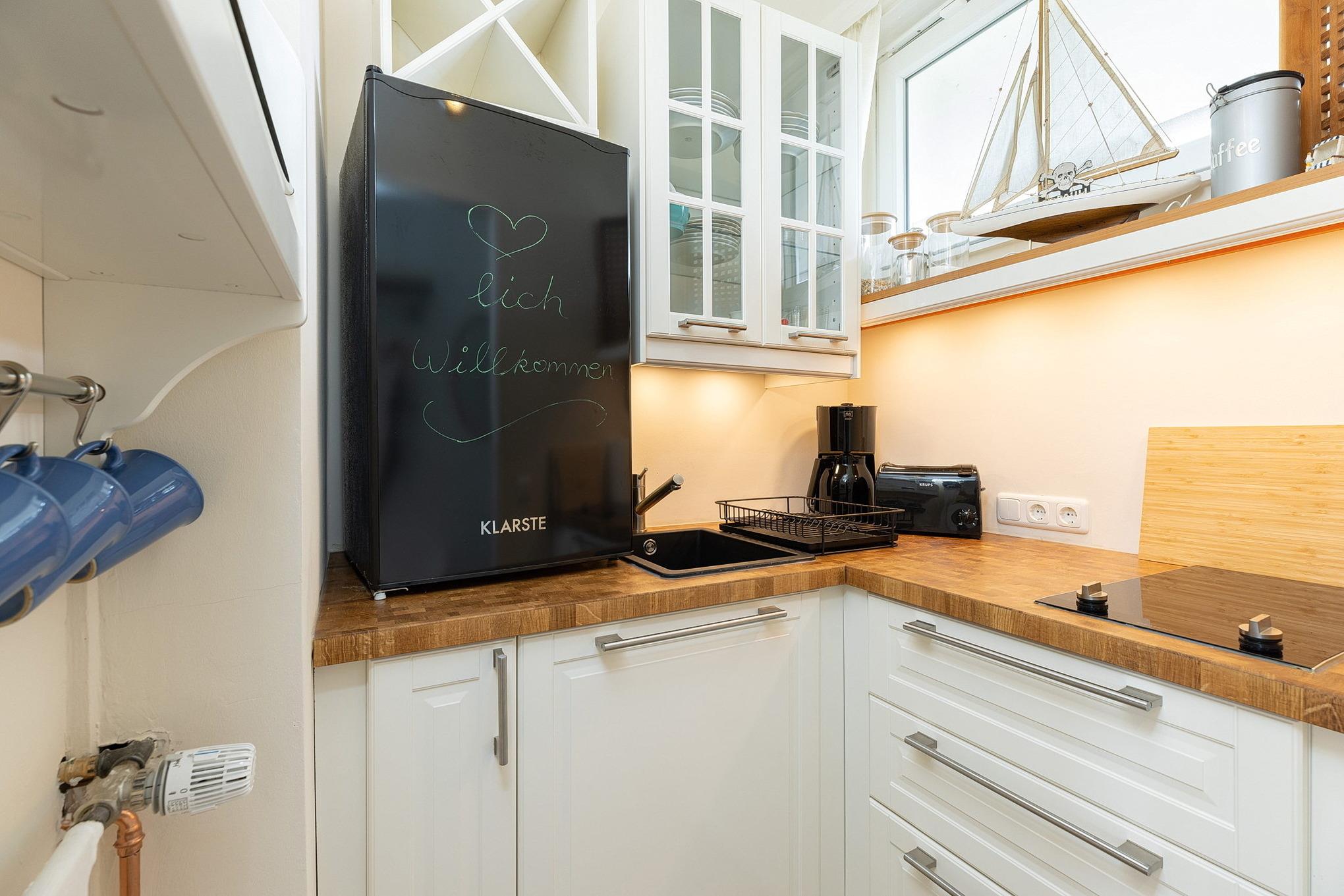 Komplett ausgestattete, kleine offene Küche mit Fenster zum Laubengang. Die Küche ist mit einem 2-Platten Cerankochfeld ausgestattet. Außerdem stehen eine Kaffeemaschine, ein Toaster sowie ein Wasserkocher zur Verfügung.