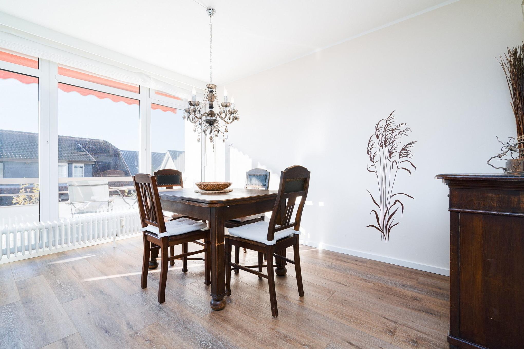 Helles, freundliches Wohn- und Esszimmer mit direktem Zugang zum Balkon. Das Wohn- und Esszimmer ist mit einem Essplatz für 4 Personen, einer Eckcouch (Schlafsofa 140x190cm) und einem Wohnzimmerschrank ausgestattet. Zur Unterhaltung steht ein[nbsp] kleiner Fernseher zur Verfügung. Das Wohn- und Esszimmer ist mit Vinylboden ausgelegt.