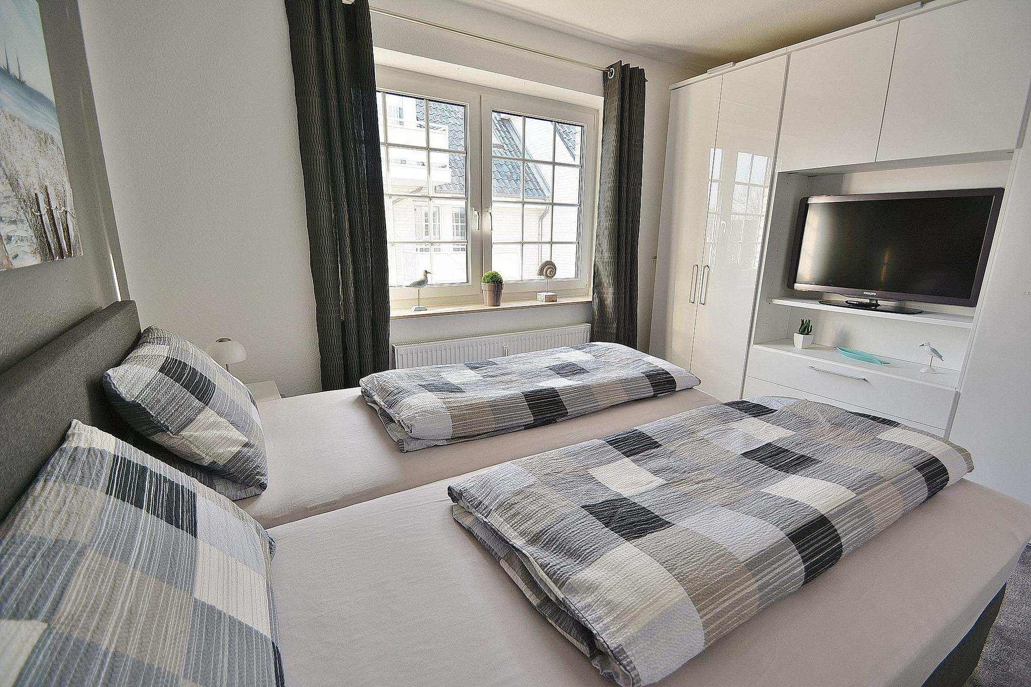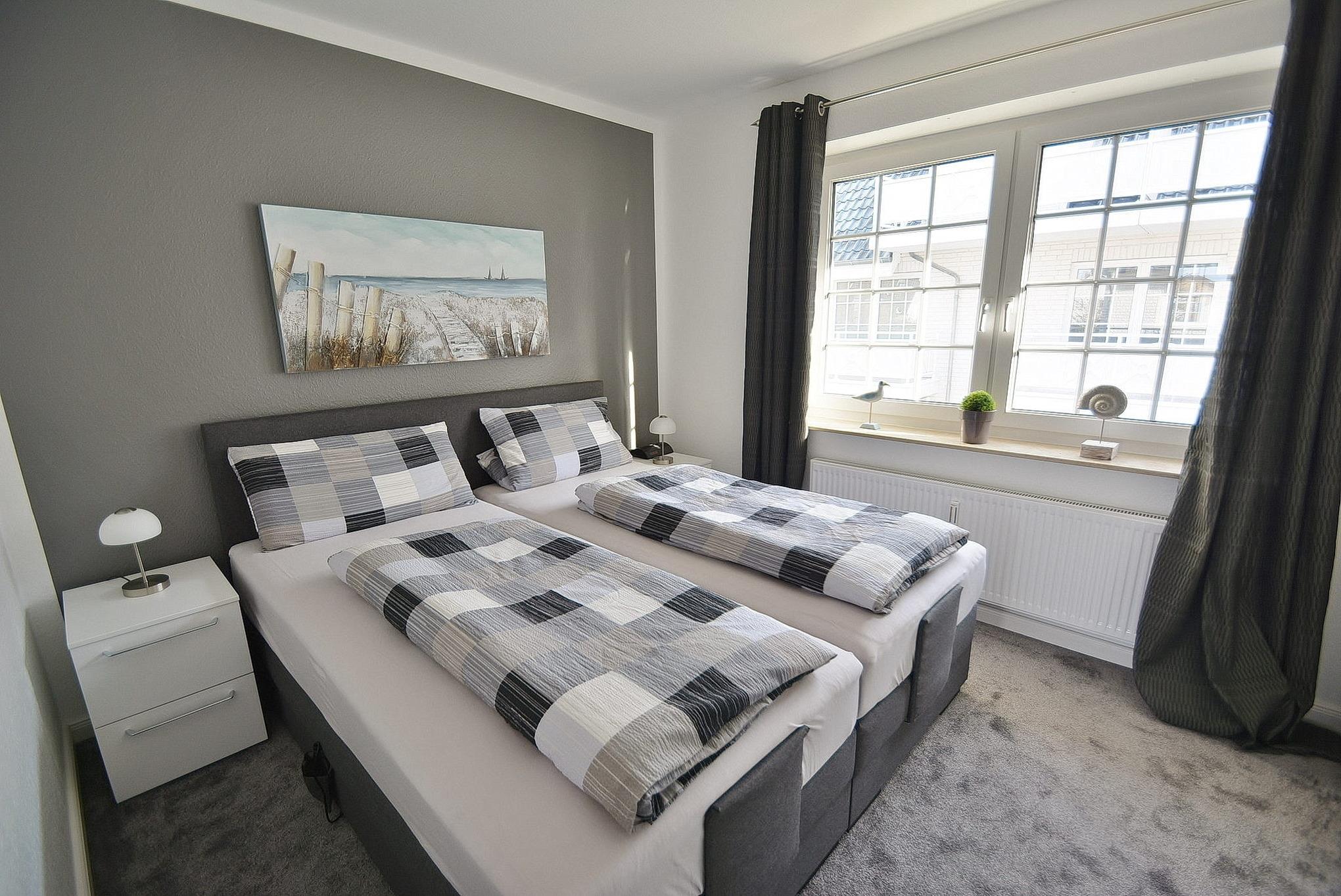 Im 1. Schlafzimmer befindet sich ein komfortables Ehebett, Kleiderschrank und das Schlafzimmer ist mit Auslegware versehen. Das Fenster lässt sich durch einen Außenrolladen vollständig verdunkeln.