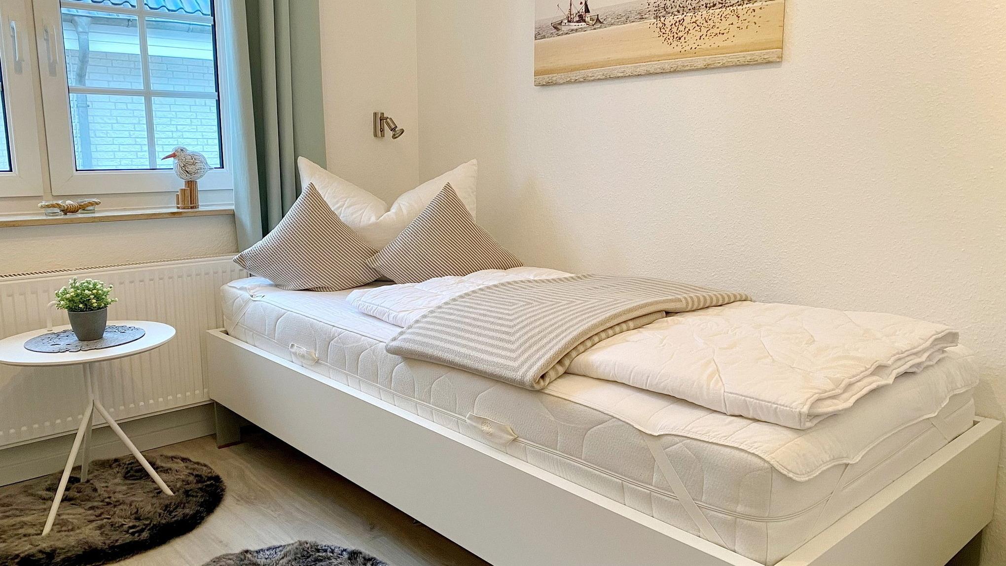 Im 2. Schlafzimmer befindet sich ein Einzelbett, ein Kleiderschrank und der Raum ist mit Planken ausgelegt. Das Fenster lässt sich durch einen Außenrolladen vollständig verdunkeln