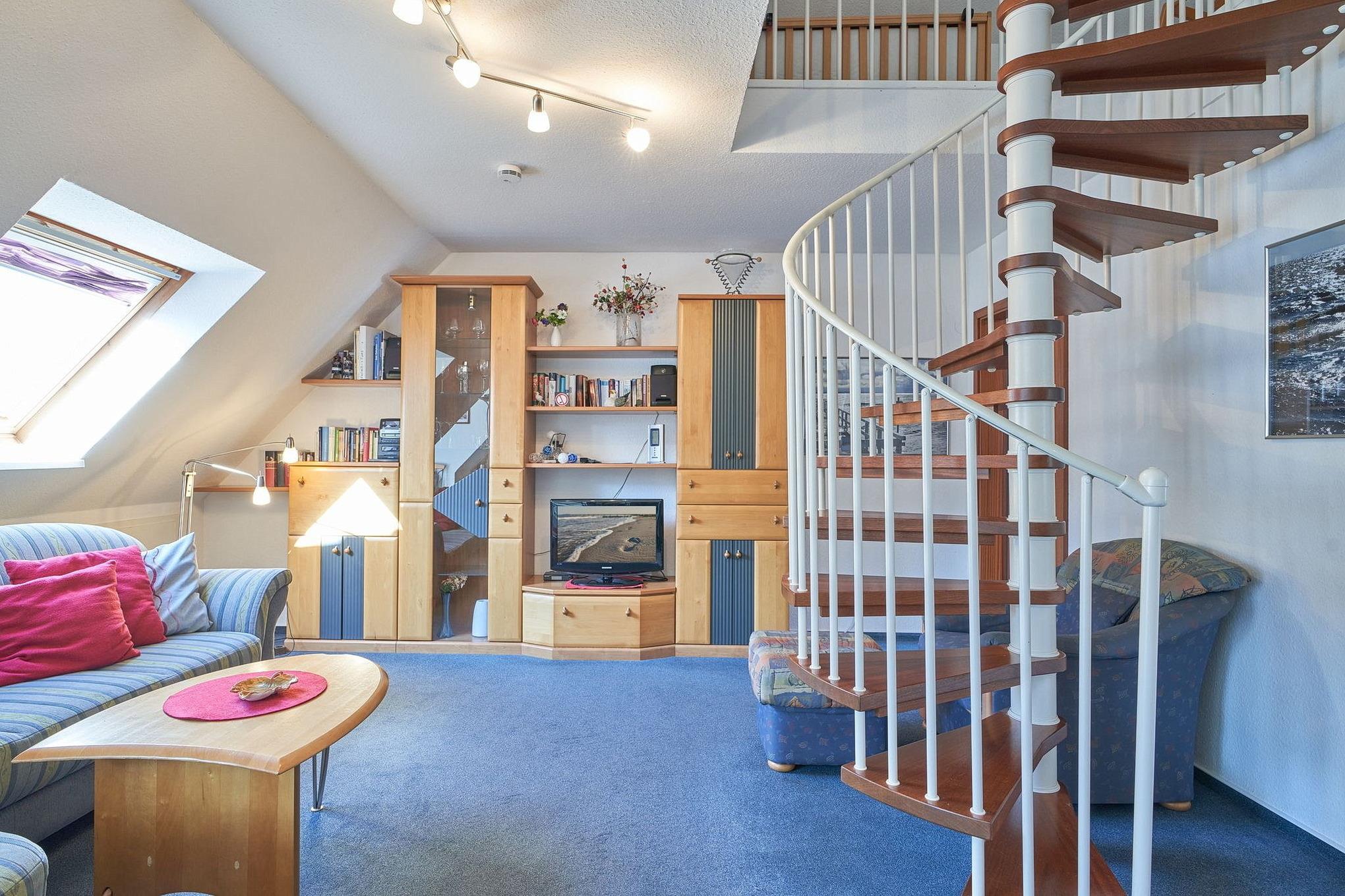 Der Schlafbereich im Spitzboden der 3. Etage ist über eine Wendeltreppe erreichbar. Der Schlafbereich ist mit 2 Einzelbetten (90x200cm), einem 1-türigen Kleiderschrank und zwei Kommoden ausgestattet. Der Schlafbereich ist mit Teppichboden ausgelegt; die Dachfenster lassen sich durch Innenrollos etwas verdunkeln.